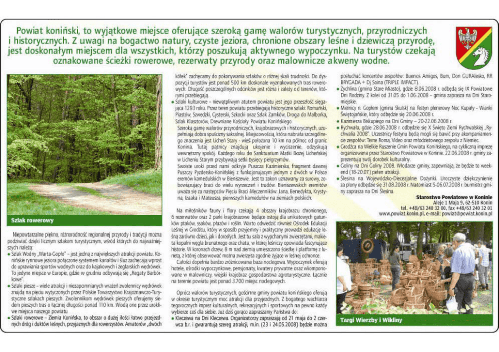Powiat koniński, to wyjątkowe miejsce oferujące szeroką ga mę walorów t urystycznych, przyrodniczych i historycznych. Z uwagi na bogactwo natury, czyste jeziora, chronione obszary leśne i dziewiczą przyrodę, jest doskonałym miejscem dla wszystkich, którzy poszukują aktywnego wypoczynku. Na turystów czekają oznakowane ścieżki rowerowe, rezerwaty przyrody oraz malownicze akweny wodne. kółek" zachęcamy do pokonywania szlaków o różner skali trudnoio. Oo d)'Y poiytji tU1)'StóW jest ponad 500 km doil<onale wyznakowa~ch tras •Owe<owych. Długo!l jl052czegótnych odónkóW jest r&na i zalety od terenów. kl<!rymi puebiegają. • Szlaki kulturowe • niewątphwym atutem powiaru jest iego p.rzes.ztośt sięga· ją"1 1293 roku Prm teren pm"1tu puebiegają historyone szlaki; P.omański, Piastów, Szwedzki. C)'Stersti, Szkocki O<az Szlak zamków, D1oq~ do Malborka, Szłak K!aszto,ów. 01ewniane );'.'.~ PO\,iaru Konińskiego. S.iroką gamę walorów priytodniCly(h, krajobrazoW)'Ch i historyQO)(h. uzupełniają dob1a spuśdznysakraln~ . h'.iejscmvoScią, która nabra ła szczególnego zna<ieoia jest Licheń Stary - wieś polorona 10 km na pólnoc od gianit Konina. Tuuj pątnicy znajd ują ukojenie i wycisienie, odzyskują wewnętuny spokój. Kaldego roku do Sanktuali!m Matłi Bożej lkhe!iskiej w Licheniu Starym puybywaJą set~ t)'Sięcy pielgizymów. S1,1,'0iste uroki pued nami odkryje Puszcza Kdzimie1sta, fragment davmfl Pusiczy Pyide~o-Konińskiej ! funkcjonującym jtdnym 1 dwóch w P~ eremó\Y kamedulskich w Bieniszewie. Jest to zakon t1211JWJ11)' za su!OYty. zo.. bovl'iązujący b1ati do \VEolu Vł)'l'reaeń i trud6\v. Bien:5zewskich e1emitów uwata się 1a następców Pięc~ Braci Męczenników Jana. Benedykta, 1<1ystyna, 1zaaka i Mateusia, pieivisiych kamedułów na liemiach polskich. Na miłoSnil<Ó'łi fauny i ftory czekaj.ą 4 obszary krajob1am ch1ooionf90, Niepowtarzalne pięlno. iólnorodno~ reg ~nal nej pzyrody i ttadytji mOina PQdliwiat ~ki licznym 12lablm wrystyonym. "9ód kl<!r)'Ch do na~valniej S>Ych należą: • Szlak Wodny .Warta -Gopło" - je;t jedną zna1vnękS2ych attakqi povnatu. Konińll<ie rynno"e ~ziora potąaone systemem kanaiów i ~Ui zachętają wprost do uprawiania spoM11 wodnych oraz do kajablwych i leglarskich 11~dró11ek To iedyne mi?jsce w Europie. gdzie w grudniu odb')'\vają się .Regaty Barbór· kowe". • Szłaki piesze · \Yele atraktji i niezapomnianych \\rażeń zwolennicy\vędrÓ\vek znajdą na pięciu vr/1Y(zonych p"ez Polllóe Towarz)'SIVIO Ktaj<>znawczo-Turystyone szlakach pieS>)m Zwolenniblm "~dró11ek pies>yeh orewjemy siedem piesz)'Ch tras o łącznej dłu go;d ponad 110 km. Wiodą one P"" uroki" we m1ejsca naszego pmV!atu • Szlaij rowerowe - Z'iemia Konińska, to obll3r o dutej ilo~ ta~'~ pr.ijezdnych dróg i dukl<!w leśnych, Pl2Yiaznych dla rcwe<l)'StóW. Amatorów .Qwóch 6 rerenvatów oraz 2 paiki ba1obraZO\\'e będące OstOJą dla unikatooNYCh gatun· ków pta\&11. ssak6'•. płazów i ro;lin warto odwiediil row!l\!t 05iodek Eduka<j1 Leśnej w Ciod!J:u. któiy w sposćb p!?riemny i piaktyczny p1zy11adli edukację leśną ZdrÓ\, no dzieci, jak i dOłosłych. Jest ru sala z "'YPtharrymi zwierziętam~ makieta kopal.ni węgla b1unatnego oraz chata, v1 któ1ej leSniczy opavńada faSC)11utące h~toiie. Wblronach drzew, 8 mnad ziemią umieszczooo 0.ikę i pła tfoimę z lune1<1. zkl<!r~ 0~1wować moma zwienięta zgodnie l)ją<e w leśn~ ochronce. CałoSd dopełnia bardzo zróżnicowana baza oodegowa Wypoaynel: ofeiUJą hotele, ośrodki ,.,·ypocz)Tlkowe. pensjonaty, kwatery pry11atne oraz \\'komponowane w malowniay, wiejski klajob!az gospO<faos~ agrołul)Styone. (4a7lie na teienie powiatu jest ponad J.700 mi~sc nociego11ych. Oprć<> walO<ów tur~tyonych. go0nne gm"Y powiatu koni ńs1:iego oferują w oktes~ 1u1~lyonym moc auaktji dla pzyjezdnych. Z bogatego wachlarza tegorocmych imprez kulturalnych. 1ekreacyjn)'Ch i spo<tmV)<h na pewno każdy wybierze coS dl.a sieb2. Już d:ziS gorąco zapiaszamy Pańsrn•a do: • Kleczewa na Ofli Kleczewa. Organizatorzy zapasiają od 21 maja do 2 cze1""' b.r. i gwa1anwją 12eieg auakcji m.in. (23 i 24.051008) będzie molna pOoSłuchać blnce11<lw zespołów: Buenos Amigos. Bum, Don GUAAlesl<o, RR BRYGADA + Oj Soila (TRIPLE IMPACl]. • Żychlina (gm.., 5tare Miasto), gdzie 8.06.200l! 1. odbędą się IX Po1\iatowe Om Rodziny. Z kolei od 31.05 do 1.06.1008 - gmina zapraS2a na Om Siaro· mi!)Skie. • ~~etnicy n. Gopłem (gmila Skulsk) na festyn plenero"y Noc Kupaty - Wlallki ŚwiętojaJisl<r, który odbędzie się 20.06.2008 1. • Kazimiefla Biskupiego na Oni Gminy - 20·22.06.200l! r. • Rychwał~ gdlie 28062000 1. odbędz~ się XSvnęto Ziemi Rychwalskiej .Rychwalia 2008". Uczes1nicy res1ynu będą mogli sie ba\\;t pay akompaniamen- cie zespołów: Teme Roma, ~eo oraz młodzieżovlego zespołu z Niemiec. • G1odica na WeO<le Ruszenie Gmin Powiaru Kon1ńs1:iego, na cykliczną imprezę organoowana prze. StaroslVIO Powiatowe w Koninie. 22.06.2008 1. gminy zapre.inniją swój doiobel: kultuoalny. • Goliny na Oni Goliny 2008. Wloda12e gminy. zape\~ą. że będre ro week· end (18·20.07} pełen atraktjt • Stosina na Wojewódzlo-Oie<:Oljalne Dożynki. U rocz~te dzię kczynienie za plony odbędzie się 31.08.2008 r.Natomiasl 5-06 07.2008 1. burmisuz gminy zapasza na Oni Slesina. Starostwo Pl)W'liatowe w Konłr\lie Aleje 1Maja9. 62·5t0 Konin tel. +48/63 240 32 oo. fax +48/63 240 32 01 \YW\\ .povliat.konin.pl, c·mail: pov,[email protected] 1