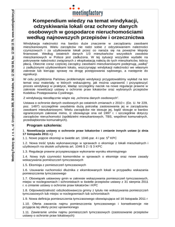 Meeting Factory sp. z o. o., ul. Urzędnicza 39/8, 30-048 Kraków, tel. 12 292 64 84, fax: 12 380 15 79, www.meetingfactory.pl Kompendium wiedzy na temat windykacji, odzyskiwania lokali oraz ochrony danych osobowych w gospodarce nieruchomościami według najnowszych przepisów i orzecznictwa Windykacja należności ma bardzo duże znaczenie w zarządzaniu zasobami mieszkaniowymi. Wielu zarządców nie radzi sobie z odzyskiwaniem należności czynszowych i za użytkowanie lokali przez co naraża się na poważne kłopoty finansowe. Według ostatnich danych 1/3 mieszkańców wszystkich zasobów mieszkaniowych w Polsce jest zadłużona. W tej sytuacji wszystkie wydatki na pokrywanie należności związanych z eksploatacją należą do tych mieszkańców, którzy płacą. Obecnie coraz częściej zarządcy zasobami mieszkaniowymi podejmują „walkę” z zadłużonymi użytkownikami lokalu, wszczynając windykacji należności we własnym zakresie lub kierując sprawę na drogę postępowania sądowego, a następnie do egzekucji. W celu przybliżenia Państwu problematyki windykacji przygotowaliśmy wykład na ten temat oraz materiały, w których wskazujemy, jak można usprawnić i przyspieszyć proces windykacji w praktyce, kładąc szczególny nacisk na nowe regulacje prawne w zakresie nowelizacji ustawy o ochronie praw lokatorów oraz wybranych przepisów Kodeksu Postępowania Cywilnego. Z windykacją nieodłącznie wiąże się „ochrona danych osobowych”. Ustawa o ochronie danych osobowych po ostatnich zmianach z 2010 r. (Dz. U. Nr 229, poz. 1497) szczególnie uwydatnia dużą potrzebę zastosowania jej w zarządzaniu zasobami mieszkaniowymi. Wielu zarządców nie stosuje jej, bądź stosuje w bardzo ograniczonym zakresie mimo, iż obowiązuje ona od 1997 r. i szczególnie dotyczy zarządców nieruchomości (spółdzielni mieszkaniowych, TBS, wspólnot komunalnych, przedsiębiorstw komunalnych). Program szkolenia: 1. Nowelizacja ustawy o ochronie praw lokatorów i zmianie innych ustaw (z dnia 17 listopada 2011 r.) 1.1. Nowe pojęcie eksmisji w świetle art. 1046 par. 4 i par. 51 KPC 1.2. Nowa treść tytułu wykonawczego w sprawach o eksmisje z lokali mieszkalnych i użytkowych na skutek uchylenia art. 1046 § 2 i § 3 KPC 1.3. Regulacje prawne przyspieszające wykonanie wyroku eksmisyjnego 1.4. Nowy tryb czynności komorników w sprawach o eksmisje oraz nowe zasady wskazywania pomieszczeń tymczasowych 1.5. Eksmisja z pomieszczeń tymczasowych 1.6. Usuwanie ruchomości dłużnika z eksmitowanych lokali w przypadku wskazania pomieszczenia tymczasowego 1.7. Obowiązek ustawowy gmin w zakresie wskazywania pomieszczeń tymczasowych, miejsc w noclegowniach i schroniskach w świetle przepisów ustawy z 31 sierpnia 2011 r. o zmianie ustawy o ochronie praw lokatorów i KPC 1.8. Odpowiedzialność odszkodowawcza gminy z tytułu nie wskazywania pomieszczeń tymczasowych lub miejsc w noclegowniach lub schroniskach 1.9. Nowa definicja pomieszczenia tymczasowego obowiązująca od 16 listopada 2011 r 1.10. Oferta zawarcia najmu pomieszczenia tymczasowego i konsekwencje nie przyjęcia tej oferty przez uprawnionego 1.11. Zawieranie umów najmu pomieszczeń tymczasowych (zastosowanie przepisów ustawy o ochronie praw lokalowych) Meeting Factory sp. z o. o., ul. Urzędnicza 39/8, 30-048 Kraków, tel. 12 292 64 84, fax: 12 380 15 79, www.meetingfactory.pl 2. Rozporządzenie Ministra Sprawiedliwości z dnia 22 grudnia 2011 r. w sprawie szczegółowego trybu postępowania w sprawach o opróżnienie lokalu lub pomieszczenia albo o wydanie nieruchomości (opublikowane w styczniu 2012 r.) 3. Nowelizacja Kodeksu postępowania cywilnego – przyspieszenie odzyskiwania lokali po licytacji prawa własności art. 791 kpc art. 991 § 1 kpc przepisy przejściowe 4. Ochrona danych osobowych 4.1. Przepisy obowiązujące 4.2. Ogólne zasady ochrony danych osobowych 4.3. Ochrona danych osobowych pracowników i mieszkańców 4.4. Kontrole i lustracje a ochrona danych osobowych 4.5. Windykacja należności a ochrona danych osobowych 4.1. Odpowiedzialność prawna za naruszenie przepisów ustawy o ochronie danych osobowych 5. Windykacja należności 5.1. Czynności przygotowawcze – przedsądowe 5.2. Określenie dłużnika 5.3. Wezwania, upomnienia i ich doręczanie 5.4. Ugody przed sądem i pozasądowe 5.5. Zobowiązania objęte aktami notarialnymi 5.6. Określenie wartości zobowiązania 5.7. Przedawnienie roszczeń 6. Postępowanie sądowe 6.1. Wybór postępowania i jego koszty 6.2. Opłaty sądowe 6.3. Właściwość sądu 6.4. Postępowanie pojednawcze 6.5. Postępowanie o nadanie klauzuli wykonalności ugodzie sądowej 6.6. Postępowanie o nadanie klauzuli wykonalności aktowi notarialnemu 6.7. Postępowanie zabezpieczające 6.8. Postępowanie nakazowe z weksla 6.9. Postępowanie upominawcze 6.10. Postępowanie nakazowe zwykłe 6.11. Postępowanie zwykłe 6.12. Postępowanie uproszczone 6.13. Klauzula wykonalności 6.14. Tytuł wykonawczy w sprawach o eksmisję z lokali mieszkalnych i lokali użytkowych, w następstwie uchylenia art. 1046 par. 2 i 3 kpc. Meeting Factory sp. z o. o., ul. Urzędnicza 39/8, 30-048 Kraków, tel. 12 292 64 84, fax: 12 380 15 79, www.meetingfactory.pl 7. Postępowanie egzekucyjne 7.1. Wniosek egzekucyjny 7.2. Opłaty komornicze 7.3. Właściwość komornika 7.4. Kontrolowanie skuteczności działania komornika oraz sposoby mobilizowania komornika 7.5. Postępowanie egzekucyjne z nieruchomości a) właściwość komornika b) wnioski składane do komornika - wniosek o opis i oszacowanie - wniosek o wyznaczenie licytacji - wniosek o wyznaczenie drugiej licytacji c) postanowienia sądu o przybiciu i przysądzeniu nieruchomości d) przejęcie nieruchomości przez wierzyciela 7.6. Nowe zasady eksmisji z lokalu mieszkalnego 8. Zagadnienia kontrowersyjne w windykacji i egzekucji, rozwiązywanie ich w praktyce. 8.1. Zarzut przedawnienia 8.2. Dochodzenie wierzytelności wobec dłużników, kt
