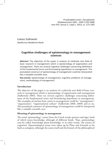 Przedsiębiorczość i Zarządzanie Wydawnictwo SAN – ISSN 1733-2486 tom XIV, zeszyt 5, część I, 2013, ss. 271–282 Łukasz Sułkowski Społeczna Akademia Nauk Cognitive challenges of epistemology in management sciences Abstract: The objective of the paper is analysis of relatively new field of basic research in management which is epistemology of organization and management. There are several cognitive challenges concerning definitions of the fundamental terms and formulating hypotheses in management. The postulated construct of epistemology of management could be interpreted like a valuable scientific area. Key-words: epistemology of management, cognitive problems of management, methodology of management. Introduction The objective of the paper is an analysis of a relatively new field of basic research in management which is epistemology of organization and management [Sułkowski 2005]. There are several cognitive challenges concerning definitions of the fundamental terms and formulating hypotheses in management. The examples of unclear basic terms in management could be: “management”, “organization”, “organizational culture” [Sułkowski 2008, 2009] and so on. The postulated construct of epistemology of management could be interpreted like a valuable scientific area. Meaning of epistemology in management The word ‘epistemology’ comes from the Greek words episteme and logos, both of which mean knowledge, although of different kinds. Thus, epistemology may be called ‘knowledge about knowledge’ or in other words, ‘the science of cognition’. Epistemological issues were taken up by Plato and Aristotle as far back as antiquity, although the name itself and the branch of the philosophical 272 Łukasz Sułkowski discourse it covered were not developed until the beginning of the 20th century. However, philosophy is not an empirical science and undertakes discourse on the highest level of generalisation, which often makes it more difficult to draw conclusions concerning the detailed disciplines of the science. Under the influence of the development of the science of philosophy and empirical sciences, the basic epistemological issues of getting to know reality stopped being the sole domain of philosophical discourse [Auroux, Weil 1991, p. 74]. Representatives of all the sciences undertake epistemological and methodological reflections, allowing them to shape the directions of the development of their cognitive discourse. The comprehensiveness and extensiveness of the research issues of all modern sciences require the selection of valuable threads, leading to significant cognitive and practical results. The critical cognitive reflection is especially needed in the case of social sciences dealing with complex scientific problems which do not offer clear criteria for measuring the epistemological value. Thus, it seems that in the case of management science, it is worth undertaking discussion about significant cognitive questions of a general nature, such as defining the essence of an organisation and management, the significance of theory, or the insight specificity of management’s scientific methods [Sułkowski 2012]. Formulating the neopragmatic approach, R. Rorty declares the ‘ruin’ of epistemology. He suggests that the concept of general cognitive theory itself is pointless, as it is based on the questioned assumption that cognition is a reflection of reality [Rorty 1999]. Regardless of the postmodernist scepticism about the creation of the ‘great illusion’ of the meta-theory of cognition, the cognitive value of epistemological analyses is in the critical view of the results of inquiries and research in all scientific disciplines. Perhaps the crisis of epistemology on a general level is even a premise to move the cognitive reflections to the level of detailed disciplines. By placing the paradigm on the discipline level, T.S. Kuhn introduced the most important cognitive discussions into the detailed sciences, moving the problems previously reserved for epistemology and understood as a branch of philosophy, to the humanities, social sciences and natural science [Kuhn 1968]. Failures of the attempts to find the cognitive foundations – the universals of cognition and science – led to a moving of the epistemological discourse to the level of detailed disciplines. But if the area of epistemological problems is not suitable for developing a universal theory of cognition, it is still the space for reflections about cognitive assumptions underlying the development of various disciplines. Epistemology is no longer the meta-theory of cognition, but has become a cognitive self-reflection of the given discipline. The burden of analyses and inquiries is moved to the specialists in the given scientific field or discipline, or even in the given research area. By creating their own discourse, they should be able to leave it aside, criticise, question and Cognitive challenges of epistemology… 273 discover its cognitive assumptions. Thus, the responsibility for the assessment of its cognitive value rests with the researchers in the given field. By treating it this way we move epistemology to each of the detailed disciplines, which entails completely new challenges and results in a mixing of the discourses of the philosophy of cognition with ‘local’ approaches, characteristic of empirical sciences. However, it also means new challenges for researchers who are no longer only empiricists, but have to be philosophers to some extent. Are the deliberations of the epistemology of management only meaningless digressions? Can this area only be barren terra incognita? Epistemology gains the importance of an in-depth reflection of a scientific discipline, concerning its cognitive foundations. It can be a base for the methodological development of social sciences. In this sense, the epistemology of management lies at the meeting point of the cognitive philosophy discourse and 