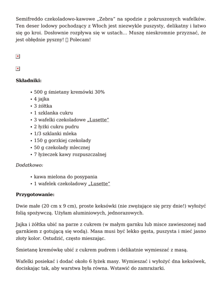 Semifreddo czekoladowo-kawowe „Zebra” na spodzie z pokruszonych wafelków. Ten deser lodowy pochodzący z Włoch jest niezwykle puszysty, delikatny i łatwo się go kroi. Dosłownie rozpływa się w ustach… Muszę nieskromnie przyznać, że jest obłędnie pyszny! Polecam! Składniki: 500 g śmietany kremówki 30% 4 jajka 3 żółtka 1 szklanka cukru 3 wafelki czekoladowe „Lusette” 2 łyżki cukru pudru 1/3 szklanki mleka 150 g gorzkiej czekolady 50 g czekolady mlecznej 7 łyżeczek kawy rozpuszczalnej Dodatkowo: kawa mielona do posypania 1 wafelek czekoladowy „Lusette” Przygotowanie: Dwie małe (20 cm x 9 cm), proste keksówki (nie zwężające się przy dnie!) wyłożyć folią spożywczą. Użyłam aluminiowych, jednorazowych. Jajka i żółtka ubić na parze z cukrem (w małym garnku lub misce zawieszonej nad garnkiem z gotującą się wodą). Masa musi być lekko gęsta, puszysta i mieć jasno złoty kolor. Ostudzić, często mieszając. Śmietanę kremówkę ubić z cukrem pudrem i delikatnie wymieszać z masą. Wafelki posiekać i dodać około 6 łyżek masy. Wymieszać i wyłożyć dna keksówek, dociskając tak, aby warstwa była równa. Wstawić do zamrażarki. Resztę masy podzielić na dwie nierówne części. W rondelku mocno podgrzać mleko, dodać posiekane czekolady i kawę rozpuszczalną. Mieszać aż składniki się połączą, do uzyskania aksamitnej konsystencji. Ostudzić i wymieszać z mniejszą częścią masy. Foremki wyjąć z zamrażarki i wzdłuż keksówki na środku, wylewać na przemian równy pasek masy (po 3-4 łyżki), białej i ciemnej. Ponownie wstawić do zamrażarki na kilka godzin, najlepiej na noc. Przed podaniem posypać kawą mieloną i udekorować posiekanym wafelkiem. Smacznego Nieskomplikowana, rozgrzewająca tajska zupa z białą rybą i makaronem Chow Mein. Do przygotowania zupy użyłam dorsza, ale równie dobrze można użyć innej białej ryby np. mintaja, halibuta, miruny itp. Idealna dla zabieganych, ponieważ robi się ją naprawdę szybko. Składniki: 300 g makaronu Chow Mein około 600 g filetu z dorsza (lub innej białej ryby) 1,75 l bulionu 300 g mleka kokosowego 3-4 łyżeczki czerwonej pasty curry 1 cebula 3 ząbki czosnku 4 listki limonki Kaffir 1 łyżka soku z limonki 1 łyżeczka tartego imbiru 3 łyżki sosu rybnego 1 łyżeczka cukru trzcinowego 2 łyżki oleju sos sojowy do doprawienia zupy (zamiast soli) Przygotowanie: Makaron ugotować według przepisu na opakowaniu. Odcedzić. Na patelni rozgrzać olej, wrzucić posiekaną cebulę i lekko zrumienić. Dodać starty imbir i przeciśnięty przez praskę czosnek. Podsmażyć. W garnku zagotować bulion, dodać zawartość patelni, czerwoną pastę curry, cukier trzcinowy, sos rybny, liście kaffiru, sok z limonki i mleko kokosowe. Wymieszać. Następnie dodać pokrojone filety dorsza. Gotować na małym ogniu (bez przykrycia) przez około 10 minut. Doprawić sosem sojowym i podawać z makaronem. Smacznego Naleśniki nadziewane piersią z kurczaka, czerwoną fasolą, papryką i kukurydzą zapiekane pod warstwą sosu pomidorowego i sera cheddar. W takiej odsłonie na pewno zachwycą niejedno podniebienie Polecam Składniki (na około 10 naleśników): naleśniki z tego przepisu ← Farsz: 3 pojedyncze piersi z kurczaka 1 mała czerwona papryka 3/4 szklanki czerwonej fasoli z puszki (bez zalewy) 1/2 szklanki kukurydzy z puszki (bez zalewy) 1 cebula 1/3 szklanki bulionu 2 łyżki oliwy z oliwek 1 płaska łyżeczka kminu rzymskiego 1 łyżeczka oregano 1 płaska łyżeczka ziaren kolendry szczypta chili 1 łyżka suszonej słodkiej papryki 1 łyżeczka czosnku granulowanego sól pieprz Sos pomidorowy: 1 puszka pomidorów krojonych bez skóry (400 g) 1 mała cebula 2 ząbki czosnku 1 łyżka oliwy z oliwek 1 płaska łyżeczka oregano sól pieprz około 100 g sera cheddar Przygotowanie: Farsz: Na patelni rozgrzewamy oliwę z oliwek. Wrzucamy drobno pokrojone piersi z kurczaka, posiekaną cebulę, utarty w moździerzu kmin rzymski razem z kolendrą, oregano, chili i odrobinę soli. Wszystko lekko rumienimy, dodajemy drobno pokrojoną paprykę, suszony czosnek i paprykę w proszku. Mieszamy i chwilę podsmażamy. Następnie wlewamy bulion i gotujemy na małym ogniu, aż woda odparuje i papryka lekko zmięknie. Dodajemy fasolę i kukurydzę, mieszamy i doprawiamy solą. Sos pomidorowy: Na patelni rozgrzewamy oliwę z oliwek, wrzucamy posiekaną cebulę i lekko rumienimy. Dodajemy przeciśnięty przez praskę czosnek i chwilkę podsmażamy. Następnie dokładamy pomidory z puszki (razem z zalewą) i oregano. Gotujemy na małym ogniu przez około 5 minut. Doprawiamy solą i pieprzem. Na każdy naleśnik nakładamy trochę farszu, zawijamy jak na krokiety i układamy w naczyniu do zapiekania. Całość zalewamy przygotowanym sosem i posypujemy startym serem. Zapiekamy w piekarniku nagrzanym do 180°C przez około 20 minut. Smacznego Dzisiaj zapraszam na lazanię z sosem bolońskim, beszamelem i parmezanem. Zapiekanka jest przepyszna i myślę, że posmakuje każdemu miłośnikowi kuchni włoskiej. Do przygotowania lazanii użyłam gotowych płatów makaronu, których nie trzeba wcześniej gotować (dla ułatwienia ). Przygotowanie sosu bolognese wymaga trochę czasu, ale uwierzcie mi… Warto! Składniki: około 17 płatów makaronu lasagne 180-200 g parmezanu Sos boloński: 500 g mięsa mielonego (wołowo-wieprzowe) 100 g boczku 2 łodygi selera naciowego 1 marchewka 450 g passaty pomidorowej 1 szklanka czerwonego wytrawnego wina 1 szklanka mleka 1 szklanka bulionu 1 cebula 2 łyżki koncentratu pomidorowego 2-3 łyżki oliwy z oliwek 1 łyżka masła sól pieprz Sos beszamelowy: 3 łyżki mąki pszennej 3 szklanki mleka 2 pełne łyżki masła odrobina gałki muszkatołowej sól biały pieprz Przygotowanie: Sos boloński: Na dużej, szerokiej patelni rozgrzać oliwę z oliwek i masło, wrzucić drobno posiekaną cebulę, mięso i drobno pokrojony boczek. Podsmażyć. N