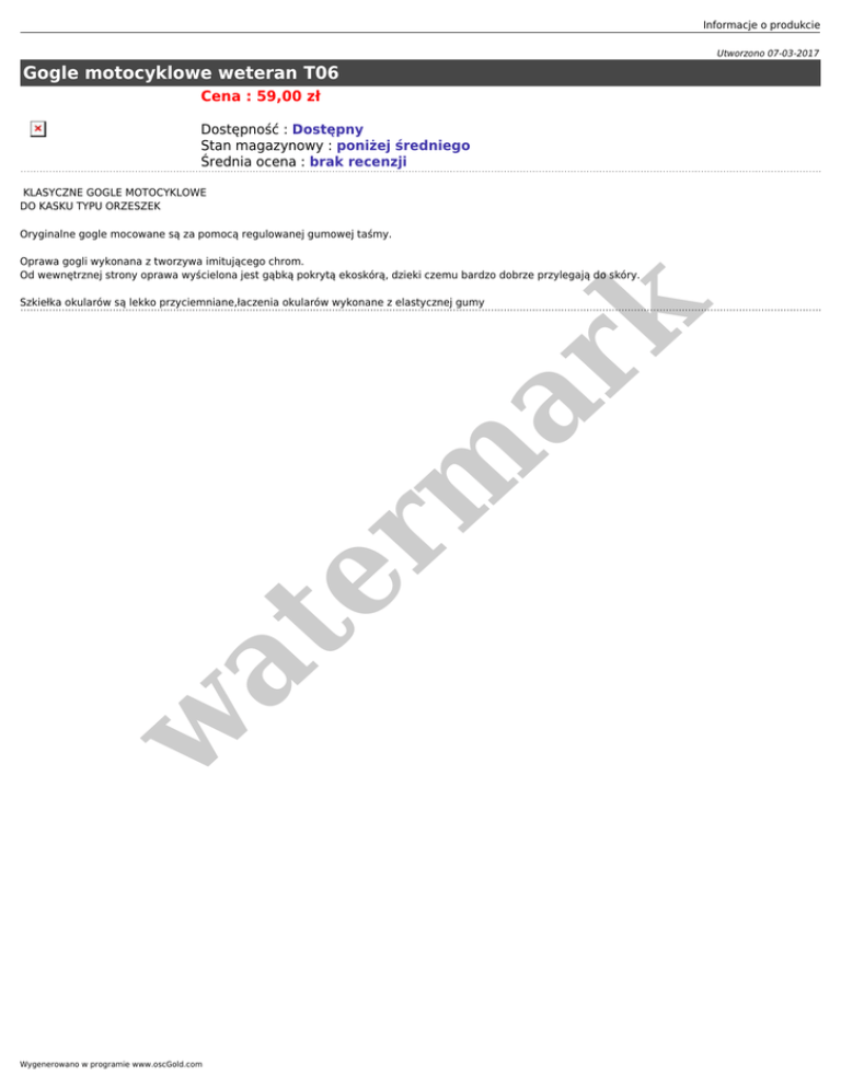 Informacje o produkcie Utworzono 07-03-2017 Gogle motocyklowe weteran T06 Cena : 59,00 zł Dostępność : Dostępny Stan magazynowy : poniżej średniego Średnia ocena : brak recenzji KLASYCZNE GOGLE MOTOCYKLOWE DO KASKU TYPU ORZESZEK Oryginalne gogle mocowane są za pomocą regulowanej gumowej taśmy. Oprawa gogli wykonana z tworzywa imitującego chrom. Od wewnętrznej strony oprawa wyścielona jest gąbką pokrytą ekoskórą, dzieki czemu bardzo dobrze przylegają do skóry. w at er m ar k Szkiełka okularów są lekko przyciemniane,łaczenia okularów wykonane z elastycznej gumy Wygenerowano w programie www.oscGold.com
