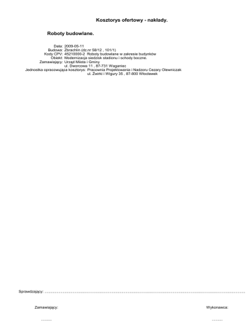 Kosztorys ofertowy - nakłady. Roboty budowlane. Data: Budowa: Kody CPV: Obiekt: Zamawiający: 2009-05-11 Zbrachlin (dz.nr 58/12 , 101/1) 45210000-2 Roboty budowlane w zakresie budynków Modernizacja siedzisk stadionu i schody boczne. Urząd Miista i Gminy ul. Dworcowa 11 , 87-731 Waganiec Jednostka opracowująca kosztorys: Pracownia Projektowania i Nadzoru Cezary Olewniczak ul. świrki i Wigury 35 , 87-800 Włocławek Sprawdzający: ................................................................................................................................................................................................... Zamawiający: Wykonawca: .......... .......... jp-waganiec-trybuny2-z ROZPATRYWAĆ ŁĄCZNIE z DOKUMENTACJĄ. Zuzia (C) DataComp 1994-2009(lic. 11427) Ogólna charakterystyka obiektów lub robót Projektowany budynek zaplecza socjalnego stadionu jest obiektem dwukondygnacyjnym, niepodpiwniczonym, z dachem dwuspadowym, wykonany w technologii tradycyjnej. W budynku przewidziano pomieszczenia tymczasowego pobytu w czasie trwania imprez sportowych i podczas treningów, oraz węzły sanitarne. Wejście do budynku zlokalizowano od strony północnej. Trybuny widowiskowe zaprojektowano jako ogólnodostępne, usytuowane w północnej części działki, wzdłuŜ dłuŜszego boku stadionu, wykonane jako wiata o konstrukcji stalowej (z kształtowników zimnogiętych), obudowana od strony tylnej (brak obudowy w środkowej części wiaty), z dachem jednospadowym. Długość trybun – 48 m, z podziałem na dwie części na 129 osób kaŜda. Poszczególne części trybun zaopatrzone w trzy rzędy zróŜnicowanych wysokościowo ławek, wykonanych z kształtowników stalowych z siedziskami z drewna zabezpieczonego farbami ogniochronnymi. WzdłuŜ dwóch wyŜszych rzędów ławek znajdują się podesty komunikacyjne zakończone schodami pełniącymi równieŜ funkcję drogi ewakuacyjnej. strona nr: 2 jp-waganiec-trybuny2-z ROZPATRYWAĆ ŁĄCZNIE z DOKUMENTACJĄ. Zuzia (C) DataComp 1994-2009(lic. 11427) Tabela elementów scalonych Nazwa elementu 1 Wartość z narzutami ROBOTY BUDOWLANE i ŚLUSARSKIE. strona nr: 3 jp-waganiec-trybuny2-z ROZPATRYWAĆ ŁĄCZNIE z DOKUMENTACJĄ. Zuzia (C) DataComp 1994-2009(lic. 11427) Kosztorys ofertowy - nakłady Opis pozycji podstawy nakładów wyliczenie ilości robót 1 ROBOTY BUDOWLANE i ŚLUSARSKIE. Jedn. Norma Ilość Cena Wartość Robocizna Materiały Sprzęt 1 KNR 201/310/2 Wykopy ciągłe lub jamiste ze skarpami o szerokości dna do 1.5·m ze złoŜeniem urobku na odkład, wykopy o głębokości do 1.5·m, kategoria gruntu III 12,6 m3 Razem robocizna r-g 2,3016 29,000 2 KNR 202/1101/3 (2) Podkłady, murarskie na podłoŜu gruntowym, zaprawa cementowa, podkład z tłucznia 12,6 m3 Razem robocizna r-g 5,92 74,592 Gruz ceglany m3 1,08 13,608 Zaprawa cementowa M12 (m.80) m3 0,2 2,520 Materiały inne (Materiały) % 1,5 3 KNR 202/218/1 (1) Schody Ŝelbetowe, stopnie betonowe zewnętrzne i wewnętrzne na gotowym podłoŜu, transport betonu taczkami, japonkami 3,969 m3 Razem robocizna r-g 23,12 91,763 Beton zwykły B-10 (C8/C10) m3 1,02 4,048 Deski iglaste obrzynane klasa III, grubości 25·mm m3 0,069 0,274 Drewno na stemple budowlane, okrągłe iglaste - korowane m3 0,006 0,024 Gwoździe budowlane okrągłe gołe kg 1 3,969 Materiały inne (Materiały) % 1,5 Środek transportowy (1) m-g 0,08 0,318 4 KNR 202/1914/4 Zatarcie powierzchni betonu na gładko - ANALOGIA (na ostro) 25,52 m2 krotność=0,8 = 0,8 Razem robocizna r-g 0,0663 1,354 Zaprawa cementowa M12 (m.80) z dodatkami uszczelniającymi m3 0,001 0,020 Materiały inne (Materiały) % 1,5 5 KNR 205/208/2 Konstrukcje podparć zawieszeń i osłon, masa do 10·kg 1,571 t Razem robocizna r-g 134,7 105,806 Konstrukcja stalowa z kształtowników zabezp. antykorozyjnie (rury kwadratowe 50x50x3mm) kg 1 020 1 602,420 Farba olejna do gruntowania przeciwrdzewna miniowa 60% dm3 0,19 0,298 Elektrody stalowe do spawania stali węglowej i niskostopowej, 3.25·mm, ER346 szt 25 39,275 Tlen techniczny spręŜony m3 1,8 2,828 Acetylen techniczny - rozpuszczony kg 0,6 0,943 Spawarka elektryczna wirująca 300 A m-g 15,4 24,193 6 KNR 401/1212/1 Malowanie farbą olejną elementów metalowych, powierzchnie pełne, szpachlowane 1-krotnie, 1-krotne 76,45 m2 Razem robocizna r-g 0,41 31,345 Benzyna do lakierów dm3 0,024 1,835 Farba olejna nawierzchniowa ogólnego stosowania dm3 0,103 7,874 Kit szpachlowy olejno-Ŝywiczny dm3 0,083 6,345 Papier ścierny elektrokorundowy w arkuszach szt 0,56 42,812 Materiały inne (Materiały) % 2 7 KNR 223/501/4 MontaŜ elementów widowni, montaŜ listew siedzeń drewnianych 516,0 m Razem robocizna r-g 0,0847 41,738 Deski iglaste strugane jednostronnie klasa II, grubości m 1,05 541,800 28-45·mm (110x32mm) Śruby ciesielskie ocynk 6x45mm szt 1 516,000 Środek impreg-grzybobój.solny np. lub równowaŜny "FOBOS kg 0,08 41,280 M-4" Materiały inne (Materiały) % 0,5 strona nr: 4