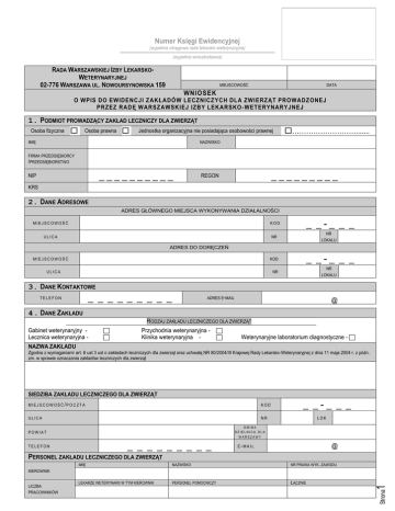 Numer Księgi Ewidencyjnej (wypełnia okręgowa rada lekarsko weterynaryjna) --------------------------------------------------------------------------------------------------------------------------------------------------------------------------------- (wypełnia wnioskodawca) RADA WARSZAWSKIEJ IZBY LEKARSKOWETERYNARYJNEJ 02-776 WARSZAWA UL. NOWOURSYNOWSKA 159 MIEJSCOWOŚĆ DATA WNIOSEK O WPIS DO EWIDENCJI ZAKŁADÓW LECZNICZYCH DLA ZWIERZĄT PROWADZONEJ PRZEZ RADĘ WARSZAWSKIEJ IZBY LEKARSKO-WETERYNARYJNEJ 1. PODMIOT PROWADZĄCY ZAKŁAD LECZNICZY DLA ZWIERZĄT Osoba fizyczna Osoba prawna Jednostka organizacyjna nie posiadająca osobowości prawnej IMIĘ ………………………....... NAZWISKO FIRMA PRZEDSIĘBIORCY /PRZEDSIĘBIORSTWO __________ NIP _________ REGON KRS 2. DANE ADRESOWE ADRES GŁÓWNEGO MIEJSCA WYKONYWANIA DZIAŁALNOŚCI MIEJSCOWOŚĆ KOD ULICA NR _ _-_ _ _ NR LOKALU ADRES DO DORĘCZEŃ MIEJSCOWOŚĆ _ _-_ _ _ KOD ULICA NR LOKALU NR 3. DANE KONTAKTOWE _________ TELEFON ADRES E-MAIL @ 4. DANE ZAKŁADU RODZAJ ZAKŁADU LECZNICZEGO DLA ZWIERZĄT Gabinet weterynaryjny Lecznica weterynaryjna - Przychodnia weterynaryjna - Klinika weterynaryjna Weterynaryjne laboratorium diagnostyczne - NAZWA ZAKŁADU Zgodna z wymaganiami art. 6 ust 3 ust o zakładach leczniczych dla zwierząt oraz uchwałą NR 80/2004/III Krajowej Rady Lekarsko-Weterynaryjnej z dnia 11 maja 2004 r. z późn. zm. w sprawie oznaczania zakładów leczniczych dla zwierząt SIEDZIBA ZAKŁADU LECZNICZEGO DLA ZWIERZĄT MIEJSCOWOŚĆ/POCZTA KOD ULICA NR _ _-_ _ _ LOK GMINA DZIELNICA DLA WARSZAWY POWIAT _________ TELEFON @ E-MAIL PERSONEL ZAKŁADU LECZNICZEGO DLA ZWIERZĄT IMIĘ NAZWISKO NR PRAWA WYK. ZAWODU LEKARZE WETERYNARII W TYM KIEROWNIK PERSONEL POMOCNICZY ŁĄCZNIE Strona LICZBA PRACOWNIKÓW 1 KIEROWNIK 5. ZAŁĄCZNIKI DO WNIOSKU: - Regulamin zakładu leczniczego dla zwierząt. - Informacja o zakresie świadczonych usług weterynaryjnych. - Oświadczenie podmiotu prowadzącego zakład o kompletności i spełnianiu przez zakład leczniczy dla zwierząt wymogów określonych w ustawie i rozporządzeniach. - Aktualne zaświadczenie o prawie wykonywania zawodu kierownika zakładu leczniczego dla zwierząt. - Wydruk z CEIDG lub wypis z Krajowego Rejestru Sądowego. 6. PODPIS WNIOSKODAWCY / OSOBY UPOWAŻNIONEJ DO REPREZENTOWANIA PRZEDSIĘBIORCY Strona 2 W PRZYPADKU OSOBY UPRAWNIONEJ DO REPREZENTOWANIA WNIOSKODAWCY NALEŻY PODAĆ PEŁNIONĄ FUNKCJĘ