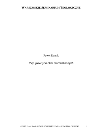 WARSZWSKIE SEMINARIUM TEOLOGICZNE Paweł Romik Pięć głównych ofiar starozakonnych © 2007 Paweł Romik @ WARSZAWSKIE SEMINARIUM TEOLOGICZNE 1 WARSZWSKIE SEMINARIUM TEOLOGICZNE PIĘĆ GŁÓWNYCH OFIAR WPROWADZENIE Ofiary jako podstawa kultowa występuje w prawie każdej religii świata. Ofiary też stanowiły podstawę kultu wszystkich religii, które były przed objawieniem się Boga Abrahamowi i Mojżeszowi oraz przed objawieniem synajskim, gdzie rozpoczął się usystematyzowany kult JHWH, a którego fundamentem były ofiary. Wielu badaczy uważa, że ofiary izraelskie mają rodowód w innych religiach czy innych systemach kultowych, wcześniejszych lub równoległych do systemu ofiar izraelskich1. Można zauważyć podobieństwo do ofiar innych grup etnicznych, jak Arabowie, Mezoptamczycy, Hetyci, Fenicjanie, Egipcjanie, Kartagińczycy, Grecy. Podobieństwo to jest najbardziej zauważalne przy ofierze całopalnej i ofierze biesiadnej, które są najstarszymi ofiarami izraelskimi2. Jednak podobieństwo to, nie jest na tyle wyraźne, aby mogło być jedno znaczne. Ofiary izraelskie mają nad wyraz inny ryt krwi, który jest bardzo bogaty i konieczny przy składaniu ofiar3. Ofiary w Starym Testamencie są widoczne w całej jego ciągłości, były składane przez patriarchów, sędziów, królów i proroków. Ofiary były głównym sposobem oddawania hołdu Bogu, każdy poważny czciciel JHWH przynosił je przed Jego oblicze. Ofiara wskazywała na stan duchowy człowieka, jego odniesienie do Stwórcy, tęsknotę za Nim, pragnienie Jego obecności. Ofiara była wyrazem wdzięczności wobec Boga, a także skruchy. Ofiara była sposobem komunikowania się z Bogiem4. Z upływem czasu ofiary zaczęły być nie właściwie postrzegane, w sposób, w jaki Bóg tego nie zaplanował. Krytykę takich praktyk możemy odnaleźć w księgach prorockich, którzy ganili bezduszne wykonywanie nakazów kultowych, bez odpowiedniego nastawienia serca5 (por. 1 Sm 15, 22; Oz 6, 6, Am 5, 22; Mich 6, 6-8). Ofiary w Starym testamencie dzielono przede wszystkim na ofiary krwawe i na ofiary bezkrwawe. Ofiar dzielono także na ofiary całopalne i nie całopalne, czyli ze względu na ryt, 1 The International Standard Bible Encyklopedia, red. G. Bromiley, T-IV, Grand Rapids, Michigan 1988, s. 264. S. Łach, Rozwój ofiar w religii starotestamentowej, „Sprawy biblijne”, Zeszyt XXIV, Poznań-WarszawaLublin 1970, s. 5-18. 3 E. Król, Ofiary Starego zakonu, a idea ofiary Krzyża, Kraków 1931, s.13-17. 4 S. Wypycha, Wprowadzenie w myśl i wezwanie ksiąg biblijnych. 1. Pięcioksiąg, Warszawa 1987, s.124. 5 M. Uglorz, Jahwe – Bóg Izraela, Warszawa 2002, s. 54. 2 © 2007 Paweł Romik @ WARSZAWSKIE SEMINARIUM TEOLOGICZNE 2 WARSZWSKIE SEMINARIUM TEOLOGICZNE oraz dzielono je ze względu na rolę, jaką miały spełniać, tzn. ofiary uwielbienia, przebłagania, przyjaźni6. Ofiary składano w Przybytku JHWH. Na początku był to namiot, a od czasów króla Salomona budynek świątynny. Na dziedzińcu Przybytku, pierwszym obiektem kultowym był ołtarz całopaleń, na nim składano pięć głównych ofiar. Każdy, kto wchodził do Przybytku, nie mógł przejść dalej, nie przechodząc obok tego ołtarza. Ołtarz całopaleń przypominał skrzynię, rozmiarów 2,5 metra na długość i szerokość i 1,5 metra w zwyż. Na swoich rogach, miał specjalnie zrobione wystające rogi, które były istotnym elementem tej kultowej konstrukcji7. Był zrobiony z drzewa akacjowego, obitego miedzianą blachą. Aby ołtarz całopaleń, jako dzieło rąk ludzkich, mógł spełniać funkcję, do której był przeznaczony, musiał być oczyszczony krwią ofiary8. Krew był istotnym elementem w systemie ofiarniczym to, dzięki niej wszystko oczyszczano zarówno z grzechu jak i nieczystości kultowej, a także dzięki niej ustanawiano Przymierza (por. Hbr 9, 22; Kpł 17, 11; Hbr 9, 19; Wj 24, 1nn). Krew jako siedlisko życia, stanowiła wykup. Człowiek, gdy zgrzeszył był winny i tylko krewżycie mogło go wykupić, mogła to być zastępcza krew zwierzęcia ofiarnego. Krew była również środkiem pojednawczym, między człowiekiem, a Bogiem9. Dlatego tak ważny był ryt krwi przy ofiarach. Krew wylewano u podstawy ołtarza, mazano jego rogi, kropiono krwią zasłonę Najświętszego Miejsca. Krew na rogach ołtarza całopalenia, czy kadzidlanego była symbolem oczyszczenia ofiarnika; krew wylewana u podstawy była symbolem przebłagania lub uwielbienia; krew skrapiająca zasłonę Najświętszego Miejsca, otwierała drogę do Boga10. 6 A. Naumczyk, Palestynologia, Warszawa 1962, s. 103. E. Zawiszewski, Instytucje biblijne, Pelplin 1995, s. 86. 8 Z. Mańka, Znaczenie religijne ołtarza izraelitów, w: „Ruch biblijny i liturgiczny” 22, XXXX1969, s. 204. 9 R. Rumianek, Rola krwi w Starym Testamencie, w: „Studium Theologica Varsaviesin” 23 nr 1, XXXXX1985, s. 80. 10 M. Andreasen, Służba świątynna, s. 68, 95 i 98. 7 © 2007 Paweł Romik @ WARSZAWSKIE SEMINARIUM TEOLOGICZNE 3 WARSZWSKIE SEMINARIUM TEOLOGICZNE PIĘĆ OFIAR Podstawą systemu ofiarniczego kultu izraelskiego były ofiary, które najbardziej metodycznie zostały opisane w księdze Kapłańskiej, w pierwszych siedmiu rozdziałach, zwanych Torą Ofiarniczą. Jest to w zasadzie pięć głównych ofiar starotestamentowych: ofiara całopalna (‘ōlāh), ofiara pokarmowa (minhāh), ofiara biesiadna (zebah šelāmîm), ofiara za grzech (ha t t āt’t) i ofiara za winę (’āšām)11. Każda z tych ofiar zostanie omówiona poniżej. Ofiary w Biblii Hebrajskiej są oznaczane różnymi terminami, których celem jest dokładniejsze przedstawienie ich charakteru. I tak przy ofiarach pojawia się np. słowo qorbān, które oznaczało dar ofiarny, czyli to, co był przynoszone przed Boga, z przeznaczeniem na ofiarę baran, cielę, mąka itp. Ogólnym terminem określającym składanie ofiar, był termin ̉iššeh – oznaczający dar przynoszony Bogu, wraz z zamierzonym sku