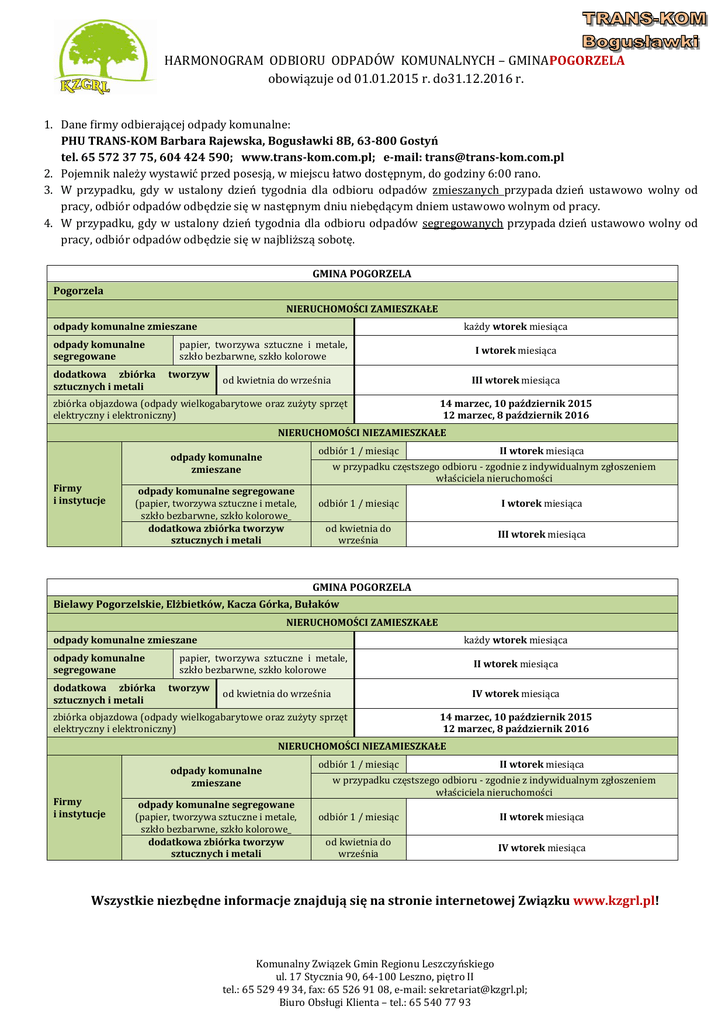 HARMONOGRAM ODBIORU ODPADÓW KOMUNALNYCH – GMINAPOGORZELA obowiązuje od 01.01.2015 r. do31.12.2016 r. 1. Dane firmy odbierającej odpady komunalne: PHU TRANS-KOM Barbara Rajewska, Bogusławki 8B, 63-800 Gostyń tel. 65 572 37 75, 604 424 590; www.trans-kom.com.pl; e-mail: [email protected] 2. Pojemnik należy wystawić przed posesją, w miejscu łatwo dostępnym, do godziny 6:00 rano. 3. W przypadku, gdy w ustalony dzień tygodnia dla odbioru odpadów zmieszanych przypada dzień ustawowo wolny od pracy, odbiór odpadów odbędzie się w następnym dniu niebędącym dniem ustawowo wolnym od pracy. 4. W przypadku, gdy w ustalony dzień tygodnia dla odbioru odpadów segregowanych przypada dzień ustawowo wolny od pracy, odbiór odpadów odbędzie się w najbliższą sobotę. GMINA POGORZELA Pogorzela NIERUCHOMOŚCI ZAMIESZKAŁE odpady komunalne zmieszane odpady komunalne segregowane dodatkowa zbiórka sztucznych i metali każdy wtorek miesiąca papier, tworzywa sztuczne i metale, szkło bezbarwne, szkło kolorowe tworzyw I wtorek miesiąca od kwietnia do września zbiórka objazdowa (odpady wielkogabarytowe oraz zużyty sprzęt elektryczny i elektroniczny) III wtorek miesiąca 14 marzec, 10 październik 2015 12 marzec, 8 październik 2016 NIERUCHOMOŚCI NIEZAMIESZKAŁE odbiór 1 / miesiąc II wtorek miesiąca w przypadku częstszego odbioru - zgodnie z indywidualnym zgłoszeniem właściciela nieruchomości odpady komunalne zmieszane Firmy i instytucje odpady komunalne segregowane (papier, tworzywa sztuczne i metale, szkło bezbarwne, szkło kolorowe_ dodatkowa zbiórka tworzyw sztucznych i metali odbiór 1 / miesiąc I wtorek miesiąca od kwietnia do września III wtorek miesiąca GMINA POGORZELA Bielawy Pogorzelskie, Elżbietków, Kacza Górka, Bułaków NIERUCHOMOŚCI ZAMIESZKAŁE odpady komunalne zmieszane odpady komunalne segregowane dodatkowa zbiórka sztucznych i metali każdy wtorek miesiąca papier, tworzywa sztuczne i metale, szkło bezbarwne, szkło kolorowe tworzyw II wtorek miesiąca od kwietnia do września zbiórka objazdowa (odpady wielkogabarytowe oraz zużyty sprzęt elektryczny i elektroniczny) IV wtorek miesiąca 14 marzec, 10 październik 2015 12 marzec, 8 październik 2016 NIERUCHOMOŚCI NIEZAMIESZKAŁE odpady komunalne zmieszane Firmy i instytucje odpady komunalne segregowane (papier, tworzywa sztuczne i metale, szkło bezbarwne, szkło kolorowe_ dodatkowa zbiórka tworzyw sztucznych i metali odbiór 1 / miesiąc II wtorek miesiąca w przypadku częstszego odbioru - zgodnie z indywidualnym zgłoszeniem właściciela nieruchomości odbiór 1 / miesiąc II wtorek miesiąca od kwietnia do września IV wtorek miesiąca Wszystkie niezbędne informacje znajdują się na stronie internetowej Związku www.kzgrl.pl! Komunalny Związek Gmin Regionu Leszczyńskiego ul. 17 Stycznia 90, 64-100 Leszno, piętro II tel.: 65 529 49 34, fax: 65 526 91 08, e-mail: [email protected]; Biuro Obsługi Klienta – tel.: 65 540 77 93 HARMONOGRAM ODBIORU ODPADÓW KOMUNALNYCH – GMINAPOGORZELA obowiązuje od 01.01.2015 r. do31.12.2016 r. GMINA POGORZELA Gumienice, Głuchów, Łukaszew, Ochla NIERUCHOMOŚCI ZAMIESZKAŁE odpady komunalne zmieszane odpady komunalne segregowane dodatkowa zbiórka sztucznych i metali każdy wtorek miesiąca papier, tworzywa sztuczne i metale, szkło bezbarwne, szkło kolorowe tworzyw III wtorek miesiąca od kwietnia do września I wtorek miesiąca zbiórka objazdowa (odpady wielkogabarytowe oraz zużyty sprzęt elektryczny i elektroniczny) 14 marzec, 10 październik 2015 12 marzec, 8 październik 2016 NIERUCHOMOŚCI NIEZAMIESZKAŁE odbiór 1 / miesiąc odpady komunalne zmieszane Firmy i instytucje II wtorek miesiąca w przypadku częstszego odbioru - zgodnie z indywidualnym zgłoszeniem właściciela nieruchomości odpady komunalne segregowane (papier, tworzywa sztuczne i metale, szkło bezbarwne, szkło kolorowe_ dodatkowa zbiórka tworzyw sztucznych i metali odbiór 1 / miesiąc III wtorek miesiąca od kwietnia do września I wtorek miesiąca GMINA POGORZELA Paradów, Wziąchów, Małgów, Kromolice NIERUCHOMOŚCI ZAMIESZKAŁE odpady komunalne zmieszane odpady komunalne segregowane dodatkowa zbiórka sztucznych i metali każdy wtorek miesiąca papier, tworzywa sztuczne i metale, szkło bezbarwne, szkło kolorowe tworzyw IV wtorek miesiąca od kwietnia do września zbiórka objazdowa (odpady wielkogabarytowe oraz zużyty sprzęt elektryczny i elektroniczny) II wtorek miesiąca 14 marzec, 10 październik 2015 12 marzec, 8 październik 2016 NIERUCHOMOŚCI NIEZAMIESZKAŁE odpady komunalne zmieszane Firmy i instytucje odpady komunalne segregowane (papier, tworzywa sztuczne i metale, szkło bezbarwne, szkło kolorowe_ dodatkowa zbiórka tworzyw sztucznych i metali odbiór 1 / miesiąc II wtorek miesiąca w przypadku częstszego odbioru - zgodnie z indywidualnym zgłoszeniem właściciela nieruchomości odbiór 1 / miesiąc IV wtorek miesiąca od kwietnia do września II wtorek miesiąca Wszystkie niezbędne informacje znajdują się na stronie internetowej Związku www.kzgrl.pl! Komunalny Związek Gmin Regionu Leszczyńskiego ul. 17 Stycznia 90, 64-100 Leszno, piętro II tel.: 65 529 49 34, fax: 65 526 91 08, e-mail: [email protected]; Biuro Obsługi Klienta – tel.: 65 540 77 93