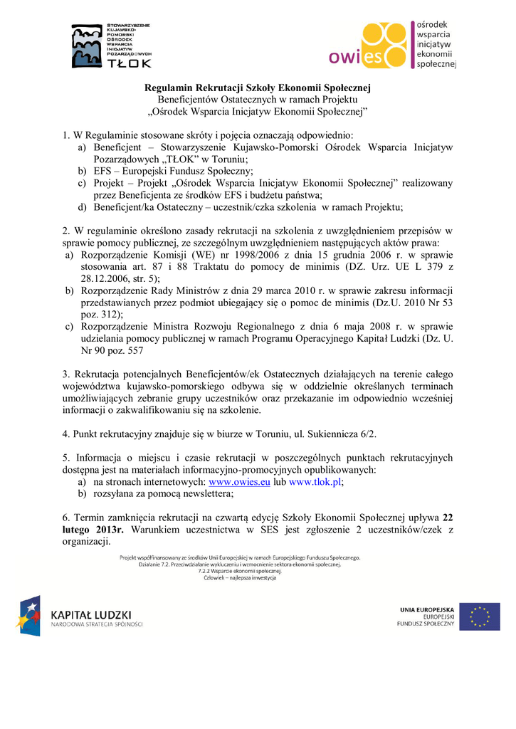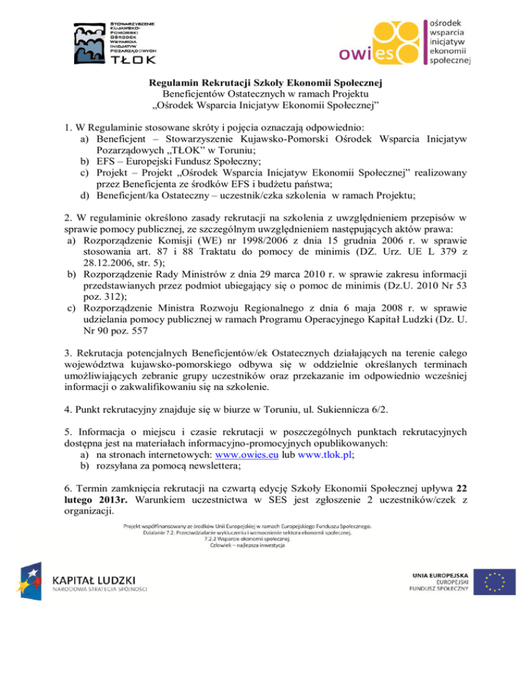 Regulamin Rekrutacji Szkoły Ekonomii Społecznej Beneficjentów Ostatecznych w ramach Projektu „Ośrodek Wsparcia Inicjatyw Ekonomii Społecznej” 1. W Regulaminie stosowane skróty i pojęcia oznaczają odpowiednio: a) Beneficjent – Stowarzyszenie Kujawsko-Pomorski Ośrodek Wsparcia Inicjatyw Pozarządowych „TŁOK” w Toruniu; b) EFS – Europejski Fundusz Społeczny; c) Projekt – Projekt „Ośrodek Wsparcia Inicjatyw Ekonomii Społecznej” realizowany przez Beneficjenta ze środków EFS i budżetu państwa; d) Beneficjent/ka Ostateczny – uczestnik/czka szkolenia w ramach Projektu; 2. W regulaminie określono zasady rekrutacji na szkolenia z uwzględnieniem przepisów w sprawie pomocy publicznej, ze szczególnym uwzględnieniem następujących aktów prawa: a) Rozporządzenie Komisji (WE) nr 1998/2006 z dnia 15 grudnia 2006 r. w sprawie stosowania art. 87 i 88 Traktatu do pomocy de minimis (DZ. Urz. UE L 379 z 28.12.2006, str. 5); b) Rozporządzenie Rady Ministrów z dnia 29 marca 2010 r. w sprawie zakresu informacji przedstawianych przez podmiot ubiegający się o pomoc de minimis (Dz.U. 2010 Nr 53 poz. 312); c) Rozporządzenie Ministra Rozwoju Regionalnego z dnia 6 maja 2008 r. w sprawie udzielania pomocy publicznej w ramach Programu Operacyjnego Kapitał Ludzki (Dz. U. Nr 90 poz. 557 3. Rekrutacja potencjalnych Beneficjentów/ek Ostatecznych działających na terenie całego województwa kujawsko-pomorskiego odbywa się w oddzielnie określanych terminach umożliwiających zebranie grupy uczestników oraz przekazanie im odpowiednio wcześniej informacji o zakwalifikowaniu się na szkolenie. 4. Punkt rekrutacyjny znajduje się w biurze w Toruniu, ul. Sukiennicza 6/2. 5. Informacja o miejscu i czasie rekrutacji w poszczególnych punktach rekrutacyjnych dostępna jest na materiałach informacyjno-promocyjnych opublikowanych: a) na stronach internetowych: www.owies.eu lub www.tlok.pl; b) rozsyłana za pomocą newslettera; 6. Termin zamknięcia rekrutacji na czwartą edycję Szkoły Ekonomii Społecznej upływa 22 lutego 2013r. Warunkiem uczestnictwa w SES jest zgłoszenie 2 uczestników/czek z organizacji. 7. Uczestnikiem/uczestniczką szkolenia może być osoba: a) działająca w funkcjonujących i nowopowstałych podmiotach ekonomii społecznej (w tym: spółdzielniach socjalnych, CIS, KIS, WTZ, NGO - organizacjach pozarządowych); b) działająca w otoczeniu ekonomii społecznej: instytucje rynku pracy oraz pomocy i integracji społecznej; c) osoba fizyczna/prawna – zainteresowania zakładaniem i prowadzeniem działalności w sektorze ekonomii społecznej; 8. Osoby chętne do wzięcia udziału w szkoleniu powinny wypełnić formularz zgłoszeniowy elektronicznie (w sytuacji trudności technicznych, prosimy o kontakt z biurem) następnie go wydrukować i podpisany formularz zgłoszeniowy złożyć w terminie wskazanym w ogłoszeniu o naborze na szkolenie. 9. Wzory formularzy zgłoszeniowych są dostępne w punkcie rekrutacyjnym oraz na stronach internetowych, na których zamieszczane są informacje o miejscu i czasie rekrutacji. 10. Podmiot, będący przedsiębiorcą w rozumieniu przepisów z zakresu pomocy publicznej ubiegający się o udział w szkoleniach, w ramach pomocy de minimis jest zobowiązany do przedstawienia podmiotowi udzielającemu pomocy, wraz z ww. formularzem o udzielenie wsparcia: a. wszystkich zaświadczeń o pomocy de minimis, jakie otrzymał w roku, w którym ubiega się o pomoc, oraz w ciągu 2 poprzedzających go lat, albo oświadczenia o wielkości pomocy de minimis otrzymanej w tym okresie, albo oświadczenia o nieotrzymaniu takiej pomocy w tym okresie; b. informacji, zgodnie z treścią ww. rozporządzenia Rady Ministrów z dnia 29 marca 2010 r. w sprawie zakresu informacji przedstawianych przez podmiot ubiegający się o pomoc de minimis niezbędnych do udzielenia pomocy de minimis, dotyczących w szczególności wnioskodawcy i prowadzonej przez niego działalności gospodarczej oraz wielkości i przeznaczenia pomocy publicznej otrzymanej w odniesieniu do tych samych kosztów kwalifikujących się do objęcia pomocą, na pokrycie których ma być przeznaczona pomoc de minimis. 11. Podmiot ubiegający się o pomoc de minimis w rolnictwie lub rybołówstwie jest zobowiązany do przedstawienia podmiotowi udzielającemu pomocy, wraz z wnioskiem o udzielenie pomocy: a) wszystkich zaświadczeń o pomocy de minimis w rolnictwie, jakie otrzymał w roku, w którym ubiega się o pomoc, oraz w ciągu 2 poprzedzających go lat obrotowych, albo oświadczenia o wielkości pomocy de minimis w rolnictwie otrzymanej w tym okresie, albo oświadczenia o nieotrzymaniu takiej pomocy w tym okresie; b) wszystkich zaświadczeń o pomocy de minimis w rybołówstwie, jakie otrzymał w roku, w którym ubiega się o pomoc, oraz w ciągu 2 poprzedzających go lat, albo oświadczenia o wielkości pomocy de minimis w rybołówstwie otrzymanej w tym okresie, albo oświadczenia o nieotrzymaniu takiej pomocy w tym okresie; c) informacji, zgodnie z treścią ww. rozporządzenia Rady Ministrów z dnia 29 marca 2010 r. w sprawie zakresu informacji przedstawianych przez podmiot ubiegający się o pomoc de minimis niezbędnych do udzielenia pomocy de minimis w rolnictwie lub rybołówstwie, dotyczących w szczególności wnioskodawcy i prowadzonej przez niego działalności gospodarczej oraz wielkości i przeznaczenia pomocy publicznej otrzymanej w odniesieniu do tych samych kosztów kwalifikujących się do objęcia pomocą, na pokrycie których ma być przeznaczona pomoc de minimis w rolnictwie lub rybołówstwie. 12. Wnioskodawca ubiegający się o wsparcie przedstawia podmiotowi udzielającemu pomocy informacje dotyczące sprawozdania finansowe za okres 3 ostatnich lat obrotowych, sporządzane zgodnie z przepisami o rachunkowości; 13. Osoby fizyczne nie prowadzące działalności gospodarczej oraz organizacje pozarządowe, które prowadzą wyłącznie działalność statutow