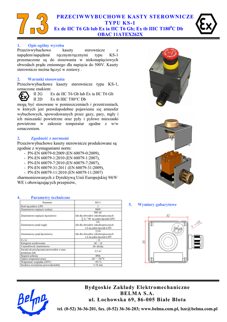 PRZECIWWYBUCHOWE KASTY STEROWNICZE TYPU KS-1 Ex de IIC T6 Gb lub Ex ia IIC T6 Gb; Ex tb IIIC T1800C Db OBAC 11ATEX262X 1. Opis ogólny wyrobu Przeciwwybuchowe kasety sterownicze z napędem/napędami ręcznym/ręcznymi typu KS-1 przeznaczone są do stosowania w niskonapięciowych obwodach prądu zmiennego dla napięcia do 500V. Kasety sterownicze można łączyć w zestawy . 2. Warunki stosowania Przeciwwybuchowe kasety sterownicze typu KS-1, oznaczone znakiem: II 2G Ex de IIC T6 Gb lub Ex ia IIC T6 Gb II 2D Ex tb IIIC T80°C Db mogą być stosowane w pomieszczeniach i przestrzeniach, w których jest prawdopodobne pojawienie się atmosfer wybuchowych, spowodowanych przez gazy, pary, mgły i ich mieszanki powietrzne oraz pyły i pyłowe mieszanki powietrzne w zakresie temperatur zgodne z w/w oznaczeniem. 2. Zgodność z normami Przeciwwybuchowe kasety sterownicze produkowane są zgodnie z wymaganiami norm: - PN-EN 60079-0:2009 (EN 60079-0:2009), - PN-EN 60079-1:2010 (EN 60079-1:2007), - PN-EN 60079-7:2010 (EN 60079-7:2007), - PN-EN 60079-31:2011 (EN 60079-31:2009), - PN-EN 60079-11:2010 (EN 60079-11:2007) zharmonizowanych z Dyrektywą Unii Europejskiej 94/9/ WE i obowiązujących przepisów, 4. Parametry techniczne Parametr KS-1 Ilość łączników ŁPO Znamionowe napięcie izolacji Znamionowe napięcie łączeniowe Znamionowy prąd ciągły Znamionowy prąd łączeniowy Ci, Li Kategoria użytkowania Częstotliwość znamionowa Zaciski do przyłączania przewodów o max przekroju żyły Stopień ochrony Zakres temperatur pracy Wilgotność względna (20 0C) Średnica zewnętrzna przewodu/kabla 1 500V 500 AC lub dla obwodów iskrobezpiecznych ∑ Ui ≤90 na jeden łącznik ŁPO 6A lub dla obwodów iskrobezpiecznych 1,6 na jeden łącznik ŁPO 2,5A lub dla obwodów iskrobezpiecznych 1,6 na jeden łącznik ŁPO ~0 AC - 14 50÷60 Hz 5. Wymiary gabarytowe 2,5 m2 IP66 -20 ÷ +50 0C <95 % 3-18 mm Bydgoskie Zakłady Elektromechaniczne BELMA S.A. ul. Łochowska 69, 86-005 Białe Błota tel. (0-52) 36-36-201, fax. (0-52) 36-36-203; www.belma.com.pl, [email protected] 6. Sposób zamawiania W składanym zamówieniu należy podać nazwę wyrobu (KS-1) oraz wykonanie składające się z: – pierwsza cyfra -programu łączeń (nr wg schematu poniżej) – druga cyfra - ilości dławików (1 lub 2), – trzecia cyfra - rodzaju napędu (nr wg tabeli poniżej) Przykład: Przeciwwybuchowe kasety sterownicze typu KS-1 wyk. 2 - 2 -4. Standardowo Przeciwwybuchowe kasety sterownicze typu KS-1 są wyposażone w dławnice dla średnic zewnętrzny wprowadzanych przewodów od 5-14mm (M20x1,5). Istnieje możliwość stosowania innych dławików: M16x1,5, M20x1,5, M25x1,5. Schemat programów łączeń Tabela napędów Rodzaj napędu przycisk zwykły (powrotny/niestabilny) * przycisk grzybkowy czarny (powrotny/ niestabilny) przełącznik obrotowy, piórkowy 0-1 (niepowrotny/ stabilny) przełącznik z kluczem 0-1 (kluczyk wyjmowany w obu pozycjach) przełącznik z kluczem 0-1 (kluczyk wyjmowany w pozycji 1- wciśniętej) przełącznik z kluczem 0-1 (kluczyk wyjmowany w pozycji 0- wciśniętej) przycisk grzybkowy, awaryjny, żółto-czerwony (zwolnienie napędu następuje po wyciągnięciu grzybka) przycisk grzybkowy, awaryjny, żółto-czerwony z kluczykiem (zwolnienie napędu następuje po obrocie kluczyka) * wkładki gładkie (czerwona/zielona/żółta/biała/czarna) dodawane do każdego napędu 1 2 3 4, 5, 6 7 8 Nr 1 2 3 4 5 6 7 8