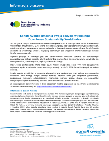 Informacja prasowa Paryż, 22 września 2008r. Sanofi-Aventis umacnia swoją pozycję w rankingu Dow Jones Sustainability World Index Już drugi rok z rzędu Sanofi-Aventis umocniła swą obecność w rankingu Dow Jones Sustainability World Index (DJSI World). DJSI World Index to największy pod względem inwestycji kapitałowych, międzynarodowy, renomowany ranking indeksów zrównoważonego rozwoju. Grupa Sanofi-Aventis znalazła się w rankingu wśród 7 najwyżej ocenianych pod względem zrównoważonego rozwoju firm farmaceutycznych. Wysoka pozycja w rankingu jest dla Sanofi-Aventis wyrazem uznania dla codziennego zaangażowania całego zespołu. Wynik potwierdza również fakt, że zrównoważony rozwój stał się rzeczywistością oraz integralną częścią działalności Grupy. Dow Jones Sustainability World Index (DJSI World) uwzględnia około 10% firm osiągających najlepsze wyniki w zakresie zrównoważonego rozwoju spośród 2500 firm działających na całym świecie. Indeks ocenia wyniki firm w aspekcie ekonomicznym, społecznym oraz wpływu na środowisko naturalne. Pod uwagę wzięte zostały również czynniki takie jak: corporate governance, zarządzanie ryzykiem, odpowiedzialny marketing, warunki pracy, dostęp do preparatów medycznych i opieki zdrowotnej, stosunki z dostawcami oraz zmiana klimatu. Z osiągnięciami Sanofi-Aventis w tych obszarach można zapoznać się na stronie poświęconej zrównoważonemu rozwojowi: http://sustainability.sanofi-aventis.com/ Informacje o Sanofi-Aventis Sanofi-Aventis jest jedną z największych na świecie firm farmaceutycznych. Dysponując ogólnoświatową organizacją badań i rozwoju, firma Sanofi-Aventis zajmuje czołowe pozycje w siedmiu głównych obszarach terapeutycznych: leków stosowanych w chorobach układu krążenia, zakrzepicy, onkologii, chorobach metabolicznych, chorobach ośrodkowego układu nerwowego, chorobach wewnętrznych oraz szczepionek. Firma Sanofi-Aventis jest notowana na giełdach w Paryżu (EURONEXT: SAN) oraz w Nowym Jorku (NYSE: SNY). W Polsce, w wyniku formalno-prawnego połączenia spółek Sanofi-Synthelabo i Aventis Pharma 4 kwietnia 2006 roku, została powołana nowa spółka o nazwie Sanofi-Aventis Sp. z o.o. W wyniku połączenia powstał trzeci, co do wielkości koncern farmaceutyczny w Polsce. Firma zatrudnia blisko 900 osób, w tym 180 we własnym zakładzie produkcyjnym w Rzeszowie. Communication Manager: Monika Chmielewska-Żehaluk [email protected] T E L . : ( 22) 541 47 53 F A X : ( 2 2 ) 5 4 1 4 8 8 8 Sanofi-Aventis Sp. z o.o., ul. Domaniewska 41, 02-672 Warszawa