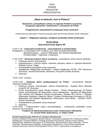 XVIII FORUM INICJATYW OŚWIATOWYCH „Nasi w świecie, inni w Polsce” Spojrzenie z perspektywy szkoły na migracje Polaków za granicę i przyjazdy migrantów, repatriantów i uchodźców do Polski Przygotowanie obywatelskich propozycji zmian prawnych Konferencja pod patronatem Przewodniczącego Sejmowej Komisji Edukacji, Nauki i Młodzieży Część I – Diagnoza sytuacji i wstępne postulaty zmian prawnych 19.03.2016 Sala Kolumnowa Sejmu RP 11.00-11.30 - rozpoczęcie konferencji – wprowadzenie w problematykę. Wystąpienia: b. Ambasadora RP w Indiach, prof. Marii Krzysztofa Byrskiego, Wiesława Stypuły - „dziecka” Maharadży Jam Saheba Digvijaysinhji, Państwa Makar - migrantów z Argentyny 11.30-13.00 – Edukacja polskich dzieci za granicą - prowadzenie Janina Hanna Zielińska Podstawy prawne, finansowanie Doświadczenia z różnych krajów: Holandia (wirtualny udział w I zjeździe Mentorów, Hofstad Lyceum, Haga) Przedstawienie postulatów zmian prawnych Wystąpienia: Małgorzata Kurpiewska i Jolanta Węglowska KFON, ZSP Słoneczne (Szczecin), Zespół Szkół Ekola, (Wrocław), Krzysztof Tusiński (Kraków) Dyskusja 13.00-13.30 - przerwa 13.30-15.30 – Edukacja dzieci przybywających do Polski - prowadzenie Elżbieta Tołwińska-Królikowska Podstawy prawne, finansowanie. Joanna Gospodarczyk - Dyrektor Biuro Edukacji Urząd M. St. Warszawy Panel: doświadczenia szkół: Monika Dziobek - Prezes Stowarzyszenia „Za Rzeką Krzną” prowadzącego SP Berezówka i Anna Sobolewska - Dyrektor SP Berezówka (Gm. Zalesie, woj. lubelskie), Danuta Jeziorkowska - Dyrektor SP nr 58 im. T. Gajcego (Warszawa Targówek), Sławomir Sikora - Dyrektor Społecznego Gimnazjum nr 20 im. Maharadży Jam Saheba Digvijaysinhji, (Warszawa), Jacek Bulak - Dyrektor ZOPO Gmina Lesznowola Przedstawienie postulatów zmian prawnych Dyskusja 15.30-16.00 – Podsumowanie części wprowadzającej – przekazanie postulatów zmian prawnych do konsultacji Przejście do Szkół prowadzonych przez Towarzystwo Oświatowe im. Cecylii Plater-Zyberkówny, ul. Piękna 24/26 Komitet Organizacyjny XVIII Forum Inicjatyw Oświatowych: Centrum Kształcenia Nauczycieli Języków Obcych i Edukacji Europejskiej UW, Federacja Inicjatyw Oświatowych, Fundacja KREDA, Fundacja Przestrzeń dla Edukacji, Krajowe Forum Oświaty Niepublicznej, Społeczne Gimnazjum nr 20 Raszyńska, Stowarzyszenie „Dom Wschodni – Domus Orientalis”, Stowarzyszenie Edukator, Towarzystwo Oświatowe im. Cecylii Plater-Zyberkówny, Związek Dziewcząt i Kobiet Chrześcijańskich Polska YWCA. Zapraszamy do współpracy! XVIII FORUM INICJATYW OŚWIATOWYCH „Nasi w świecie, inni w Polsce” Część II – Przygotowanie obywatelskiego programu konsultacji publicznych i działań integracyjnych 19.03.2016 Szkoły Towarzystwa Oświatowego im. Cecylii Plater-Zyberkówny, Warszawa, ul. Piękna 24/26 16.00-17.00 - przejście i zakwaterowanie 17.00-18.00 - obiadokolacja 18.00-20.00 - Jak przygotować szkoły do przyjęcia migrantów i uchodźców? Wymiana doświadczeń 20.00 - wieczór integracyjny 20.03.2016 8.00-9.00 - śniadanie 9.00-9.45 - Prezentacja narzędzi konsultacji publicznych proponowanych przez Kancelarię Premiera Rady Ministrów i planowanych do wykorzystania w projekcie „Zmiany w systemie edukacji w Polsce odpowiedzią na oczekiwania społeczne i zmiany gospodarcze” . Zespół projektowy FIO 9.45-10.15 - Dyskusja „Jak wykorzystać konsultacje publiczne do przygotowania zmian w oświacie”. 10.15-11.30 - Przygotowanie dalszych działań odpowiadających na potrzeby i oczekiwania społeczne w miastach i na wsi – praca w grupach warsztatowych 11.30-11.45 - przerwa 11.45-12.00 - Przedstawienie założeń projektu „Prezent dla Franciszka” planowanego w ramach przygotowań do Światowych Dni Młodzieży. Związek Dziewcząt i Kobiet Chrześcijańskich Polska YWCA 12.00-12.15 - Informacja o Konferencji „Wsparcie społeczeństwa obywatelskiego w Polsce. Nowe otwarcie” organizowanej przez KPRM. 12.15-13.00 - Dyskusja, podsumowanie i zakończenie XVIII Forum Inicjatyw Oświatowych Komitet Organizacyjny XVIII Forum Inicjatyw Oświatowych: Centrum Kształcenia Nauczycieli Języków Obcych i Edukacji Europejskiej UW, Federacja Inicjatyw Oświatowych, Fundacja KREDA, Fundacja Przestrzeń dla Edukacji, Krajowe Forum Oświaty Niepublicznej, Społeczne Gimnazjum nr 20 Raszyńska, Stowarzyszenie „Dom Wschodni – Domus Orientalis”, Stowarzyszenie Edukator, Towarzystwo Oświatowe im. Cecylii Plater-Zyberkówny, Związek Dziewcząt i Kobiet Chrześcijańskich Polska YWCA. Zapraszamy do współpracy!