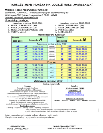 TURNIEJ MINI HOKEJA NA LODZIE HUKS „WARSZAWA” Miejsce i czas rozgrywania turnieju: Lodowisko „TORWAR II” w Warszawie przy ul. Łazienkowskiej 6a 26 listopad 2010 (piątek) – w godzinach 15:00 - 20:00 Odprawa techniczna o godzinie 14:30. Uczestnicy turnieju: 1. 2. 3. 4. zawodnicy urodzeni 2000-2001 HUKS „WARSZAWA” (A1) UHKS „MAZOWSZE” (A2) HUKS „Niedźwiadki” Gdynia, (A3) TKH Toruń (A4) zawodnicy urodzeni 2002-2003 HUKS „WARSZAWA” (B1) UHKS „MAZOWSZE” (B2) PTH Poznań (B3) ŁKH Łódź (B4) 1. 2. 3. 4. Harmonogram turnieju: Rocznik: lodowisko 2000-2001 Rocznik: A lodowisko 2002-2003 B Rozpoczęcie turnieju godzina 15:00 A1 A3 A1 A2 A1 A2 A2 A4 A3 A4 A4 A3 15:05-15:15 15:20-15:30 15:35-15:45 15:50-16:00 16:05-16:15 16:20-16:25 sztafeta 1 sztafeta 2 sztafeta 3 sztafeta 4 sztafeta 5 sztafeta 6 B1 B3 B1 B2 B1 B2 B2 B4 B3 B4 B4 B3 15:05-15:15 15:20-15:30 15:35-15:45 15:50-16:00 16:05-16:15 16:20-16:25 B1 B3 B1 B2 B1 B2 B2 B4 B3 B4 B4 B3 16:35-17:00 17:05-17:30 17:35-18:00 18:05-18:30 18:35-19:00 19:05-19:30 Przerwa A1 A3 A1 A2 A1 A2 A2 A4 A3 A4 A4 A3 16:35-17:00 17:05-17:30 17:35-18:00 18:05-18:30 18:35-19:00 19:05-19:30 mecz 1 mecz 2 mecz 3 mecz 4 mecz 5 mecz 6 Zakończenie turnieju: 19:45 System rozgrywek: Mecze: Formacje na lodzie 4 osobowe (składy 3x4 zawodników + 1 bramkarz) Możliwi rezerwowi gracze po 1 w każdej formacji! (Minimalna liczba zawodników 12+1, a maksymalna 15+2) Formacje oznaczone kolorami. Nie ma możliwości wymiany zawodników pomiędzy formacjami. Sztafety Według zasad PZHL załącznik 1 i 2 Plan mini hokej Regulamin mini hokej 22,5 min. gra na "małe" lodowisko. Punktacja w sztafetach: Zmiany, co 90 sekund (5 zmian dla każdej czwórki). 2 punkty - wygrane, 1 punkty - remis i 0 punkty przegrany Każdy faul kończy się karnym strzelanym przez poszkodowanego lub innym graczem będącym na lodowisku . Punktacja w meczu: 2 punkty - wygrany, 1 punkty - remis i 0 punkty przegrany (Przy tej samej ilości punktów decyduje wynik bezpośredniego spotkania, a jeżeli był to remis to większa ilość bramek strzelonych w całym turnieju). Każdy zawodnik musi posiadać badania lekarskie i legitymację. Ubezpieczenie, noclegi i wyżywienie we własnym zakresie. ORGANIZATOR: HUKS „WARSZAWA” WSPÓŁORGANIZATORZY: DZIELNICA ŚRÓDMIEŚCIE WARSZAWY