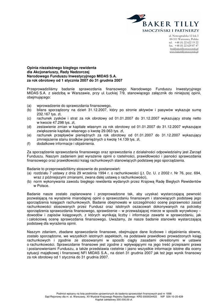 ul. Nowogrodzka 12 lok.3 00-511 Warszawa, Polska tel. +48 (0) 22 622 19 22 fax. +48 (0) 22 629 87 47 [email protected] www.bakertillysmoczynski.pl Opinia niezależnego biegłego rewidenta dla Akcjonariuszy, Rady Nadzorczej Narodowego Funduszu Inwestycyjnego MIDAS S.A. za rok obrotowy od 1 stycznia 2007 do 31 grudnia 2007 Przeprowadziliśmy badanie sprawozdania finansowego Narodowego Funduszu Inwestycyjnego MIDAS S.A. z siedzibą w Warszawie, przy ul. Łuckiej 7/9, stanowiącego załącznik do niniejszej opinii, obejmującego: (a) (b) (c) (d) (e) (f) wprowadzenie do sprawozdania finansowego, bilans sporządzony na dzień 31.12.2007, który po stronie aktywów i pasywów wykazuje sumę 232.167 tys. zł, rachunek zysków i strat za rok obrotowy od 01.01.2007 do 31.12.2007 wykazujący stratę netto w kwocie 47.298 tys. zł, zestawienie zmian w kapitale własnym za rok obrotowy od 01.01.2007 do 31.12.2007 wykazujące zwiększenie kapitału własnego o kwotę 29.063 tys. zł, rachunek przepływów pieniężnych za rok obrotowy od 01.01.2007 do 31.12.2007 wykazujący zmniejszenie stanu środków pieniężnych o kwotę 14.139 tys. zł, dodatkowe informacje i objaśnienia. Za sporządzenie sprawozdania finansowego oraz sprawozdania z działalności odpowiedzialny jest Zarząd Funduszu. Naszym zadaniem jest wyrażenie opinii o rzetelności, prawidłowości i jasności sprawozdania finansowego oraz prawidłowości ksiąg rachunkowych stanowiących podstawę jego sporządzenia. Badanie to przeprowadziliśmy stosownie do postanowień: (a) rozdziału 7 ustawy z dnia 29 września 1994 r. o rachunkowości (j.t. Dz. U. z 2002 r. Nr 76, poz. 694, wraz z późniejszymi zmianami, zwana dalej ustawą o rachunkowości), (b) norm wykonywania zawodu biegłego rewidenta wydanych przez Krajową Radę Biegłych Rewidentów w Polsce. Badanie nasze zostało zaplanowane i przeprowadzone tak, aby uzyskać wystarczającą pewność pozwalającą na wyrażenie miarodajnej opinii o sprawozdaniu finansowym i stanowiących podstawę jego sporządzenia księgach rachunkowych. Badanie obejmowało w szczególności ocenę poprawności zasad rachunkowości stosowanych przez Fundusz oraz istotnych oszacowań dokonywanych na potrzeby sporządzenia sprawozdania finansowego, sprawdzenie – w przeważającej mierze w sposób wyrywkowy – dowodów i zapisów księgowych, z których wynikają liczby i informacje zawarte w sprawozdaniu, jak i całościową ocenę sprawozdania finansowego. Uważamy, że nasze badanie stanowiło wystarczającą podstawę dla wyrażenia opinii. Naszym zdaniem, zbadane sprawozdanie finansowe, obejmujące dane liczbowe i objaśnienia słowne, zostało sporządzone, we wszystkich istotnych aspektach, na podstawie prawidłowo prowadzonych ksiąg rachunkowych i zgodnie ze stosowanymi w sposób ciągły zasadami określonymi w ustawie o rachunkowości. Sprawozdanie finansowe jest zgodne z wpływającymi na jego treść przepisami prawa i postanowieniami Funduszu, a także przedstawia rzetelnie i jasno wszystkie informacje istotne dla oceny sytuacji majątkowej i finansowej NFI MIDAS S.A., na dzień 31 grudnia 2007 jak też jego wynik finansowy za rok obrotowy od 1 stycznia do 31 grudnia 2007. Podmiot wpisany na listę podmiotów uprawnionych do badania sprawozdań finansowych pod nr 1898 Sąd Rejonowy dla m. st. Warszawy, XII Wydział Krajowego Rejestru Sądowego KRS 0000034422 NIP 526-10-25-639 Kapitał zakładowy 200.000,00 zł. Stwierdzamy, że sprawozdanie z działalności Narodowego Funduszu Inwestycyjnego MIDAS S.A. zawiera, we wszystkich istotnych aspektach, informacje wymagane przez ustawę o rachunkowości i Rozporządzenie Ministra Finansów z dnia 19 października 2005 r. w sprawie informacji bieżących i okresowych przekazywanych przez emitentów papierów wartościowych, a zawarte w nim informacje są zgodne ze zbadanym sprawozdaniem finansowym. Działający w imieniu BAKER TILLY Smoczyński i Partnerzy Sp. z o.o.: Kazimierz Lewański Joe Smoczyński Biegły Rewident wpisany na listę Biegłych Rewidentów pod numerem 9434/7077 Prezes Zarządu BAKER TILLY Smoczyński i Partnerzy Sp. z o.o. Spółka wpisana na listę podmiotów uprawnionych do badania sprawozdań finansowych pod numerem 1898 Warszawa, dnia 19 maja 2008 r. 2