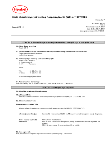 Karta charakterystyki według Rozporządzenia (WE) nr 1907/2006 Strona 1 z 9 KC Numer : 496791 V001.1 Aktualizacja: 23.05.2015 Data druku: 15.06.2015 Zastępuje wersje z: 10.07.2014 Ceresit CT 10 SEKCJA 1: Identyfikacja substancji/mieszaniny i identyfikacja przedsiębiorstwa 1.1. Identyfikator produktu Ceresit CT 10 1.2. Istotne zidentyfikowane zastosowania substancji lub mieszaniny oraz zastosowania odradzane Zastosowanie substancji/preparatu: produkt impregnujący 1.3. Dane dotyczące dostawcy karty charakterystyki Henkel Polska Sp.z o.o ul. Domaniewska 41 02-672 Warszawa Poland Tel.: Nr faksu: +48 (22) 5656 200 +48 (22) 5656 222 [email protected] 1.4. Numer telefonu alarmowego Henkel Polska Sp. z o. o.; +(48) 728 302 187 (24h) ; +48 41 37 10187 (7.00-15.00) SEKCJA 2: Identyfikacja zagrożeń 2.1. Klasyfikacja substancji lub mieszaniny Klasyfikacja (CLP): Substancja lub mieszanina nie stwarza zagrożenia wg rozporządzenia (WE) Nr 1272/2008 (CLP). 2.2. Elementy oznakowania Elementy oznakowania (CLP): Substancja lub mieszanina nie stwarza zagrożenia wg rozporządzenia (WE) Nr 1272/2008 (CLP). Informacje uzupełniające Zawiera 1,2-benzoizotiazol-3(2H)-on. Może powodować wystąpienie reakcji alergicznej. Zwrot określający środki ostrożności: P102 Chronić przed dziećmi. P101 W razie konieczności zasięgnięcia porady lekarza należy pokazać pojemnik lub etykietę. P262 Nie wprowadzać do oczu, na skórę lub na odzież. 2.3. Inne zagrożenia Brak przy stosowaniu zgodnie z przeznaczeniem i w sposób zgodny z zaleceniami. KC Numer: 496791 V001.1 Ceresit CT 10 Strona 2 z 9 SEKCJA 3: Skład/informacja o składnikach 3.2. Mieszaniny Ogólna charakterystyka chemiczna: Silikonowy impregnat do płytek i spoin Podstawowe składniki preparatu: związki krzemu Informacje o składnikach według Rozporządzenia WE Nr 1272/2008: Niebezpieczne składniki Nr CAS Triethoxyoctylsilane 2943-75-1 1,2-benzoizotiazol-3(2H)-on 2634-33-5 Numer WE Nr rejestracyjny REACH 220-941-2 Zawartość Klasyfikacja 1- < 5 % Skin Irrit. 2; Przenikanie przez skórę H315 220-120-9 50- < 500 PPM Aquatic Acute 1 H400 Aquatic Chronic 2 H411 Acute Tox. 4; Połknięcie H302 Skin Irrit. 2 H315 Skin Sens. 1 H317 Eye Dam. 1 H318 Pełne brzmienie zwrotów H wymienione jest w sekcji 16 ' Inne informacje". Substancje nie sklasyfikowane, dla których określono najwyższe dopuszczalne stężenia w środowisku pracy. SEKCJA 4: Środki pierwszej pomocy 4.1. Opis środków pierwszej pomocy Wskazówki ogólne: W przypadku dolegliwości zdrowotnych skonsultować się z lekarzem. Przedostanie się do dróg oddechowych: Zapewnić poszkodowanemu oddychanie świeżym powietrzem, w przypadku utrzymywania się dolegliwości skonsultować się z lekarzem. Kontakt ze skórą: Przemyć bieżącą wodą i mydłem. Zmienić zabrudzoną nasączoną odzież. Kontakt z oczami Przemyć pod bieżącą wodą (przez 10 minut), w razie potrzeby udać się do lekarza. Połknięcie Przepłukać jamę ustną, wypić 1-2 szklanki wody, skonsultować się z lekarzem. 4.2. Najważniejsze ostre i opóźnione objawy oraz skutki narażenia dane nieznane 4.3. Wskazania dotyczące wszelkiej natychmiastowej pomocy lekarskiej i szczególnego postępowania z poszkodowanym Patrz sekcja: Opis środków pierwszej pomocy SEKCJA 5: Postępowanie w przypadku pożaru KC Numer: 496791 V001.1 Ceresit CT 10 Strona 3 z 9 5.1. Środki gaśnicze Odpowiednie środki gaśnicze: dwutlenek węgla, piana, proszek, rozpylony strumień wody pod ciśnieniem Środki gaśnicze, które nie mogą być używane ze względów bezpieczeństwa: strumień wody pod wysokim ciśnieniem 5.2. Szczególne zagrożenia związane z substancją lub mieszaniną Podczas pożaru wyzwalają się tlenki węgla(CO) i dwutlenki węgla ( CO2) 5.3. Informacje dla straży pożarnej Stosować aparaty oddechowe z niezależnym obiegiem powietrza. Stosować indywidualne wyposażenie ochronne. SEKCJA 6: Postępowanie w przypadku niezamierzonego uwolnienia do środowiska 6.1. Indywidualne środki ostrożności, wyposażenie ochronne i procedury w sytuacjach awaryjnych Unikać kontaktu z oczami i skórą. Stosować środki ochrony indywidualnej. Unikać poślizgnięcia się na rozlanym produkcie. 6.2. Środki ostrożności w zakresie ochrony środowiska Nie dopuścić do przedostania się do kanalizacji / wód powierzchniowych / gruntowych. 6.3. Metody i materiały zapobiegające rozprzestrzenianiu się skażenia i służące do usuwania skażenia Zebrać przy użyciu materiału wiążącego ciecz (np. piasku, torfu, mączki drzewnej). Zabrudzony materiał usuwać jako odpad, postępować zgodnie z sekcją 13. 6.4. Odniesienia do innych sekcji Patrz: sekcja 8. SEKCJA 7: Postępowanie z substancjami i mieszaninami oraz ich magazynowanie 7.1. Środki ostrożności dotyczące bezpiecznego postępowania Żadne szczególne środki nie są konieczne. Zasady higieny: Przed przerwami w pracy i po jej zakończeniu umyć ręce. Nie jeść, nie pić i nie palić w czasie pracy. 7.2. Warunki bezpiecznego magazynowania, łącznie z informacjami dotyczącymi wszelkich wzajemnych niezgodności Magazynować w orginalnie zamkniętym opakowaniu , chronionym przed wilgocią . Składować w miejscu chłodnym i suchym. Chronic przed zamarzaniem Nie przechowywać razem z jedzeniem ani żadnymi produktami konsumpcyjnymi (kawa, herbata, tytoń, itd.). 7.3. Szczególne zastosowanie(-a) końcowe produkt impregnujący SEKCJA 8: Kontrola narażenia/środki ochrony indywidualnej 8.1. Parametry dotyczące kontroli LIMITY NARAŻENIA Dotyczy Poland brak KC Numer: 496791 V001.1 Ceresit CT 10 Strona 4 z 9 Wskaźnik ekspozycji biologicznej: brak 8.2. Kontrola narażenia: Ochrona dróg oddechowych: Nie wymagana. Ochrona rąk: W przypadku dłuzszego kontaktu z preparatem stosować rękawice ochronne wykonane z gumy nitrylowej, zgodnie z normą EN 374. Czas przebicia: > 60 min. Grubość materiału > 0,1 mm Przy dłuższym i powtarzającym się kontakcie 