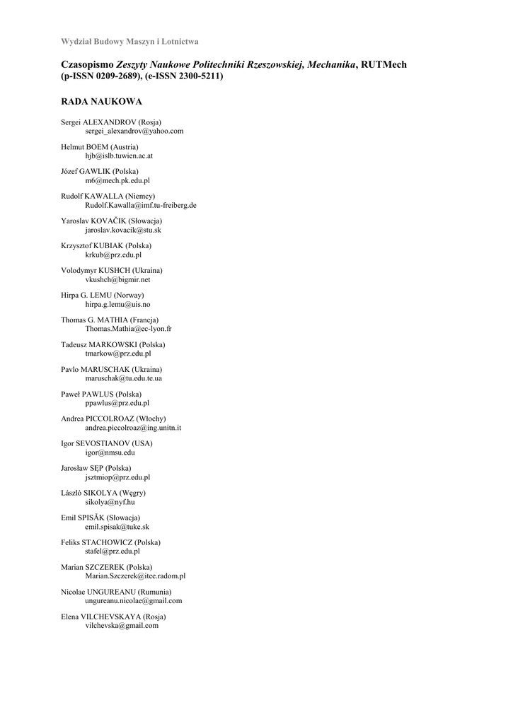 Wydział Budowy Maszyn i Lotnictwa Czasopismo Zeszyty Naukowe Politechniki Rzeszowskiej, Mechanika, RUTMech (p-ISSN 0209-2689), (e-ISSN 2300-5211) RADA NAUKOWA Sergei ALEXANDROV (Rosja) [email protected] Helmut BOEM (Austria) [email protected] Józef GAWLIK (Polska) [email protected] Rudolf KAWALLA (Niemcy) [email protected] Yaroslav KOVAČIK (Słowacja) [email protected] Krzysztof KUBIAK (Polska) [email protected] Volodymyr KUSHCH (Ukraina) [email protected] Hirpa G. LEMU (Norway) [email protected] Thomas G. MATHIA (Francja) [email protected] Tadeusz MARKOWSKI (Polska) [email protected] Pavlo MARUSCHAK (Ukraina) [email protected] Paweł PAWLUS (Polska) [email protected] Andrea PICCOLROAZ (Włochy) [email protected] Igor SEVOSTIANOV (USA) [email protected] Jarosław SĘP (Polska) [email protected] László SIKOLYA (Węgry) [email protected] Emil SPISǍK (Słowacja) [email protected] Feliks STACHOWICZ (Polska) [email protected] Marian SZCZEREK (Polska) [email protected] Nicolae UNGUREANU (Rumunia) [email protected] Elena VILCHEVSKAYA (Rosja) [email protected]