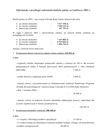 Informacja o przebiegu wykonania budżetu gminy za I półrocze 2005 r.