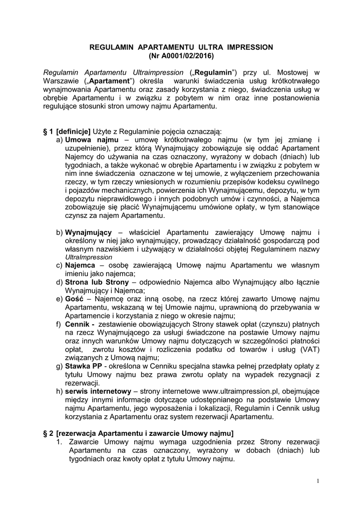 REGULAMIN APARTAMENTU ULTRA IMPRESSION (Nr A0001/02/2016) Regulamin Apartamentu Ultraimpression („Regulamin”) przy ul. Mostowej w Warszawie („Apartament”) określa warunki świadczenia usług krótkotrwałego wynajmowania Apartamentu oraz zasady korzystania z niego, świadczenia usług w obrębie Apartamentu i w związku z pobytem w nim oraz inne postanowienia regulujące stosunki stron umowy najmu Apartamentu. § 1 [definicje] Użyte z Regulaminie pojęcia oznaczają: a) Umowa najmu – umowę krótkotrwałego najmu (w tym jej zmianę i uzupełnienie), przez którą Wynajmujący zobowiązuje się oddać Apartament Najemcy do używania na czas oznaczony, wyrażony w dobach (dniach) lub tygodniach, a także wykonać w obrębie Apartamentu i w związku z pobytem w nim inne świadczenia oznaczone w tej umowie, z wyłączeniem przechowania rzeczy, w tym rzeczy wniesionych w rozumieniu przepisów kodeksu cywilnego i pojazdów mechanicznych, powierzenia ich Wynajmującemu, depozytu, w tym depozytu nieprawidłowego i innych podobnych umów i czynności, a Najemca zobowiązuje się płacić Wynajmującemu umówione opłaty, w tym stanowiące czynsz za najem Apartamentu. b) Wynajmujący – właściciel Apartamentu zawierający Umowę najmu i określony w niej jako wynajmujący, prowadzący działalność gospodarczą pod własnym nazwiskiem i używający w działalności objętej Regulaminem nazwy UltraImpression c) Najemca – osobę zawierającą Umowę najmu Apartamentu we własnym imieniu jako najemca; d) Strona lub Strony – odpowiednio Najemca albo Wynajmujący albo łącznie Wynajmujący i Najemca; e) Gość – Najemcę oraz inną osobę, na rzecz której zawarto Umowę najmu Apartamentu, wskazaną w tej Umowie najmu, uprawnioną do przebywania w Apartamencie i korzystania z niego w okresie najmu; f) Cennik - zestawienie obowiązujących Strony stawek opłat (czynszu) płatnych na rzecz Wynajmującego za usługi świadczone na postawie Umowy najmu oraz innych warunków Umowy najmu dotyczących w szczególności płatności opłat, zwrotu kosztów i rozliczenia podatku od towarów i usług (VAT) związanych z Umową najmu; g) Stawka PP - określona w Cenniku specjalna stawka pełnej przedpłaty opłaty z tytułu Umowy najmu bez prawa zwrotu opłaty na wypadek rezygnacji z rezerwacji. h) serwis internetowy – strony internetowe www.ultraimpression.pl, obejmujące między innymi informacje dotyczące udostępnianego na podstawie Umowy najmu Apartamentu, jego wyposażenia i lokalizacji, Regulamin i Cennik usług korzystania z Apartamentu oraz system rezerwacji Apartamentu. § 2 [rezerwacja Apartamentu i zawarcie Umowy najmu] 1. Zawarcie Umowy najmu wymaga uzgodnienia przez Strony rezerwacji Apartamentu na czas oznaczony, wyrażony w dobach (dniach) lub tygodniach oraz kwoty opłat z tytułu Umowy najmu. 1 2. Rezerwacja Apartamentu przez Najemcę następuje - o ile została uzgodniona z Wynajmującym - za pośrednictwem serwisu internetowego poprzez wypełnienie i wysłanie elektronicznego formularza rezerwacyjnego albo w inny sposób, w szczególności, ustnie, telefonicznie, za pośrednictwem poczty elektronicznej. 3. Warunki Umowy najmu, w tym opłaty (czynsz) z tego tytułu, określają Regulamin oraz Cennik dostępne w serwisie internetowym oraz przesłane Najemcy drogą elektroniczną w czasie zawarcia, zmiany lub uzupełnienia Umowy najmu, stanowiące integralną część Umowy najmu, a zawarcie, zmiana lub uzupełnienie Umowy najmu oznacza wyrażenie przez Najemcę zgody na Regulamin i Cennik. 4. Niniejszy Regulamin wiąże Strony, o ile Umowa najmu nie stanowi inaczej; w zakresie odmiennie uzgodnionym przez Strony, w miejsce postanowień Regulaminu zastosowanie mają odpowiednie postanowienia Umowy najmu. 5. Jeżeli z postanowienia Regulaminu lub Cennika wynika, że odnosi się on do okoliczności, które mogą wystąpić po zakończeniu Umowy najmu, w tym po wypowiedzeniu Umowy najmu, rezygnacji z rezerwacji Apartamentu lub rozwiązania umowy najmu w inny sposób, postanowienie to obowiązuje nadal, pomimo zakończenia Umowy najmu. 6. Niezwłocznie po zawarciu, zmianie i uzupełnieniu Umowy najmu na odległość lub poza lokalem przedsiębiorstwa Wynajmujący prześle Najemcy drogą elektroniczną potwierdzenie treści tej umowy wraz z Regulaminem i Cennikiem. Najemca podpisze i prześle Wynajmującemu pocztą elektroniczną dokument potwierdzający treść tej Umowy najmu wraz z Regulaminem i Cennikiem. 7. Najemca gwarantuje, że podczas pobytu w Apartamencie i jego otoczeniu Gość, osoba towarzysząca, zatrudniona lub zaproszona przez Najemcę lub Gościa będzie stosować niniejszy Regulamin, w szczególności w zakresie regulującym czas pobytu w Apartamencie (§ 4), zasady korzystania z niego (§ 5)oraz zasady ochrony mienia(§ 6). 8. Bez wyznaczania Najemcy dodatkowego terminu do zapłaty, Wynajmujący może od Umowy najmu odstąpić w całości lub w części zawsze, gdy Najemca opóźnia się z zapłatą opłaty na poczet Umowy najmu, w szczególności gdy Wynajmujący jej nie otrzymał w całości siedem (7) dni przed określonym w rezerwacji pierwszym dniem pobytu w Apartamencie. 9. Najemcy nie przysługuje prawo odstąpienia od Umowy najmu. 10. Najemca może wypowiedzieć Umowę najmu i zrezygnować z rezerwacji Apartamentu, w tym z rezerwacji dodatkowych świadczeń wykonywanych w obrębie Apartamentu, w związku z pobytem w nim, wyłącznie w przypadkach i w zakresie przewidzianym w niniejszym Regulaminie. 11. Umowa najmu wygasa, jeżeli Wynajmujący nie otrzymał w terminie opłaty (czynszu) co najmniej za pierwszą dobę najmu Apartamentu. § 3 [opłata za Apartament] 1. Poza przypadkami określonymi w ustępie 2 niniejszego Paragrafu, opłaty z tytułu Umowy najmu Najemca obowiązany jest zapłacić w całości „z góry” za cały okres określonego w rezerwacji pobytu w dwóch (2) równych ratach: 2 1.1. pierwsza rata w wysokości 50% całej opłaty na