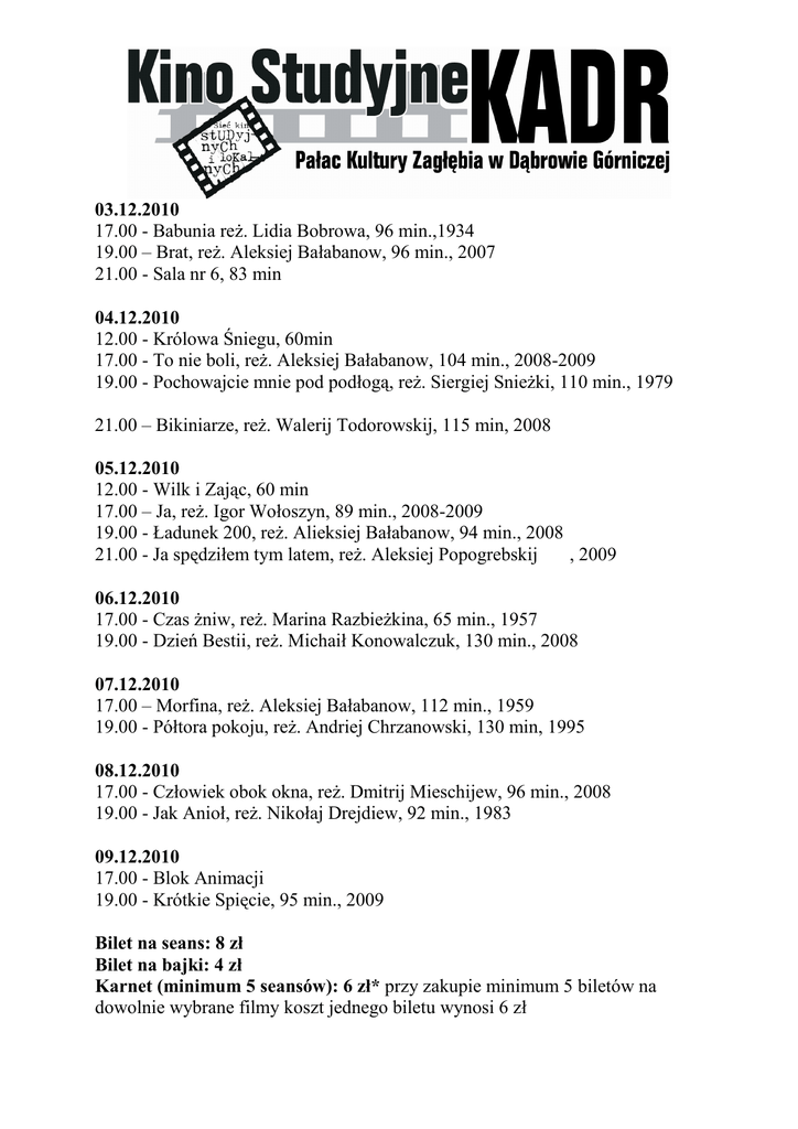 03.12.2010 17.00 - Babunia reŜ. Lidia Bobrowa, 96 min.,1934 19.00 – Brat, reŜ. Aleksiej Bałabanow, 96 min., 2007 21.00 - Sala nr 6, 83 min 04.12.2010 12.00 - Królowa Śniegu, 60min 17.00 - To nie boli, reŜ. Aleksiej Bałabanow, 104 min., 2008-2009 19.00 - Pochowajcie mnie pod podłogą, reŜ. Siergiej SnieŜki, 110 min., 1979 21.00 – Bikiniarze, reŜ. Walerij Todorowskij, 115 min, 2008 05.12.2010 12.00 - Wilk i Zając, 60 min 17.00 – Ja, reŜ. Igor Wołoszyn, 89 min., 2008-2009 19.00 - Ładunek 200, reŜ. Alieksiej Bałabanow, 94 min., 2008 21.00 - Ja spędziłem tym latem, reŜ. Aleksiej Popogrebskij , 2009 06.12.2010 17.00 - Czas Ŝniw, reŜ. Marina RazbieŜkina, 65 min., 1957 19.00 - Dzień Bestii, reŜ. Michaił Konowalczuk, 130 min., 2008 07.12.2010 17.00 – Morfina, reŜ. Aleksiej Bałabanow, 112 min., 1959 19.00 - Półtora pokoju, reŜ. Andriej Chrzanowski, 130 min, 1995 08.12.2010 17.00 - Człowiek obok okna, reŜ. Dmitrij Mieschijew, 96 min., 2008 19.00 - Jak Anioł, reŜ. Nikołaj Drejdiew, 92 min., 1983 09.12.2010 17.00 - Blok Animacji 19.00 - Krótkie Spięcie, 95 min., 2009 Bilet na seans: 8 zł Bilet na bajki: 4 zł Karnet (minimum 5 seansów): 6 zł* przy zakupie minimum 5 biletów na dowolnie wybrane filmy koszt jednego biletu wynosi 6 zł