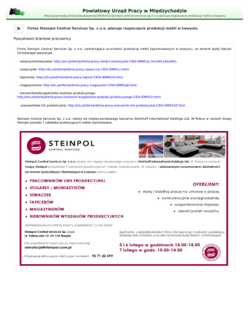 Powiatowy Urząd Pracy w Międzychodzie http://pupmiedzychod.pl/wydarzenie/165/firma-steinpol-central-services-sp-z-o-o-planuje-rozpoczecie-produkcji-mebli-w-lowyniu Firma Steinpol Central Services Sp. z o.o. planuje rozpoczęcie produkcji mebli w Łowyniu Poszukiwani branżowi pracownicy Firma Steinpol Central Services Sp. z o.o. zamierzająca uruchomić produkcję mebli tapicerowanych w Łowyniu, na terenie byłej fabryki Christianapol poszukuje: - stolarzy/montażystów: http://olx.pl/oferta/oferta-pracy-stolarz-montazysta-CID4-ID8M1aL.html#fc1deafd51, - szwaczy/ek: http://olx.pl/oferta/oferta-pracy-szwacz-ka-CID4-ID8M1cr.html, - tapicerów: http://olx.pl/oferta/oferta-pracy-tapicer-CID4-ID8M1e3.html, - magazynierów: http://olx.pl/oferta/oferta-pracy-magazynier-CID4-ID8M1g9.html, - kierowników/brygadzistów wydziału produkcyjnego: http://olx.pl/oferta/oferta-pracy-kierownik-brygadzista-wydzialu-produkcyjnego-CID4-ID8M1lz.html, - pracowników linii produkcyjnej: http://olx.pl/oferta/oferta-pracy-pracownik-linii-produkcyjnej-CID4-ID8M14Z.html. Steinpol Central Services Sp. z o.o. należy do międzynarodowego koncernu Steinhoff International Holdings Ltd. W Polsce w ramach Grupy Steinpol posiada 7 zakładów produkujących meble tapicerowane.