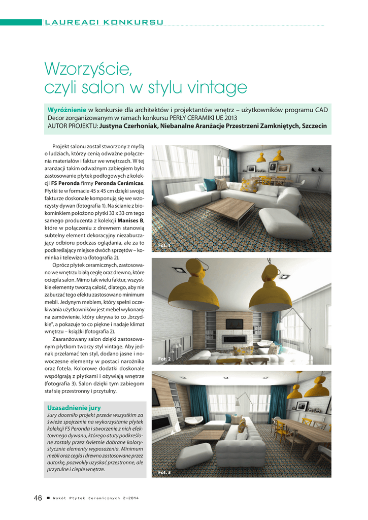LAUREACI KONKURSU Wzorzyście, czyli salon w stylu vintage Wyróżnienie w konkursie dla architektów i projektantów wnętrz – użytkowników programu CAD Decor zorganizowanym w ramach konkursu PERŁY CERAMIKI UE 2013 AUTOR PROJEKTU: Justyna Czerhoniak, Niebanalne Aranżacje Przestrzeni Zamkniętych, Szczecin Projekt salonu został stworzony z myślą o ludziach, którzy cenią odważne połączenia materiałów i faktur we wnętrzach. W tej aranżacji takim odważnym zabiegiem było zastosowanie płytek podłogowych z kolekcji FS Peronda firmy Peronda Cerámicas. Płytki te w formacie 45 x 45 cm dzięki swojej fakturze doskonale komponują się we wzorzysty dywan (fotografia 1). Na ścianie z biokominkiem położono płytki 33 x 33 cm tego samego producenta z kolekcji Manises B, które w połączeniu z drewnem stanowią subtelny element dekoracyjny niezaburzający odbioru podczas oglądania, ale za to podkreślający miejsce dwóch sprzętów – kominka i telewizora (fotografia 2). Oprócz płytek ceramicznych, zastosowano we wnętrzu białą cegłę oraz drewno, które ociepla salon. Mimo tak wielu faktur, wszystkie elementy tworzą całość, dlatego, aby nie zaburzać tego efektu zastosowano minimum mebli. Jedynym meblem, który spełni oczekiwania użytkowników jest mebel wykonany na zamówienie, który ukrywa to co brzyd" kie", a pokazuje to co piękne i nadaje klimat wnętrzu – książki (fotografia 2). Zaaranżowany salon dzięki zastosowanym płytkom tworzy styl vintage. Aby jednak przełamać ten styl, dodano jasne i nowoczesne elementy w postaci narożnika oraz fotela. Kolorowe dodatki doskonale współgrają z płytkami i ożywiają wnętrze (fotografia 3). Salon dzięki tym zabiegom stał się przestronny i przytulny. Fot. 1 Fot. 2 Uzasadnienie jury Jury doceniło projekt przede wszystkim za świeże spojrzenie na wykorzystanie płytek kolekcji FS Peronda i stworzenie z nich efektownego dywanu, którego atuty podkreślone zostały przez świetnie dobrane kolorystycznie elementy wyposażenia. Minimum mebli oraz cegła i drewno zastosowane przez autorkę, pozwoliły uzyskać przestronne, ale przytulne i ciepłe wnętrze. 46 n Wokół Płytek Ceramicznych 2-2014 Fot. 3