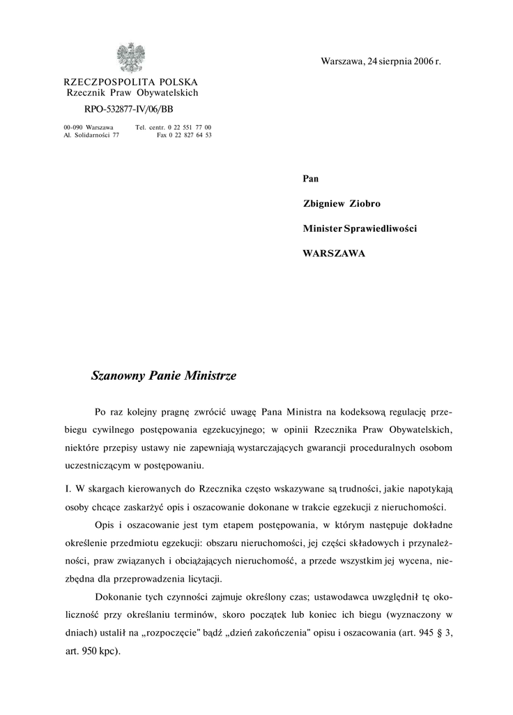 Warszawa, 24 sierpnia 2006 r. RZECZPOSPOLITA POLSKA Rzecznik Praw Obywatelskich RPO-532877-IV/06/BB 00-090 Warszawa Al. Solidarności 77 Tel. centr. 0 22 551 77 00 Fax 0 22 827 64 53 Pan Zbigniew Ziobro Minister Sprawiedliwości WARSZAWA Szanowny Panie Ministrze Po raz kolejny pragnę zwrócić uwagę Pana Ministra na kodeksową regulację przebiegu cywilnego postępowania egzekucyjnego; w opinii Rzecznika Praw Obywatelskich, niektóre przepisy ustawy nie zapewniają wystarczających gwarancji proceduralnych osobom uczestniczącym w postępowaniu. I. W skargach kierowanych do Rzecznika często wskazywane są trudności, jakie napotykają osoby chcące zaskarżyć opis i oszacowanie dokonane w trakcie egzekucji z nieruchomości. Opis i oszacowanie jest tym etapem postępowania, w którym następuje dokładne określenie przedmiotu egzekucji: obszaru nieruchomości, jej części składowych i przynależności, praw związanych i obciążających nieruchomość, a przede wszystkim jej wycena, niezbędna dla przeprowadzenia licytacji. Dokonanie tych czynności zajmuje określony czas; ustawodawca uwzględnił tę okoliczność przy określaniu terminów, skoro początek lub koniec ich biegu (wyznaczony w dniach) ustalił na „rozpoczęcie" bądź „dzień zakończenia" opisu i oszacowania (art. 945 § 3, art. 950 kpc). O terminie opisu i oszacowania komornik zawiadamia znanych mu uczestników (art. 945 § 1 kpc) - w praktyce, komornik zawiadamia uczestników o terminie rozpoczęcia opisu i oszacowania, z oczywistych względów nie jest możliwe określenie w tym momencie dokładnego czasu jego trwania. Uczestnicy postępowania nie są więc zawiadamiani o poszczególnych, czysto technicznych czynnościach wyceny i opisu (a ściślej, o ich terminie), co nie budzi wszakże zastrzeżeń: zawiadomienie stron o czynności komornika służy przecież temu, aby strony mogły w niej uczestniczyć, co niemożliwe jest np. przy sporządzeniu pisemnej opinii biegłego. Służy również temu, aby strony mogły czynność tę zaskarżyć, i w ten sposób kształtować przebieg postępowania. Tymczasem opis i oszacowanie, pomimo swojego rozciągnięcia w czasie, w sensie procesowym są jedną czynnością, i właśnie integralnie całej tej czynności dotyczy więc ewentualna skarga. Niemniej jednak, na analogicznych zasadach, stronom postępowania nie jest znany dokładny termin u k o ń c z e n i a opisu i oszacowania, co jednak trudno zaakceptować. Zgodnie bowiem z art. 950 kpc, termin do zaskarżenia opisu i oszacowania liczy się od dnia jego ukończenia. W efekcie, strony postępowania o dacie zakończenia opisu i oszacowania dowiadują się zwykle w sposób przypadkowy, bardzo często nie mogą więc w ustawowym terminie zaskarżyć czynności komornika. Rzecznik Praw Obywatelskich w badanych sprawach spotkał się także z inną praktyką: strony postępowania egzekucyjnego dowiadywały się o zakończeniu czynności z doręczonego im protokołu opisu i oszacowania. Nie jest do końca jasna podstawa doręczenia im takiego protokołu, najwyraźniej zakończenie opisu i oszacowania traktowane jest tutaj jako odrębna czynność komornika, o której zawiadomienie następuje w trybie art. 763 kpc. Jednak nawet ta korzystna dla stron postępowania interpretacja (zakładająca obowiązek zawiadomienia o zakończeniu opisu i oszacowania) nie pozwala im skutecznie zaskarżyć czynności. Z reguły informacja o czynności dociera do nich już po upływie terminu, którego początek biegu wyznaczony jest przez art. 950 kpc. W literaturze przedmiotu istnieje także pogląd, że komornik powinien zawiadamiać strony o z a k o ń c z e n i u opisu i oszacowania nieruchomości z wyprzedzeniem, a podstawą do tego zawiadomienia jest art. 945 § 1 kpc (A. Cudak Termin do wniesienia skargi na czynności komornika Przegląd Sądowy z 1998 r., nr 3, s. 50) - co jednak nie znajduje odzwierciedlenia w praktyce komorniczej. Dodatkowo, jest to pogląd o tyle wątpliwy, iż - j a k była o tym mowa wyżej - opis i oszacowanie jest wielofazową, jednak integralną w sensie procesowym czynnością komornika. Natomiast zakończenie opisu i oszacowania nieruchomości sprowadza się do podpisania protokołu czynności (A. Cudak Termin... op cit. s. 49, O. Marcewicz w: A. Jakubecki (red.) Kodeks postępowania cywilnego. Praktyczny komentarz Kraków 2005), trudno więc zawiadamiać stronę o tym z wyprzedzeniem. Trudno też konstruować skargę na „zakończenie opisu i oszacowania", co najlepiej świadczy o tym, że nie jest to odrębna czynność postępowania. Podsumowując: ani z art. 763, ani z art. 945 § 1 kpc nie da się wywieść nakazu zawiadomienia strony o zakończeniu opisu i oszacowania; strona jest zawiadamiana na podstawie art. 945 § 1 kpc jedynie o rozpoczęciu tej czynności (najczęściej jest to informacja o „przystąpieniu do opisu i oszacowania"). Trudno także przyjąć, iż samoistną podstawę do zawiadomienia stanowi tutaj art. 950 kpc, nawet jednak w takim wypadku, strona dowiaduje się o zakończeniu opisu i oszacowania z reguły po jego dokonaniu, co nie wpływa na bieg terminu do zaskarżenia czynności komornika. W efekcie, strona postępowania bądź nic nie wie o zakończeniu opisu i oszacowania, bądź dowiaduje się o nim po upływie terminu określonego w art. 950 kpc. Teoretycznie, strona może się ubiegać o przywrócenie terminu do wniesienia skargi, jednak - w opinii Rzecznika Praw Obywatelskich - problematyczna jest sama konstrukcja przewidziana w regulacji kodeksu postępowania cywilnego. Wydaje się, że właściwa byłaby regulacja, nakładająca na komornika explicite obowiązek zawiadomienia stron o ukończeniu opisu i oszacowania, oraz inna konstrukcja art. 950 kpc: a mianowicie, początkiem biegu terminu do zaskarżenia byłby dzień doręczenia zawiadomienia o ukończeniu opisu i oszacowania. Dotychczasowa regulacja ustawowa prowadzi do wielu nieporozumień i odmiennych