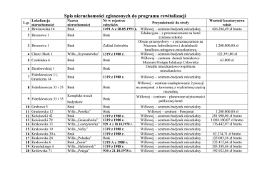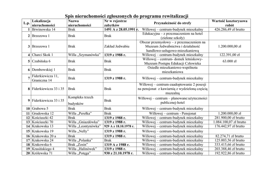 Spis nieruchomości zgłoszonych do programu rewitalizacji Lokalizacja L.p. nieruchomości 1 Brwinowska 14 Nazwa nieruchomości Brak 2 Brzozowa 1 Brak 3 Brzozowa 1 Brak 4 Charci Skok 1 Willa „Szymanówka” 5 Czubińska 6 Brak 6 Dembowskiej 1 Brak Nr w rejestrze Przynależność do strefy zabytków 1491 A z 28.05.1991 r. Willowej – centrum-budynek mieszkalny Edukacyjna – z przeznaczeniem na hotel Brak (zielone szkoły) Obszar przemysłowy – z przeznaczeniem na Zakład Jedwabiu Muzeum Jedwabnictwa i działalność handlowo-usługowo-mieszkaniową Willowej – centrum-budynek mieszkalny 1319 z 1988 r. Willowej – centrum- domek letniskowyBrak Muzeum Postępu Edukacji Człowieka Osiedle mieszkaniowe-wspólnota Brak mieszkaniowa Fiderkiewicza 11, Graniczna 14 Brak 1319 z 1988 r. 8 Fiderkiewicza 33 i 35 Brak Brak 7 9 Fiderkiewicza 33 i 35 10 11 12 13 14 15 16 17 18 19 20 Grabowa 5 Grudowska 12 Kościuszki 42 Kościuszki 70 Krakowska 13 Krakowska 19 Krakowska 20 a Krakowska 24 Krakowska 6 Krasińskiego 4 Królewska 71 Kompleks trzech budynków Brak Willa „Perełka” Brak Willa „Gniazdówka” Willa „Leontynówka” Willa „Nelly” Brak Willa „Polanka” Brak „Zosin” Willa „Halinówek” Willa „Potęga” Brak Brak Brak 1319 z 1988 r. 1319 z 1988 r. 929 A z 18.10.1978 r. 1319 z 1988 r. 1319 z 1988 r. Brak 1319 A z 1988 r. 1319 z 1988 r. 930 z 21.10.1978 r. Wartość kosztorysowa robót 426.286,49 zł brutto 1.200.000,00 zł 122.391,00 zł 63.000 zł Willowej – centrum-budynek mieszkalny Willowej – centrum-zaadoptowanie 2 posesji na pensjonat z kawiarnią z wydzieloną częścią muzealną Willowej – centrum – planowane:użyteczności publicznej-hotel Willowej – centrum-budynek mieszkalny Willowej – centrum - Pensjonat Willowej – centrum-budynek mieszkalny Willowej – centrum-budynek mieszkalny Willowej – centrum-budynek mieszkalny Willowej – centrum-budynek mieszkalny Willowej – centrum-budynek mieszkalny Willowej – centrum-budynek mieszkalny Willowej – centrum-budynek mieszkalny Willowej – centrum-budynek mieszkalny Willowej – centrum-budynek mieszkalny 1.200.000,00 zł 281.900,00 zł brutto 1.084.100,07 zł brutto 176.442,97 zł brutto 82.274,71 zł brutto 125.003,56 zł brutto 333.415,66 zł brutto 203.388,46 zł brutto 192.922,86 zł brutto 22 Królowej Jadwigi 21 23 Królowej Jadwigi 5 24 Krzywa 10 Brak Willa „Borówka” Willowej – centrum Użyteczności publicznej-budynek mieszkalny Willowej – centrum-budynek mieszkalny 1319 z 1988 r. Willowej – centrum-budynek mieszkalny 931a z 21.10.1978 r. Willa „Józefinka” 1319 z 1988 r. Willowej – centrum-budynek mieszkalny Mickiewicza 10 Mickiewicza 3 Mickiewicza 4 Mickiewicza 7 Nowowiejska 19 Willa „Matulinek” Brak Willa „Emanów” Brak Willa „Przydroże” 1190 z 13.08.1981 Brak 932 z 21.10.1978 r Brak Brak 30 Okopy Górne 9 Willa „Jutrzenka” 1319 z 1988 r. 31 Okólna 11 Brak 1319 z 1988 r. 32 Okólna 21/23 Brak Brak 33 Piasta 10 34 Piasta 12 Brak Willa „Pilawin” Brak 1319 z 1988 r. 35 Piasta 5 Brak Brak 36 Piasta 10b 37 Piłsudskiego 22 Willa „Lidia” Brak Willowej – centrum-budynek mieszkalny Willowej-centrum-budynek mieszkalny Willowej – centrum-budynek mieszkalny Willowej – centrum-budynek mieszkalny Willowej – centrum-budynek mieszkalny Willowej – centrum-gabinet neurologopedyczny Willowej – centrum-budynek mieszkalny Willowej – centrum-baza noclegowa z wyżywieniem Willowej – centrum-budynek mieszkalny Willowej – centrum-budynek mieszkalny Użyteczności publicznejDom rehabilitacyjno-opiekuńczy Willowej – centrum-budynek mieszkalny Willa „Mieciu” 1319 z 1988 r. Willowej – centrum-budynek mieszkalny 38 Piłsudskiego 28 39 Piłsudskiego 31 40 Podgórna 31 41 Podleśna 83 42 Polna 31 43 Prosta 7 44 Sienkiewicza 5 Brak 1319 z 1988 r. Willowej – centrum-dom towarowo-handlowy Willa „Kaprys” Willa „Stenia” Brak Brak Brak Willa „Ostromir” 1319 z 1988 r. 1319 z 1988 r. Brak Brak 1319 z 1988 r. 933a z 26.10.1978 r. Willowej – centrum-budynek mieszkalny Willowej – centrum-budynek mieszkalny Willowej – centrum-budynek mieszkalny Willowej – centrum-budynek mieszkalny Willowej – centrum-budynek mieszkalny Willowej – centrum-budynek mieszkalny 45 Słowackiego 1 46 Słowackiego 11 Willa „Borowin” 1319 z 1988 r. Willowej – centrum-budynek mieszkalny Willa „Lusia” 1319 z 1988 r. Willowej – centrum-budynek mieszkalny 21 Królowej Jadwigi 2/4a Willa „Bojanówka” 25 26 27 28 29 1319 z 1988 r. 197.304,94 zł brutto 312.067,59 zł brutto 105.342,93 zł netto 941.500,00 zł netto 153.492,50 zł brutto 22.723,00 zł brutto 170.500,00 zł 377.500,00 zł 138.877,76 zł brutto 124.731,00 zł 277.107,81 zł brutto 35.260 zł netto 172.622,83 zł 132.439,34 zł 21.989,05 zł 289.282,52 zł Brak „Heligen” Willa „Dalmacja” Willa „Waleria” Brak 1319 z 1988 r. 1487 z 27.05.1991 r. 1202 z 04.12.1982 r. 1319 z 1988 r. 51 Warszawska 25 Willa „Hala” 1319 z 1988 r. 52 Warszawska 31 53 Warszawska 40 Brak Willa „Lunia” Brak Brak 54 Warszawska 52 Willa „Księżanka” Brak Brak Brak Willa „Bożymówka” Brak 1319 z 1988 r. 1319 z 1988 r. Brak 1319 z 1988 r. 59 Zaciszna 14 Brak 1319 z 1988 r. 60 Żabie Oczko 1 Brak 1319 z 1988 r. 47 48 49 50 55 56 57 58 Słowackiego 19 Spacerowa 16 Spacerowa 20/22 Starodęby 5 Wojska Polskiego 17 Wojska Polskiego 73 Wspólna 10 Wspólna 16 Willowej – centrum-budynek mieszkalny Willowej – centrum-budynek mieszkalny Willowej – centrum-Centrum Kultury Willowej – centrum-budynek mieszkalny Willowej – centrum-budynek mieszkalnousługowo-handlowy Willowej – centrum-pawilon handlowy Willowej – centrum-budynek mieszkalny Willowej – centrum-adaptacja parteru pod działalność oświatowo-wychowawczą i kulturalną Willowej – centrum-budynek mieszkalny Willowej – centrum-budynek mieszkalny Willowej – centrum-budynek mieszkalny Willowej – centrum-budynek