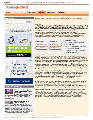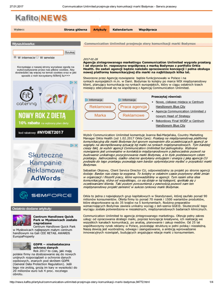 27.01.2017 Communication Unlimited przejmuje stery komunikacji marki Bodymax Serwis prasowy Strona główna Wybierz: Artykuły Kalendarium Współpraca Communication Unlimited przejmuje stery komunikacji marki Bodymax Wyszukiwarka: Szukaj W internecie 20170126 W serwisie Agencja zintegrowanego marketingu Communication Unlimited wygrała przetarg i od stycznia br. rozpoczyna współpracę z marką Bodymax z portfolio Orkla Health. Do zadań agencji będzie należało opracowanie koncepcji i pełna obsługa nowej platformy komunikacyjnej dla marki na najbliższych kilka lat. Korzystając z naszej strony wyrażasz zgodę na wykorzystywanie przez nas plików cookies. Aby dowiedzieć się więcej na temat cookies oraz w jaki sposób z nich korzystamy kliknij tu>>> Stworzone przez Agencję rozwiązanie będzie funkcjonowało w Polsce i na rynkach europejskich m.in. w Danii. Bodymax to kolejny po marce WIX międzynarodowy klient, planujący komunikację na rynkach europejskich, który w ciągu ostatnich trzech miesięcy zdecydował się na współpracę z Agencją Communication Unlimited. Przeczytaj również: Informacja Reklamowa Informacja Praca agencja Nowe, ciekawe miejsca w Centrum Handlowym Blue City Agencja Communication Unlimited z Marka Reklamowe nowym Head of Strategy Rekordowy Finał WOŚP w Centrum Handlowym Blue City Wybór Communication Unlimited komentuje Joanna BaśMarjańska, Country Marketing Manager Orkla Health (od 1.02.2017 Orkla Care): Przetarg na międzynarodową platformę komunikacyjną dla marki Bodymax był sporym wyzwaniem dla uczestniczących agencji ze względu na skomplikowaną sytuację tej marki na rynkach międzynarodowych. Tym bardziej cieszy fakt, że wybór agencji Communication Unlimited był jednogłośny. Wybrane rozwiązanie jest uniwersalne w kontekście międzynarodowym a jednocześnie pozwoli na budowanie unikalnego pozycjonowania marki Bodymax, a to było podstawowym celem przetargu. Jednocześnie, rzadko obecnie spotykany entuzjazm i energia z jaką agencja CU podeszła do tego przetargu pozwalają nam bardzo optymistycznie myśleć o przyszłości marki Bodymax. Sebastian Olszowy, Client Service Director CU, odpowiedzialny za projekt po stronie agencji dodaje: Bardzo nas cieszy ta wygrana. To kolejny w ostatnim czasie pozytywny efekt zmian w organizacji i filozofii pracy, które wprowadziliśmy w agencji. Tym razem silna idea komunikacyjna, różna od wszystkiego, co się dzieje w tej kategorii, spotkała się z oczekiwaniami klienta. Taki poziom porozumienia z pewnością pozwoli nam ten międzynarodowy projekt zamienić w sukces rynkowy marki Bodymax. Ostatnio dodane artykuły: Centrum Handlowe Quick Park w Mysłowicach zostało nagrodzone Centrum Handlowe Quick Park w Mysłowicach najlepszym małym centrum handlowym na Gali CEE RETAIL AWARDS EuropaProperty Orkla to jedna z największych grup kapitałowych w Skandynawii, której zaufało ponad 90 milionów konsumentów. Oferta firmy to ponad 70 marek i 1500 wariantów produktów, które eksportowane są do 35 krajów na 5 kontynentach. Rodzina preparatów wzmacniających Bodymax zawiera unikalny wyciąg z żeńszenia GGE®. Skuteczność tego wyciągu została potwierdzona w niezależnych, międzynarodowych badaniach klinicznych. Communication Unlimited to agencja zintegrowanego marketingu. Oferuje pełny zakres usług: od opracowania strategii marki, poprzez koncepcje kreatywne, ich realizację we wszystkich kanałach komunikacji, po analizę, planowanie i zakup mediów. Od 25 lat współtworzymy rynek reklamy w Polsce, pozostając strukturą w pełni polską i niezależną. Naszą dewizą jest wyobraźnia, odwaga i zaangażowanie, a ambicją wprowadzanie innowacyjnych rozwiązań, budujących angażujące relacje marki z konsumentem. GDPR – niedostateczna ochrona danych Rok 2017 to czas, jaki mają polskie firmy na dostosowanie się do nowych unijnych rozporządzeń o ochronie danych osobowych, znanych pod skrótem GDPR (General Data Protection Regulation). Jeśli tego nie zrobią, grożą im kary w wysokości do 20 milionów euro lub 4 proc. rocznego obrotu. http://news.kafito.pl/artykul/communicationunlimitedprzejmujesterykomunikacjimarkibodymax,94772.html 1/4