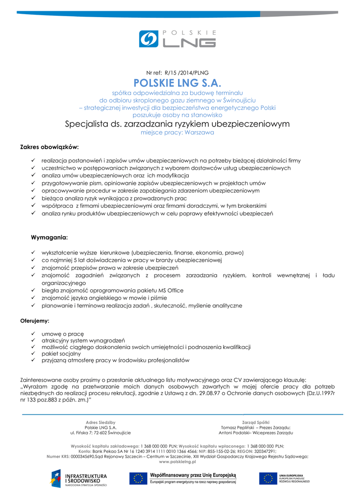 Nr ref: R/15 /2014/PLNG POLSKIE LNG S.A. spółka odpowiedzialna za budowę terminalu do odbioru skroplonego gazu ziemnego w Świnoujściu – strategicznej inwestycji dla bezpieczeństwa energetycznego Polski poszukuje osoby na stanowisko Specjalista ds. zarzadzania ryzykiem ubezpieczeniowym miejsce pracy: Warszawa Zakres obowiązków: realizacja postanowień i zapisów umów ubezpieczeniowych na potrzeby bieżącej działalności firmy uczestnictwo w postępowaniach związanych z wyborem dostawców usług ubezpieczeniowych analiza umów ubezpieczeniowych oraz ich modyfikacja przygotowywanie pism, opiniowanie zapisów ubezpieczeniowych w projektach umów opracowywanie procedur w zakresie zapobiegania zdarzeniom ubezpieczeniowym bieżąca analiza ryzyk wynikająca z prowadzonych prac współpraca z firmami ubezpieczeniowymi oraz firmami doradczymi, w tym brokerskimi analiza rynku produktów ubezpieczeniowych w celu poprawy efektywności ubezpieczeń Wymagania: wykształcenie wyższe kierunkowe (ubezpieczenia, finanse, ekonomia, prawo) co najmniej 5 lat doświadczenia w pracy w branży ubezpieczeniowej znajomość przepisów prawa w zakresie ubezpieczeń znajomość zagadnień związanych z procesem zarzadzania ryzykiem, organizacyjnego biegła znajomość oprogramowania pakietu MS Office znajomość języka angielskiego w mowie i piśmie planowanie i terminowa realizacja zadań , skuteczność, myślenie analityczne kontroli wewnętrznej i ładu Oferujemy: umowę o pracę atrakcyjny system wynagrodzeń możliwość ciągłego doskonalenia swoich umiejętności i podnoszenia kwalifikacji pakiet socjalny przyjazną atmosferę pracy w środowisku profesjonalistów Zainteresowane osoby prosimy o przesłanie aktualnego listu motywacyjnego oraz CV zawierającego klauzulę: „Wyrażam zgodę na przetwarzanie moich danych osobowych zawartych w mojej ofercie pracy dla potrzeb niezbędnych do realizacji procesu rekrutacji, zgodnie z Ustawą z dn. 29.08.97 o Ochronie danych osobowych (Dz.U.1997r nr 133 poz.883 z późn. zm.)” Adres Siedziby Polskie LNG S.A. ul. Fińska 7; 72-602 Świnoujście Zarząd Spółki Tomasz Pepliński – Prezes Zarządu; Antoni Podolski– Wiceprezes Zarządu Wysokość kapitału zakładowego: 1 368 000 000 PLN; Wysokość kapitału wpłaconego: 1 368 000 000 PLN; Konto: Bank Pekao SA Nr 16 1240 3914 1111 0010 1366 4566; NIP: 855-155-02-26; REGON: 320347291; Numer KRS: 0000345690,Sąd Rejonowy Szczecin – Centrum w Szczecinie, XIII Wydział Gospodarczy Krajowego Rejestru Sądowego; www.polskielng.pl Oferty prosimy przesyłać do dnia 30.09.2014 roku na e-mail: [email protected] z zaznaczeniem numeru referencyjnego w temacie wiadomości lub za pośrednictwem elektronicznego formularza aplikacyjnego znajdującego się na naszej stronie internetowej www.polskielng.pl Uprzejmie informujemy, że odpowiemy tylko na wybrane oferty. Strona 2 z 2