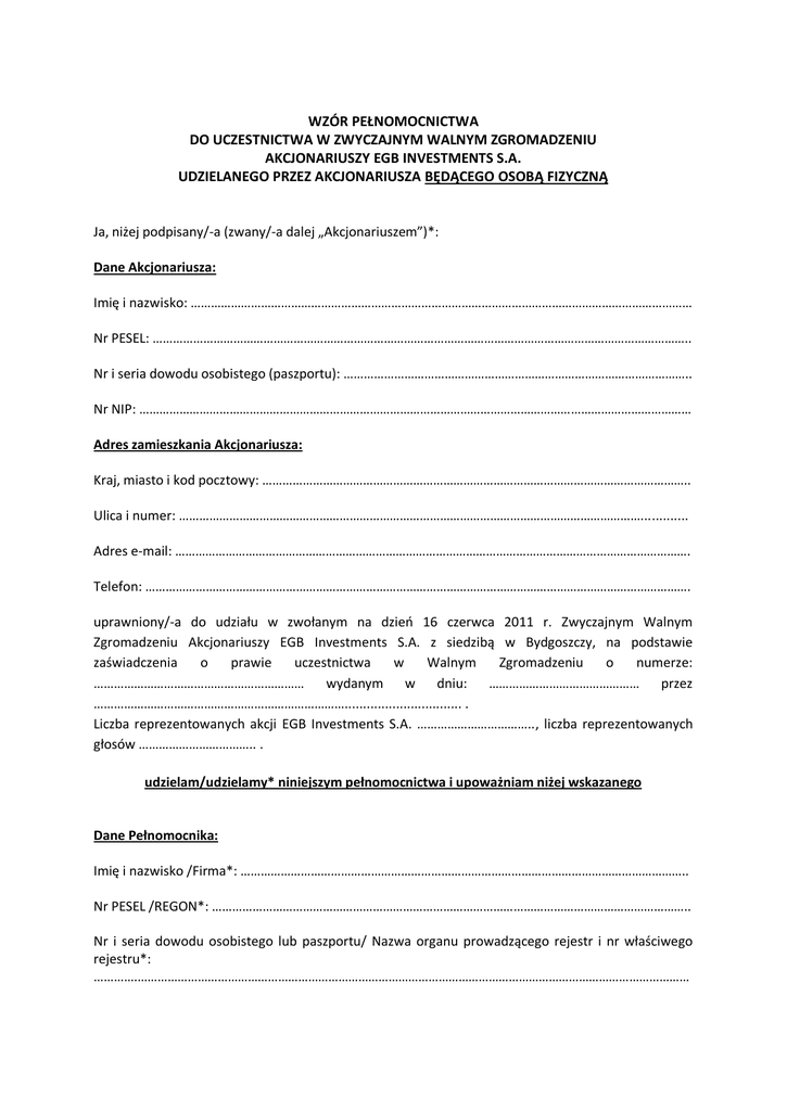 WZÓR PEŁNOMOCNICTWA DO UCZESTNICTWA W ZWYCZAJNYM WALNYM ZGROMADZENIU AKCJONARIUSZY EGB INVESTMENTS S.A. UDZIELANEGO PRZEZ AKCJONARIUSZA BĘDĄCEGO OSOBĄ FIZYCZNĄ Ja, niżej podpisany/-a (zwany/-a dalej „Akcjonariuszem”)*: Dane Akcjonariusza: Imię i nazwisko: …………………………………………………………………………………………………………………………………… Nr PESEL: …………………………………………………………………………………………………………………………………………….. Nr i seria dowodu osobistego (paszportu): ………………………………………………………………………………………….. Nr NIP: ………………………………………………………………………………………………………………………………………………… Adres zamieszkania Akcjonariusza: Kraj, miasto i kod pocztowy: ……………………………………………………………………………………………………………….. Ulica i numer: …………………………………………………………………………………………………………………………............. Adres e-mail: ………………………………………………………………………………………………………………………………………. Telefon: ………………………………………………………………………………………………………………………………………………. uprawniony/-a do udziału w zwołanym na dzieo 16 czerwca 2011 r. Zwyczajnym Walnym Zgromadzeniu Akcjonariuszy EGB Investments S.A. z siedzibą w Bydgoszczy, na podstawie zaświadczenia o prawie uczestnictwa w Walnym Zgromadzeniu o numerze: ……………………………………………………… wydanym w dniu: ……………………………………… przez …………………………………………………………………................................ . Liczba reprezentowanych akcji EGB Investments S.A. …………………………….., liczba reprezentowanych głosów …………………………….. . udzielam/udzielamy* niniejszym pełnomocnictwa i upoważniam niżej wskazanego Dane Pełnomocnika: Imię i nazwisko /Firma*: …………………………………………………………………………………………………………………….. Nr PESEL /REGON*: …………………………………………………………………………………………………………………………….. Nr i seria dowodu osobistego lub paszportu/ Nazwa organu prowadzącego rejestr i nr właściwego rejestru*: ………….………………………………………………………………………………………………………………………………………………… Nr NIP Pełnomocnika: ………………………………………………….……………………………………………………………………… Adres zamieszkania /siedziby* Pełnomocnika: Kraj, miasto i kod pocztowy: ……………………………………………………………………………………………………………….. Ulica i numer: …………………………………………………………………………………………………………………………............. Adres e-mail: ………………………………………………………………………………………………………………………………………. Telefon: ………………………………………………………………………………………………………………………………………………. do reprezentowania Akcjonariusza, uczestniczenia w imieniu i na rzecz Akcjonariusza oraz wykonywania prawa głosu na Zwyczajnym Walnym Zgromadzeniu Akcjonariuszy EGB Investments S.A. z siedzibą w Bydgoszczy, zwołanym na dzieo 16 czerwca 2011 roku na godz. 12:00 w Bydgoszczy, w Sali Rotariaoskiej Hotelu „Pod Orłem” przy ul. Gdaoskiej 14. Pełnomocnik uprawniony jest do wykonywania wszelkich uprawnieo Akcjonariusza wynikających z posiadanych przez Akcjonariusza akcji w trakcie wyżej wskazanego Walnego Zgromadzenia Akcjonariuszy EGB Investments S.A., a w szczególności do podpisania listy obecności, do udziału i zabierania głosu oraz do wykonywania prawa głosu w imieniu Akcjonariusza. Pełnomocnictwo jest ważne do dnia zakooczenia Zwyczajnego Walnego Zgromadzenia Spółki, które zostało zwołane na dzieo 16 czerwca 2011 roku. Pełnomocnik może/ nie może* udzielad dalszych pełnomocnictw. ________________________________________________ data, miejscowość i podpis Akcjonariusza (*niewłaściwe skreślid) Do pełnomocnictwa należy dołączyd oryginały albo kopie poświadczone za zgodnośd z oryginałem przez notariusza albo inny podmiot uprawniony do poświadczania dokumentów za zgodnośd z oryginałem albo w przypadku zgłoszenia w formie elektronicznej, skany w formacie PDF następujących dokumentów: 1) zaświadczenia/zaświadczeo wydanego/wydanych przez podmiot lub podmioty prowadzące rachunek lub rachunki papierów wartościowych Akcjonariusza potwierdzających fakt bycia Akcjonariuszem Spółki, 2) dowodu osobistego lub paszportu pozwalającego zidentyfikowad Akcjonariusza jako mocodawcę, 3) w przypadku pełnomocnika będącego osobą fizyczną – kopia jego dowodu osobistego lub paszportu, 4) w przypadku pełnomocnika innego niż osoba fizyczna - odpis z właściwego dla danego pełnomocnika rejestru albo odpis z właściwego dla danego pełnomocnika rejestru wraz z innym dokumentem potwierdzającym uprawnienia do reprezentacji tego pełnomocnika, a także kopia dowodu osobistego lub paszportu przedstawiciela/przedstawicieli pełnomocnika, 5) ewentualnie ciąg pełnomocnictw.