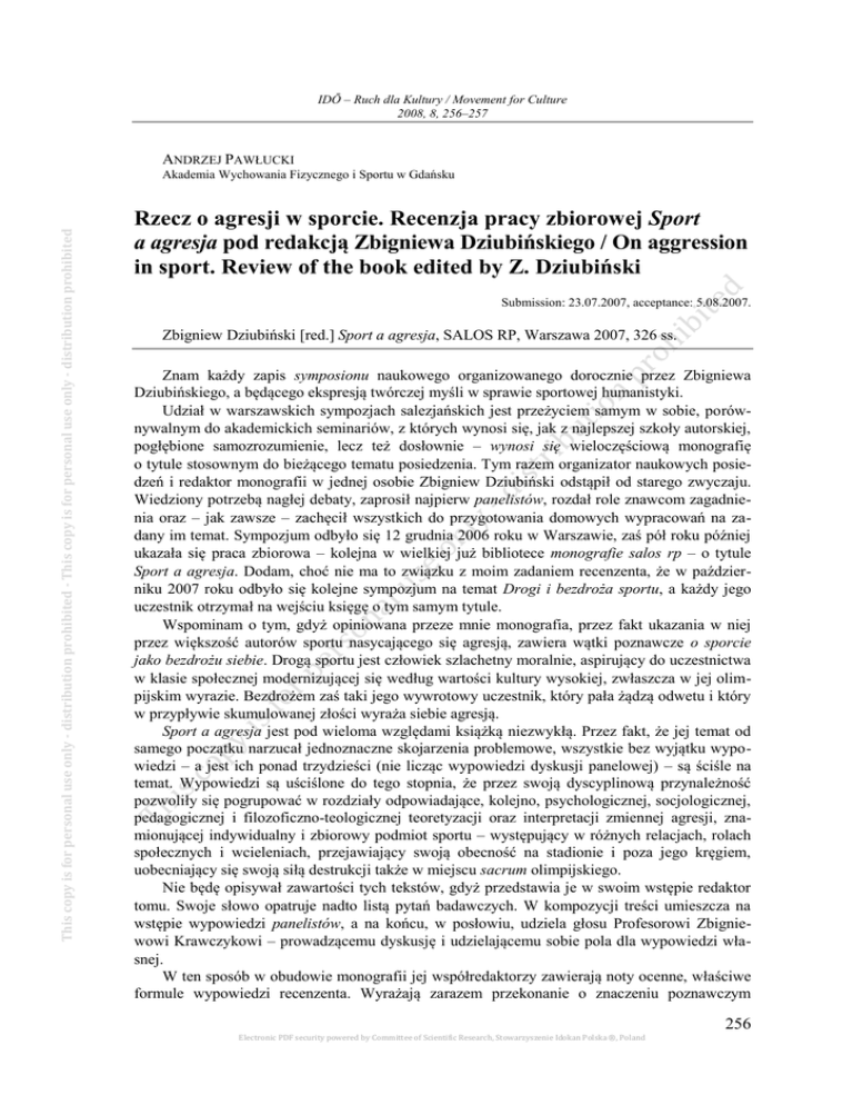 IDŌ – Ruch dla Kultury / Movement for Culture 2008, 8, 256–257 ANDRZEJ PAWŁUCKI This copy is for personal use only - distribution prohibited - This copy is for personal use only - distribution prohibited Akademia Wychowania Fizycznego i Sportu w Gdańsku Rzecz o agresji w sporcie. Recenzja pracy zbiorowej Sport a agresja pod redakcją Zbigniewa Dziubińskiego / On aggression in sport. Review of the book edited by Z. Dziubiński Submission: 23.07.2007, acceptance: 5.08.2007. Zbigniew Dziubiński [red.] Sport a agresja, SALOS RP, Warszawa 2007, 326 ss. Znam każdy zapis symposionu naukowego organizowanego dorocznie przez Zbigniewa Dziubińskiego, a będącego ekspresją twórczej myśli w sprawie sportowej humanistyki. Udział w warszawskich sympozjach salezjańskich jest przeżyciem samym w sobie, porównywalnym do akademickich seminariów, z których wynosi się, jak z najlepszej szkoły autorskiej, pogłębione samozrozumienie, lecz też dosłownie – wynosi się wieloczęściową monografię o tytule stosownym do bieżącego tematu posiedzenia. Tym razem organizator naukowych posiedzeń i redaktor monografii w jednej osobie Zbigniew Dziubiński odstąpił od starego zwyczaju. Wiedziony potrzebą nagłej debaty, zaprosił najpierw panelistów, rozdał role znawcom zagadnienia oraz – jak zawsze – zachęcił wszystkich do przygotowania domowych wypracowań na zadany im temat. Sympozjum odbyło się 12 grudnia 2006 roku w Warszawie, zaś pół roku później ukazała się praca zbiorowa – kolejna w wielkiej już bibliotece monografie salos rp – o tytule Sport a agresja. Dodam, choć nie ma to związku z moim zadaniem recenzenta, że w październiku 2007 roku odbyło się kolejne sympozjum na temat Drogi i bezdroża sportu, a każdy jego uczestnik otrzymał na wejściu księgę o tym samym tytule. Wspominam o tym, gdyż opiniowana przeze mnie monografia, przez fakt ukazania w niej przez większość autorów sportu nasycającego się agresją, zawiera wątki poznawcze o sporcie jako bezdrożu siebie. Drogą sportu jest człowiek szlachetny moralnie, aspirujący do uczestnictwa w klasie społecznej modernizującej się według wartości kultury wysokiej, zwłaszcza w jej olimpijskim wyrazie. Bezdrożem zaś taki jego wywrotowy uczestnik, który pała żądzą odwetu i który w przypływie skumulowanej złości wyraża siebie agresją. Sport a agresja jest pod wieloma względami książką niezwykłą. Przez fakt, że jej temat od samego początku narzucał jednoznaczne skojarzenia problemowe, wszystkie bez wyjątku wypowiedzi – a jest ich ponad trzydzieści (nie licząc wypowiedzi dyskusji panelowej) – są ściśle na temat. Wypowiedzi są uściślone do tego stopnia, że przez swoją dyscyplinową przynależność pozwoliły się pogrupować w rozdziały odpowiadające, kolejno, psychologicznej, socjologicznej, pedagogicznej i filozoficzno-teologicznej teoretyzacji oraz interpretacji zmiennej agresji, znamionującej indywidualny i zbiorowy podmiot sportu – występujący w różnych relacjach, rolach społecznych i wcieleniach, przejawiający swoją obecność na stadionie i poza jego kręgiem, uobecniający się swoją siłą destrukcji także w miejscu sacrum olimpijskiego. Nie będę opisywał zawartości tych tekstów, gdyż przedstawia je w swoim wstępie redaktor tomu. Swoje słowo opatruje nadto listą pytań badawczych. W kompozycji treści umieszcza na wstępie wypowiedzi panelistów, a na końcu, w posłowiu, udziela głosu Profesorowi Zbigniewowi Krawczykowi – prowadzącemu dyskusję i udzielającemu sobie pola dla wypowiedzi własnej. W ten sposób w obudowie monografii jej współredaktorzy zawierają noty ocenne, właściwe formule wypowiedzi recenzenta. Wyrażają zarazem przekonanie o znaczeniu poznawczym 256 Electronic PDF security powered by Committee of Scientific Research, Stowarzyszenie Idokan Polska ®, Poland This copy is for personal use only - distribution prohibited - This copy is for personal use only - distribution prohibited książki, ułatwiającym rozumienie przyczyn agresji w sporcie oraz konceptualizację nowych procesów badawczych. Podzielam ich przeświadczenie, że w wielu autorskich wypowiedziach można natknąć się na ożywcze źródła inspiracji, znaczące dla własnych wysiłków samozrozumienia, jak i poczynań sprawczych o znamionach edukacyjnych czy socjotechnicznych. Rzecz o agresji w sporcie, autorstwa wielu znakomitych pisarzy naukowych – zredagowana finezyjnie przez Zbigniewa Dziubińskiego – prowokuje zwłaszcza do zadania sobie samemu pytania o ontologicznej treści: o istotowe cechy sportu – pytania podszytego obawą odkrycia czegoś, co w samej strukturze elementarnej zjawiska musiałoby generować nieuniknienie destrukcyjną siłę agresji, wiodącą ku samozniszczeniu, oraz o treści antropologicznej – o naturę samego sportowca, tu z kolei wynikającego z niepokoju o jego „gen” moralności zbójeckiej, ujawniający się swoją siłą rażenia w każdej relacji konfrontacji. Na obydwa pytania odpowiadam, że nie ma takiej obawy. Dzięki lekturze zredagowanej przez Zbigniewa Dziubińskiego zacząłem raz jeszcze rozwiewać swoje wątpliwości (jedną z nich rozwiałem kiedyś w prawie sensu sportowego (2005), a inną w prawie pokoju olimpijskiego (2007). Agresja jest najstarszym wątkiem samowiedzy, jaki zna ludzkość. Nie istniał sport, a już na początku historii społecznej człowieka pojawiła się relacja pierworodnego zła, w której agresja była jego ekspresją (kiedy brat zabił brata). Najstarszy człowiek, usiłujący zrozumieć siebie, dramatycznie pytał o zło w sobie; pytał o agresję w sobie, o jej naturę i pochodzenie; budował poniekąd, jak potrafił, antropologię agresji, zawierając w niej odpowiedzi nigdy niedokończone. Pozostawił nam te pytania, ale i samowiedzę o agresji (choćby w jej teologicznym wydaniu), dzięki której człowiek sportu nowożytnego – świadomy s