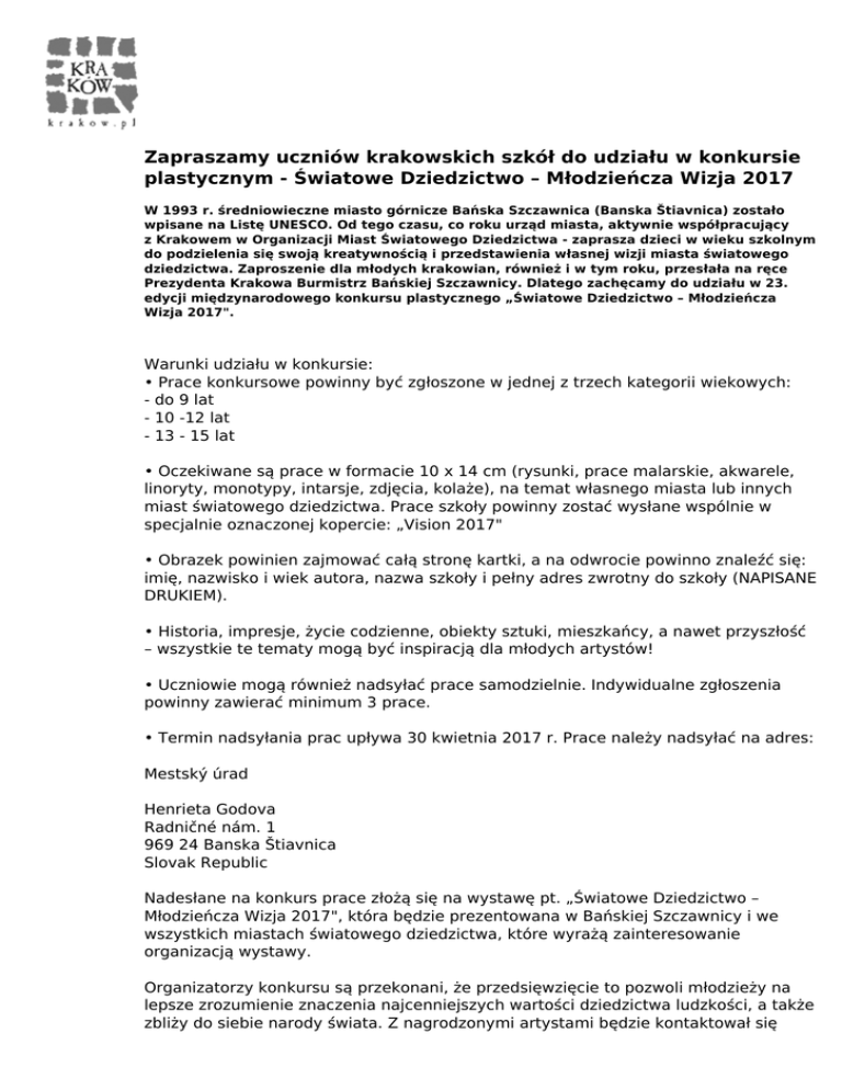 Zapraszamy uczniów krakowskich szkół do udziału w konkursie plastycznym - Światowe Dziedzictwo – Młodzieńcza Wizja 2017 W 1993 r. średniowieczne miasto górnicze Bańska Szczawnica (Banska Štiavnica) zostało wpisane na Listę UNESCO. Od tego czasu, co roku urząd miasta, aktywnie współpracujący z Krakowem w Organizacji Miast Światowego Dziedzictwa - zaprasza dzieci w wieku szkolnym do podzielenia się swoją kreatywnością i przedstawienia własnej wizji miasta światowego dziedzictwa. Zaproszenie dla młodych krakowian, również i w tym roku, przesłała na ręce Prezydenta Krakowa Burmistrz Bańskiej Szczawnicy. Dlatego zachęcamy do udziału w 23. edycji międzynarodowego konkursu plastycznego „Światowe Dziedzictwo – Młodzieńcza Wizja 2017". Warunki udziału w konkursie: • Prace konkursowe powinny być zgłoszone w jednej z trzech kategorii wiekowych: - do 9 lat - 10 -12 lat - 13 - 15 lat • Oczekiwane są prace w formacie 10 x 14 cm (rysunki, prace malarskie, akwarele, linoryty, monotypy, intarsje, zdjęcia, kolaże), na temat własnego miasta lub innych miast światowego dziedzictwa. Prace szkoły powinny zostać wysłane wspólnie w specjalnie oznaczonej kopercie: „Vision 2017" • Obrazek powinien zajmować całą stronę kartki, a na odwrocie powinno znaleźć się: imię, nazwisko i wiek autora, nazwa szkoły i pełny adres zwrotny do szkoły (NAPISANE DRUKIEM). • Historia, impresje, życie codzienne, obiekty sztuki, mieszkańcy, a nawet przyszłość – wszystkie te tematy mogą być inspiracją dla młodych artystów! • Uczniowie mogą również nadsyłać prace samodzielnie. Indywidualne zgłoszenia powinny zawierać minimum 3 prace. • Termin nadsyłania prac upływa 30 kwietnia 2017 r. Prace należy nadsyłać na adres: Mestský úrad Henrieta Godova Radničné nám. 1 969 24 Banska Štiavnica Slovak Republic Nadesłane na konkurs prace złożą się na wystawę pt. „Światowe Dziedzictwo – Młodzieńcza Wizja 2017", która będzie prezentowana w Bańskiej Szczawnicy i we wszystkich miastach światowego dziedzictwa, które wyrażą zainteresowanie organizacją wystawy. Organizatorzy konkursu są przekonani, że przedsięwzięcie to pozwoli młodzieży na lepsze zrozumienie znaczenia najcenniejszych wartości dziedzictwa ludzkości, a także zbliży do siebie narody świata. Z nagrodzonymi artystami będzie kontaktował się bezpośrednio Organizator konkursu – Urząd Miasta Bańskiej Szczawnicy. W latach ubiegłych nagrodzonych zostało wiele prac młodych krakowskich artystów. Wzorem ubiegłych lat zachęcamy dzieci i młodzież z Krakowa do udziału w konkursie! Powered by TCPDF (www.tcpdf.org)