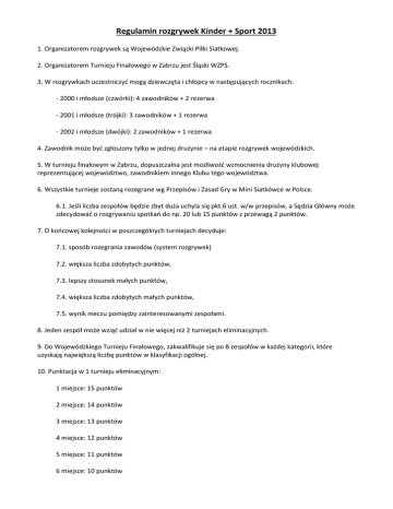 Regulamin rozgrywek Kinder + Sport 2013 1. Organizatorem rozgrywek są Wojewódzkie Związki Piłki Siatkowej. 2. Organizatorem Turnieju Finałowego w Zabrzu jest Śląski WZPS. 3. W rozgrywkach uczestniczyć mogą dziewczęta i chłopcy w następujących rocznikach: - 2000 i młodsze (czwórki): 4 zawodników + 2 rezerwa - 2001 i młodsze (trójki): 3 zawodników + 1 rezerwa - 2002 i młodsze (dwójki): 2 zawodników + 1 rezerwa 4. Zawodnik może być zgłoszony tylko w jednej drużynie – na etapie rozgrywek wojewódzkich. 5. W turnieju finałowym w Zabrzu, dopuszczalna jest możliwość wzmocnienia drużyny klubowej reprezentującej województwo, zawodnikiem innego Klubu tego województwa. 6. Wszystkie turnieje zostaną rozegrane wg Przepisów i Zasad Gry w Mini Siatkówce w Polsce. 6.1. Jeśli liczba zespołów będzie zbyt duża uchyla się pkt.6 ust. w/w przepisów, a Sędzia Główny może zdecydować o rozgrywaniu spotkań do np. 20 lub 15 punktów z przewagą 2 punktów. 7. O końcowej kolejności w poszczególnych turniejach decyduje: 7.1. sposób rozegrania zawodów (system rozgrywek) 7.2. większa liczba zdobytych punktów, 7.3. lepszy stosunek małych punktów, 7.4. większa liczba zdobytych małych punktów, 7.5. wynik meczu pomiędzy zainteresowanymi zespołami. 8. Jeden zespół może wziąć udział w nie więcej niż 2 turniejach eliminacyjnych. 9. Do Wojewódzkiego Turnieju Finałowego, zakwalifikuje się po 8 zespołów w każdej kategorii, które uzyskają największą liczbę punktów w klasyfikacji ogólnej. 10. Punktacja w 1 turnieju eliminacyjnym: 1 miejsce: 15 punktów 2 miejsce: 14 punktów 3 miejsce: 13 punktów 4 miejsce: 12 punktów 5 miejsce: 11 punktów 6 miejsce: 10 punktów 7 miejsce: 9 punktów 8 miejsce: 8 punktów 9 miejsce: 7 punktów 10 miejsce: 6 punktów 11 miejsce: 5 punktów 12 miejsce: 4 punktów 13 miejsce: 3 punkty 14 miejsce: 2 punkty 15 miejsce i dalsze: 1 punkt. 11. Dokumenty uprawniające do wzięcia udziału w turniejach: 11.1. ważne badania lekarskie lub zaświadczenie od lekarza pierwszego kontaktu o stanie zdrowia pozwalającym na udział w rozgrywkach piłki siatkowej (obligatoryjnie do udziału finałowego w ZABRZU) lub pisemna zgoda rodziców, 11.2. imienne zgłoszenie drużyny (wysłane odpowiednia wcześniej przez trenera/opiekuna). 12. Zawody sędziować będą sędziowie WZPS-ów według stawek MENiS, po jednym na boisku. 13. Podczas zawodów pełną odpowiedzialność za dzieci ponosi: trener, nauczyciel lub osoba desygnowana przez klub na zawody. 14. Udział w rozgrywkach jest równoznaczny z zapoznaniem się i akceptacją niniejszego regulaminu. 15. Drużyny na rozgrywki przywożą własne piłki do rozgrzewki – organizator zapewnia tylko piłki meczowe. 16. System rozgrywek zostanie podany w dniu zawodów przez Sędziego Głównego. 17. Zespoły, które zajmą I miejsca w swoich kategoriach w Turniejach Finałowych II etapu uzyskają tytuł Mistrza swojego województwa na 2013r i otrzymają prawo reprezentowania województwa na turnieju w ZABRZU. 18. Do turnieju w Zabrzu awans uzyskają również po dwa zespoły w każdej kategorii z turniejów makroregionalnych (III etap). 19. Warunkiem uczestnictwa w Turniej w Zabrzu jest posiadanie ważnego paszportu. 20. Sprawy sporne rozstrzyga organizator lub koordynator wojewódzki projektu Kinder+Sport.