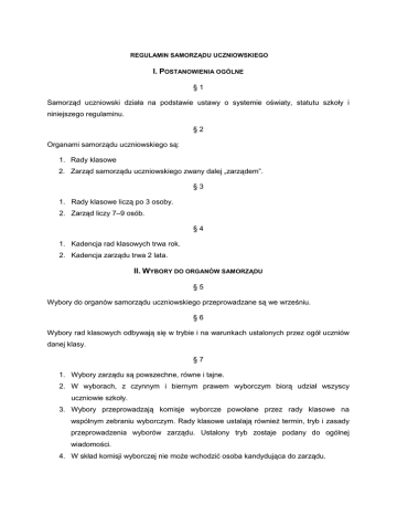 REGULAMIN SAMORZĄDU UCZNIOWSKIEGO I. POSTANOWIENIA OGÓLNE §1 Samorząd uczniowski działa na podstawie ustawy o systemie oświaty, statutu szkoły i niniejszego regulaminu. §2 Organami samorządu uczniowskiego są: 1. Rady klasowe 2. Zarząd samorządu uczniowskiego zwany dalej „zarządem”. §3 1. Rady klasowe liczą po 3 osoby. 2. Zarząd liczy 7–9 osób. §4 1. Kadencja rad klasowych trwa rok. 2. Kadencja zarządu trwa 2 lata. II. WYBORY DO ORGANÓW SAMORZĄDU §5 Wybory do organów samorządu uczniowskiego przeprowadzane są we wrześniu. §6 Wybory rad klasowych odbywają się w trybie i na warunkach ustalonych przez ogół uczniów danej klasy. §7 1. Wybory zarządu są powszechne, równe i tajne. 2. W wyborach, z czynnym i biernym prawem wyborczym biorą udział wszyscy uczniowie szkoły. 3. Wybory przeprowadzają komisje wyborcze powołane przez rady klasowe na wspólnym zebraniu wyborczym. Rady klasowe ustalają również termin, tryb i zasady przeprowadzenia wyborów zarządu. Ustalony tryb zostaje podany do ogólnej wiadomości. 4. W skład komisji wyborczej nie może wchodzić osoba kandydująca do zarządu. §8 Zarząd wybiera ze swojego grona przewodniczącego, zastępcę przewodniczącego, sekretarza i skarbnika. III. KOMPETENCJE WŁADZ ZARZĄDU §9 1. Przewodniczący zarządu organizuje prace zarządu, prowadzi posiedzenia i jest reprezentantem zarządu na zewnątrz. 2. Zastępca przejmuje obowiązki przewodniczącego w czasie jego nieobecności. 3. Sekretarz zarządu odpowiada za dokumentację zarządu. 4. Skarbnik zarządu odpowiada za prawidłową gospodarkę funduszem zarządu. IV. POSIEDZENIA ZARZĄDU § 10 1. Posiedzenia zarządu odbywają się nie rzadziej niż raz na 2 miesiące, zgodnie z harmonogramem pracy zarządu. 2. Poza terminami ustalonymi w harmonogramie, posiedzenia zarządu zwołuje przewodniczący, powiadamiając członków zarządu co najmniej 7 dni przed terminem spotkania. W szczególnie uzasadnionych przypadkach przewodniczący może zwołać posiedzenie zarządu w trybie pilnym, bez przestrzegania 7-dniowego terminu. 3. Posiedzenia zarządu mogą być również zwoływane w każdym czasie z inicjatywy 1/3 członków zarządu oraz na wniosek dyrektora szkoły, rady pedagogicznej, rady szkoły lub rady rodziców. § 11 1. Posiedzenia zarządu prowadzone są przez przewodniczącego. 2. W posiedzeniach zarządu może brać udział z głosem doradczym dyrektor szkoły lub inne osoby zaproszone przez przewodniczącego za zgodą lub na wniosek zarządu. § 12 Posiedzenia zarządu są ważne, o ile obecnych jest co najmniej połowa członków zarządu (quorum). V. TRYB PODEJMOWANIA UCHWAŁ § 13 Uchwały zarządu podejmowane są zwykłą większością głosów, w głosowaniu jawnym. W sprawach personalnych, a także na formalny wniosek przegłosowany przez członków zarządu, głosowanie odbywa się w trybie tajnym. § 14 Uchwały zarządu numerowane są w sposób ciągły w danym roku szkolnym. § 15 Zarząd wyraża opinię, uzgodnioną w drodze głosowania. Tryb głosowania jest taki sam, jak przy podejmowaniu uchwał. § 16 1. Zarząd dokonuje wyboru opiekuna samorządu uczniowskiego spośród członków rady pedagogicznej szkoły. 2. Kadencja opiekuna samorządu uczniowskiego trwa dwa lata 3. Opiekun samorządu uczniowskiego uczestniczy w posiedzeniach zarządu na prawach członka zarządu. VI. PRAWA I OBOWIĄZKI CZŁONKÓW ZARZĄDU § 17 Członkowie zarządu mają prawo wypowiadania własnej opinii na każdy omawiany temat. § 18 Członkowie mają prawo do głosowania na równych prawach, we wszystkich decyzjach podejmowanych przez zarząd. § 19 Członkowie zarządu mają obowiązek aktywnego uczestniczenia w pracach zarządu. VII. POSTANOWIENIA KOŃCOWE § 23 Regulamin wchodzi w życie z dniem uchwalenia.