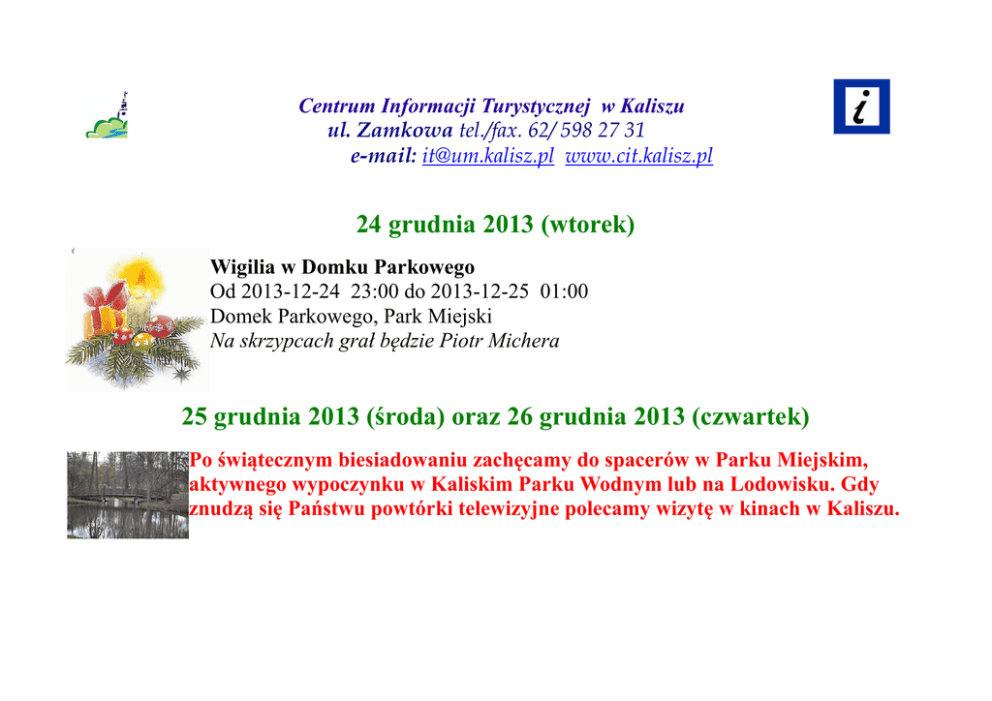 Centrum Informacji Turystycznej w Kaliszu ul. Zamkowa tel./fax. 62/ 598 27 31 e-mail: [email protected] www.cit.kalisz.pl 24 grudnia 2013 (wtorek) Wigilia w Domku Parkowego Od 2013-12-24 23:00 do 2013-12-25 01:00 Domek Parkowego, Park Miejski Na skrzypcach grał będzie Piotr Michera 25 grudnia 2013 (środa) oraz 26 grudnia 2013 (czwartek) Po świątecznym biesiadowaniu zachęcamy do spacerów w Parku Miejskim, aktywnego wypoczynku w Kaliskim Parku Wodnym lub na Lodowisku. Gdy znudzą się Państwu powtórki telewizyjne polecamy wizytę w kinach w Kaliszu. 27 grudnia 2013 (piątek) Spektakl: „Rewizor” Od 2013-12-27 19:00 do 2013-12-27 21:00 Duża Scena Teatru im. W. Bogusławskiego, Plac W. Bogusławskiego 1 reż: Norbert Rakowski w rolach głównych: Agnieszka Dulęba-Kasza, Agnieszka Dzięcielska, Zbigniew Antoniewicz www.teatr.kalisz.pl Wznieśmy toast za Powstańców - patriotyczna impreza w związku z 95 rocznicą wybuchu zwycięskiego powstania wielkopolskiego Od 2013-12-27 20:00 do 2013-12-28 02:00 Pub BeKa, ul. Piekarska 13 Bilety w cenie 5 zł www.kalisz.koliber.pl 28 grudnia 2013 (sobota) Spektakl: „Rewizor” Od 2013-12-28 19:00 do 2013-12-28 21:00 Duża Scena Teatru im. W. Bogusławskiego, Plac W. Bogusławskiego 1 reż: Norbert Rakowski w rolach głównych: Agnieszka Dulęba-Kasza, Agnieszka Dzięcielska, Zbigniew Antoniewicz www.teatr.kalisz.pl 29 grudnia 2013 (niedziela) Koncert kolęd w wykonaniu Zespołu „ Góralska Hora” Od 2013-12-29 14:30 do 2013-12-29 16:00 Katedra Kaliska, ul. Kanonicka 5 www.katedra.kalisz.pl Spektakl: „Rewizor” Od 2013-12-29 19:00 do 2013-12-29 21:00 Duża Scena Teatru im. W. Bogusławskiego, Plac W. Bogusławskiego 1 reż: Norbert Rakowski w rolach głównych: Agnieszka Dulęba-Kasza, Agnieszka Dzięcielska, Zbigniew Antoniewicz www.teatr.kalisz.pl Kina 26-29 grudnia 2013 Seanse filmu „Kraina lodu” 2D i 3D (Animacja/Familijny/Przygodowy/Wlk. Brytania) o godz: 14:00 (2D), 15:55 (3D) w Kinie Centrum 3D (Centrum Kultury i Sztuki), ul. Łazienna 6 www.ckis.kalisz.pl/film 26-29 grudnia 2013 Seanse filmu „Papusza” (Dramat/ Biograficzny/Polska) o godz: 17:50 w Kinie Centrum 3D (Centrum Kultury i Sztuki), ul. Łazienna 6 www.ckis.kalisz.pl/film 26-29 grudnia 2013 Seanse filmu „Kamerdyner” (Dramat/ Biograficzny/USA) o godz: 17:50 w Kinie Centrum 3D (Centrum Kultury i Sztuki), ul. Łazienna 6 www.ckis.kalisz.pl/film 25-29 grudnia 2013 Seanse filmu „Hobbit: Pustkowie Smauga” 3D(Fantasy/Przygodowy/USA/Nowa Zelandia) 25 grudnia o godz: 15:45, 19:00, 20:15 26 grudnia o godz: 12:30, 15:45, 19:00, 20:15 27 – 28 grudnia o godz: 12:30, 15:45, 19:00, 20:15, 22:15 29 grudnia o godz: 12:30, 15:45, 19:00, 20:15 w Cinema 3D (Galeria Tęcza), ul. 3 Maja 1 www.cinema3d.pl 25-29 grudnia 2013 Seanse filmu „Hobbit: Pustkowie Smauga” 3D dubbing (Fantasy/ Przygodowy/ USA/ Nowa Zelandia) 25 grudnia o godz: 17:00 26 - 29 grudnia o godz: 9:15, 10:00, 13:15, 17:00 w Cinema 3D (Galeria Tęcza), ul. 3 Maja 1 www.cinema3d.pl 25-29 grudnia 2013 Seanse filmu „Hobbit: Pustkowie Smauga” dubbing (Fantasy/ Przygodowy/ USA/ Nowa Zelandia) 25 grudnia o godz: 16:00 26 – 29 grudnia o godz: 9:30, 12:45, 16:00 w Cinema 3D (Galeria Tęcza), ul. 3 Maja 1 www.cinema3d.pl 25-29 grudnia 2013 Seanse filmu „Królowa Śniegu” 3 D dubbing (Fantasy/ Animacja/ Rosja) 25 grudnia o godz: 17:00 26 - 29 grudnia o godz: 9:15, 13:15, 17:15 w Cinema 3D (Galeria Tęcza), ul. 3 Maja 1 www.cinema3d.pl 25-29 grudnia 2013 Seanse filmu „W ukryciu” (Dramat/ Polska) o godz: 19:15, 21:30 w Cinema 3D (Galeria Tęcza), ul. 3 Maja 1 www.cinema3d.pl 25-29 grudnia 2013 Seanse filmu „Kamerdyner” (Dramat/ Biograficzny/USA) o godz: 18:15, 21:15 w Cinema 3D (Galeria Tęcza), ul. 3 Maja 1 www.cinema3d.pl 25-29 grudnia 2013 Seanse filmu „Porachunki” (Komedia/ Gangsterski /USA/ Francja) 25 grudnia o godz: 16:00, 19:00, 21:00 26 – 29 grudnia o godz: 12:00, 16:00, 19:00, 21:00 w Cinema 3D (Galeria Tęcza), ul. 3 Maja 1 www.cinema3d.pl 25-29 grudnia 2013 Seanse filmu „Kraina lodu” 3D (Animacja/Familijny/Przygodowy/USA) 25 grudnia o godz: 15:00 26 – 29 grudnia o godz: 11:00, 15:00 w Cinema 3D (Galeria Tęcza), ul. 3 Maja 1 www.cinema3d.pl 26-29 grudnia 2013 Seanse filmu „Królowa Śniegu” dubbing (Fantasy/ Animacja/ Rosja) o godz: 14:15 w Cinema 3D (Galeria Tęcza), ul. 3 Maja 1 www.cinema3d.pl 26-29 grudnia 2013 Seanse filmu „Kraina lodu” (Animacja/Familijny/Przygodowy/USA) o godz: 9:45 w Cinema 3D (Galeria Tęcza), ul. 3 Maja 1 www.cinema3d.pl Ponadto: Centrum Informacji Turystycznej, ul. Zamkowa zaprasza na: Podaruj Kalisz- wystawa świąteczna wykonana przez pp. Cieślak, do połowy stycznia 2014 Kaliska Choinka 2013- prezentacja prac kaliszan związana z Konkursem Ozdób Bożonarodzeniowych, do 6 stycznia 2014, www.cit.kalisz.pl Muzeum Okręgowe Ziemi Kaliskiej w Kaliszu, ul. Kościuszki 12 zaprasza na: Pradzieje i wczesne średniowiecze Kalisza i regionu kaliskiego- wystawa stała • Z dziejów Kalisza-wystawa stała 24 – 26 grudnia Muzeum będzie nieczynne Godziny otwarcia MOZK: wtorki, czwartki: 10.00 - 15.00; środa i piątek: 11.00 - 17.30; soboty i niedziele: 10.30 – 14.30, tel. 62/757-16-08 www.muzeum.kalisz.pl • Centrum Rysunku i Grafiki im. Tadeusza Kulisiewicza, ul. Kolegialna 4 zaprasza: • Warszawska pracownia Tadeusza Kulisiewicza- wystawa stała 24 – 26 grudnia Centrum Rysunku i Grafiki będzie nieczynne Godziny otwarcia: wtorek, czwartek, piątek 10:00- 15:00, środa 11:00- 17:30, sobota, niedziela 10:30- 14:30 tel. 62/757-29-99, www.muzeum.kalisz.pl/oddzialy_kulisiewicz Kaliski Gród Piastów na Zawodziu, ul. Bolesława Pobożnego 87-105a: Czynne po uprzednim zgłoszeniu telefonicznym: tel. 691 996 528 www.muzeum.kalisz.pl/oddzialy_zawodzie Dworek Marii Dąbrowskiej w Russowie od 1 listopada 2013 r. do 28 lutego 2014 r. będzie czynny od wtorku do piątku w godzinach od 10.00 do 15.00. W weekendy możliwość zwiedzania tylko po wcze