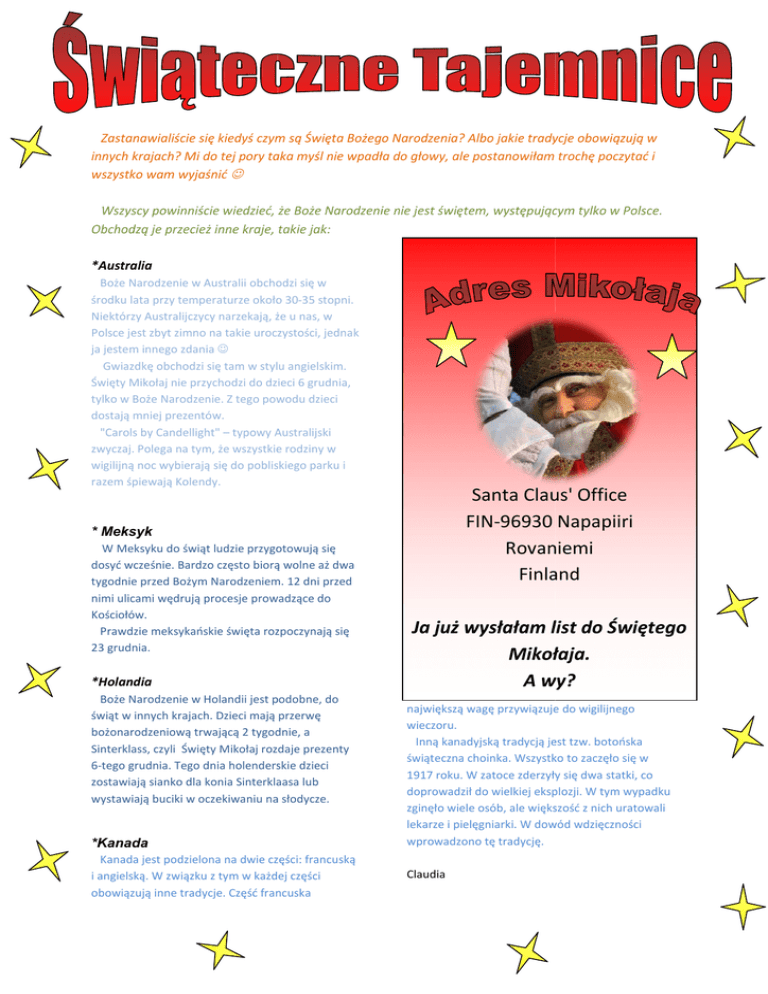 Zastanawialiście się kiedyś czym są Święta Bożego Narodzenia? Albo jakie tradycje obowiązują w innych krajach? Mi do tej pory taka myśl nie wpadła do głowy, ale postanowiłam trochę poczytać i wszystko wam wyjaśnić ☺ Wszyscy powinniście wiedzieć, że Boże Narodzenie nie jest świętem, występującym występującym tylko w Polsce. Obchodzą je przecież inne kraje, takie jak: *Australia Boże Narodzenie w Australii obchodzi się w środku lata przy temperaturze około 30-35 30 stopni. Niektórzy Australijczycy narzekają, że u nas, w Polsce jest zbyt zimno na takie uroczystości, jednak ja jestem innego zdania ☺ Gwiazdkę obchodzi się tam w stylu tylu angielskim. angielskim Święty Mikołaj nie przychodzi do dzieci 6 grudnia, tylko w Boże Narodzenie. Z tego powodu dzieci dostają mniej prezentów. "Carols by Candellight" – typowy Australijski zwyczaj. Polega na tym, że wszystkie rodziny w wigilijną noc wybierają ją się do pobliskiego parku i razem śpiewają Kolendy. Santa Claus' Office FIN-96930 96930 Napapiiri Rovaniemi Finland * Meksyk W Meksyku do świąt ludzie przygotowują się dosyć wcześnie. Bardzo często biorą wolne aż dwa tygodnie przed Bożym Narodzeniem. 12 dni przed nimi ulicami wędrują procesje prowadzące do Kościołów. Prawdzie meksykańskie święta rozpoczynają się 23 grudnia. *Holandia Boże Narodzenie w Holandii jest podobne, do świąt w innych krajach. Dzieci mają przerwę bożonarodzeniową trwającą 2 tygodnie, a Sinterklass, czyli Święty Mikołaj rozdaje prezenty 6-tego tego grudnia. Tego dnia holenderskie dzieci zostawiają sianko dla konia Sinterklaasa lub wystawiają buciki w oczekiwaniu na słodycze. *Kanada Kanada jest podzielona na dwie części: francuską i angielską. W związku z tym w każdej części obowiązują inne tradycje. Część francuska Ja już wysłałam list do Świętego Mikołaja. A wy? największą wagę przywiązuje do wigilijnego wieczoru. Inną kanadyjską tradycją jest tzw. botońska świąteczna choinka. Wszystko to zaczęło się w 1917 roku. W zatoce zderzyły się dwa statki, co doprowadził do wielkiej eksplozji. W tym wypadku zginęło wiele osób, ale większość z nich uratowali lekarze i pielęgniarki. gniarki. W dowód wdzięczności wprowadzono tę tradycję. Claudia