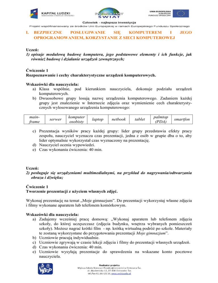 I. BEZPIECZNE POSŁUGIWANIE SIĘ KOMPUTEREM I OPROGRAMOWANIEM, KORZYSTANIE Z SIECI KOMPUTEROWEJ JEGO Uczeń: 1) opisuje modułową budowę komputera, jego podstawowe elementy i ich funkcje, jak również budowę i działanie urządzeń zewnętrznych; Ćwiczenie 1 Rozpoznawanie i cechy charakterystyczne urządzeń komputerowych. Wskazówki dla nauczyciela: a) Klasa wspólnie, pod kierunkiem nauczyciela, dokonuje podziału urządzeń komputerowych. b) Dwuosobowe grupy losują nazwę urządzenia komputerowego. Zadaniem każdej grupy jest znalezienie w Internecie zdjęcia oraz wymienienie cech charakterystycznych wylosowanego urządzenia komputerowego: mainframe serwer komputer osobisty laptop netbook tablet palmtop (PDA) smartfon c) Prezentacja wyników pracy każdej grupy: lider grupy przedstawia efekty pracy zespołu, nauczyciel wyznacza czas prezentacji, jedna z osób w grupie dba o to, aby lider optymalnie wykorzystał czas wyznaczony na prezentację. d) Nauczyciel ocenia wypowiedzi. e) Czas wykonania ćwiczenia: 40 min. Uczeń: 2) posługuje się urządzeniami multimedialnymi, na przykład do nagrywania/odtwarzania obrazu i dźwięku; Ćwiczenie 1 Tworzenie prezentacji z użyciem własnych zdjęć. Wykonaj prezentację na temat „Moje gimnazjum”. Do prezentacji wykorzystaj własne zdjęcia i filmy wykonane aparatem lub telefonem komórkowym. Wskazówki dla nauczyciela: a) Zadajemy wcześniej pracę domową: „Wykonaj aparatem lub telefonem zdjęcia szkoły, do której uczęszczasz (zdjęcia budynku, wnętrza wybranych pomieszczeń szkoły). Możesz nagrać krótki film - np. krótką wirtualną podróż po szkole. Materiały te zostaną wykorzystane do przygotowania prezentacji Moje gimnazjum”. b) Uczniowie pracują indywidualnie. c) Uczniowie zgrywają w czasie lekcji zdjęcia i filmy do prezentacji własnych urządzeń. d) Czas wykonania ćwiczenia: 40 min. e) Uczniowie wysyłają prezentacje do sprawdzenia na wskazane konto pocztowe nauczyciela. Uczeń: 3) stosuje podstawowe usługi systemu operacyjnego i programów narzędziowych do zarządzania zasobami (plikami) i instalowania oprogramowania; Ćwiczenie 3 Operacje na plikach i folderach. KARTA PRACY Operacje na zasobach komputera 1. Na pulpicie utwórz folder i nazwij go swoim imieniem, nazwiskiem i klasą. (1 pkt) 2. Utwórz w nim następującą strukturę folderów: (3 pkt) 3. Zmień ikony folderów na następujące: (2 pkt) Dokumenty Filmy Fotki Muzyka 4. Skopiuj odpowiednie pliki z folderu Pliki do lekcji do utworzonych folderów tak, aby ich zawartość odpowiadała nazwie folderu, np. zdjęcia do folderu Fotki, pliki tekstowe do katalogu Dokumenty/teksty itp. (4 pkt) 5. W swoim folderze utwórz skrót do prezentacji i nazwij go prezentacja. (3 pkt) 6. Sprawdź rozmiar swojego folderu oraz ścieżkę dostępu do niego i zapisz te informacje w pliku tekstowym. Zapisz ten plik w swoim folderze. (3 pkt) Wskazówki dla nauczyciela: a) Nauczyciel przygotowuje na pulpitach komputerów uczniowskich folder Pliki do lekcji z niezbędnymi plikami. b) Uczniowie otrzymują karty pracy. c) Czas wykonania zadania: 25 min. d) Nauczyciel ocenia prace wszystkich uczniów wg ustalonej punktacji: 16 – 15 pkt – cel. 14 – 13 pkt – bdb. 12 – 11 pkt – db. 10 – 8 pkt – dst. 7 – 4 pkt – dop. 3 – 0 pkt – ndst. Uczeń: 4) wyszukuje i uruchamia programy, porządkuje i archiwizuje dane i programy; stosuje profilaktykę antywirusową; Ćwiczenie 2 Rodzaje zagrożeń programowych i ochrona przed nimi 1. Stwórz mapę mentalną w programie XMind przedstawiającą rodzaje zagrożeń dla danych na komputerach. Wskazówki dla nauczyciela a) Uczniowie otrzymują krótki tekst na temat rodzajów zagrożeń w Internecie. b) Uczniowie pracują w grupach dwuosobowych. c) Uczniowie tworzą mapę mentalną po przeczytaniu tekstu. d) Czas wykonania zadania: 15 min. e) Nauczyciel wspólnie z uczniami wybiera najlepszy schemat mapy mentalnej. 2. Otwórz mapę mentalną przedstawiającą sposoby ochrony przed zagrożeniami dla danych na komputerach. Przykładowy schemat mapy mentalnej 3. Odpowiedz na pytania: (możesz korzystać z Internetu) Co oznacza pojęcie zapora sieciowa (firewall) i dlaczego musimy z niej korzystać? Jakie znasz programy antywirusowe? Jaki program tego typu masz zainstalowany na swoim komputerze domowym? Co to są makra w aplikacjach office? W jakim programach możemy tworzyć kopie zapasowe ważnych danych? Wskazówki dla nauczyciela: a) Uczniowie otrzymują od nauczyciela mapę (np. taką jak na rys. powyżej) b) Uczniowie pracują indywidualnie. c) Czas wykonania zadania: 15 min. d) Chętni uczniowie odpowiadają na pytania. Uczeń: 5) samodzielnie i bezpiecznie pracuje w sieci lokalnej i globalnej; Ćwiczenie 3 Cechy charakterystyczne przeglądarek internetowych 1. Jakiej przeglądarki używasz do przeglądania stron internetowych? Uzasadnij, dlaczego korzystasz z tej, a nie innej przeglądarki? 2. Sprawdź w menu przeglądarki, a następnie zapisz w pliku tekstowym odpowiedzi na następujące pytania: Czy masz możliwość zablokowania wyskakujących okienek? Jakie wtyczki (rozszerzenia) są zainstalowane w przeglądarce? Czy przeglądarka zapamiętuje hasła do witryn? Czy możesz pracować w trybie prywatnym, tzn. przeglądać Internet bez zapisywania odwiedzonych stron w lokalnej historii przeglądarki? Co to są ciasteczka? Czy są niebezpieczne? Wskazówki dla nauczyciela: a) Nauczyciel dzieli klasę na 4 grupy, zadaje to ćwiczenie na pracę domową, ponieważ w pracowni nie ma zainstalowanych kilku (kilkunastu) przeglądarek internetowych. b) Uczniowie prezentują na lekcji odpowiedzi na pytania. Nauczyciel wybiera osoby, które pracują na różnych przeglądarkach. c) Wspólnie przygotowują zestawienie – statystykę – na temat tego, jaka przeglądarka jest najbardziej popularna w klasie. Uczeń: 6) korzysta z pomocy komputerowej oraz z dokumentacji urządzeń komputerowych i oprogramowania; Ćwicze