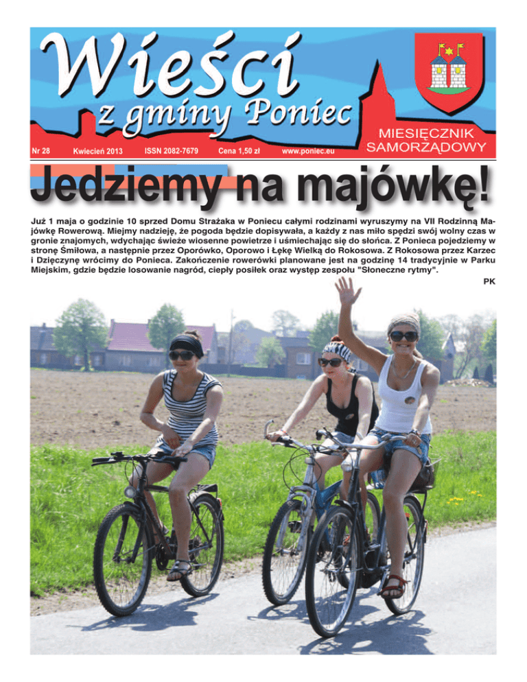 Jedziemy na majówkę! Nr 28 Kwiecień 2013 ISSN 2082-7679 Cena 1,50 zł www.poniec.eu Już 1 maja o godzinie 10 sprzed Domu Strażaka w Poniecu całymi rodzinami wyruszymy na VII Rodzinną Majówkę Rowerową. Miejmy nadzieję, że pogoda będzie dopisywała, a każdy z nas miło spędzi swój wolny czas w gronie znajomych, wdychając świeże wiosenne powietrze i uśmiechając się do słońca. Z Ponieca pojedziemy w stronę Śmiłowa, a następnie przez Oporówko, Oporowo i Łękę Wielką do Rokosowa. Z Rokosowa przez Karzec i Dzięczynę wrócimy do Ponieca. Zakończenie rowerówki planowane jest na godzinę 14 tradycyjnie w Parku Miejskim, gdzie będzie losowanie nagród, ciepły posiłek oraz występ zespołu "Słoneczne rytmy". PK [2] WIEŚCI Z GMINY PONIEC Muzycy z Dziecięco-Młodzieżowej Orkiestry Dętej GCKSTiR w Poniecu wzięli udział 16 marca w XXIX Wielkopolskim Konkursie Młodych Instrumentalistów Członków Orkiestr Dętych imienia Jana Schulza w Osiecznej. W tegorocznej edycji uczestniczyło prawie 40 młodych muzyków z różnych orkiestr regionu leszczyńskiego. Poniecką orkiestrę reprezentowali: Ewelina Robaszewska sax alt, Maria Drewniak - klarnet, Jakub Kaźmierczak - sax alt, Borys Kaźmierczak - klarnet i Mateusz Mańka - trąbka. Nasi muzycy zajęli jedno trzecie miejsce (Borys Kaźmierczak) i zdobyli dwa wyróżnienia (Mateusz Mańka i Jakub Kaźmierczak). PK Konkurs plastyczny „Julian Tuwim dzieciom, dzieci - Tuwimowi" na ilustrację do wierszy Juliana Tuwima zorganizowała Gminna Biblioteka CKSTiR w Poniecu. Konkurs przygotowano w związku z ogłoszonym roku 2013 Rokiem Tuwimowskim. Konkurs przeznaczony był dla dzieci w wieku przedszkolnym. Wzięło w nim udział 92 dzieci. W dniach od 4 do 20 marca na pięciu spotkaniach poznawały one utwory poety: „Lokomotywa”, „Bambo”, „Okulary”, „Słoń Trąbalski”, „Rycerz Krzykalski”, do których rysowały ilustracje. Nagrody za najlepsze prace otrzymali: Bartek Sobczak, Oliwia Jankowska, Nicole Juskowiak, Jan Kędziora, Maria Sobczyk, Maksymilian Wasiak, Kamila Borowiec, Kamil Kozera, Bartłomiej Marszałkowski, Filip Poprawski, Nikola Przewoźna, Kacper Chomik, Amelia Kijak, Jakub Kowalski, Amelia Kubiak, Sandra Woźna, Adrian Wujczak, Mikołaj Ziemliński, Karolina Jasińska, Wojciech Juskowiak, Laura Kistowska, Maciej Michalak. Wyróżnienia otrzymali: Jakub Domagała, Aleksandra Lokś, Monika Stopa, Zuzanna Kistowska, Zuzanna Lisiecka, Laura Dołęga, Natalia Kowalska, Cyprian Brodziak. Wszyscy wymienieni otrzymali nagrody książkowe. PK Spotkanie autorskie z Romanem Pankiewiczem, autorem książki „Islandia trzeci żywioł”, odbyło się 9 kwietnia w Gminnej Bibliotece CKSTiR w Poniecu. Zaproszony gość opowiedział uczestnikom spotkania swoją przygodę z Islandią, bogato ilustrując ją zdjęciami malowniczej wyspy. Spotkanie upłynęło w miłej atmosferze, a autor chętnie odpowiadał na wszystkie pytania. PK Wśród pól i łąk WIEŚCI Z GMINY PONIEC Gminna Biblioteka CKSTiR w Poniecu rozpoczęła realizację projektu "Mieszkamy wśród pól i łąk... nasza mała ojczyzna okiem kamery". Projekt realizowany jest w ramach Programu Rozwoju Bibliotek i dzięki pozyskaniu grantu w wysokości 5 tysięcy złotych w konkursie grantowym „Aktywna Biblioteka”. Projekt skierowany jest do około sześćdziesięciorga uczniów klas IV - VI szkoły podstawowej. Celem projektu jest współpraca ze szkołami z terenu gminy, zaangażowanie dzieci do działania oraz wolontariatu. Przedsięwzięcie polegać będzie na przeprowadzeniu dziewięciu godzin warsztatów wyjazdowych i dziewięciu godzin warsztatów bibliotecznych. Warsztaty wyjazdowe, rowerowe, zorganizowane będą w celu wykonania zdjęć i nakręcenia filmów o miejs- cowościach należących do naszej gminy. Podczas warsztatów bibliotecznych, posługując się kamerą, aparatem fotograficznym oraz programami komputerowymi, dzieci pracować będą nad stworzeniem prezentacji multimedialnej pt. "Mieszkamy wśród pól i łąk.... nasza mała ojczyzna okiem kamery". Po jej utworzeniu prezentacja zostanie umieszczona na stronie www. gckstir. poniec. pl. i Facebooku. Każdy uczestnik otrzyma pendrive’y, na którym umieści efekty swojej pracy. Po zakończeniu projektu pendrivy staną się własnością uczestniczących w projekcie. Będzie to nagroda za ich pracę. Biblioteka w kwietniu rozpoczęła realizację projektu od zakupu dwóch kamer z kartami pamięci i statywami. PK Z okazji ósmej rocznicy śmierci naszego wielkiego rodaka Papieża Jana Pawła II, Honorowego Obywatela Gminy Poniec, delegacja władz samorządowych w imieniu gminy złożyła kwiaty pod pomnikiem upamiętniającym długoletni pontyfikat Ojca Świętego. Dyżury radnych PK W każdy pierwszy poniedziałek miesiąca poszczególni radni Rady Miejskiej Ponieca pełnią swoje dyżury od godziny 14:00 do 16:00 w pokoju nr 14 Urzędu Miejskiego. Można wówczas zgłaszać wszel- Sezon wiosennych egzaminów rozpoczęli 4 kwietnia najmłodsi uczniowie. W Szkole Podstawowej w Poniecu do egzaminu szóstoklasistów zasiadło 36 uczniów. Ubrani w eleganckie, egzaminacyjne stroje, wyposażeni w potrzebne przybory, rozpoczęli zmagania z arkuszem zadań. W tym roku było 26 zadań - 20 zamkniętych i 6 otwartych. A jakie będą wyniki, okaże się pod koniec PK maja. Po raz trzeci, w dniach 12 – 14 marca, w sali Gminnego Centrum Kultury Sportu Turystyki i Rekreacji w Poniecu odbyły się Rodzinne Warsztaty Wielkanocne. W zajęciach wzięło udział dwadzieścioro osób, dzieci i dorosłych. W czasie trzydniowych warsztatów uczestnicy przygotowywali m.in. dekoracje z filcu, doniczki w kształcie zajączków do rzeżuchy, papierowe kwiatki z serwetek. Zajęcia PK prowadziła Adriana Perska. [3] kie problemy i sprawy, które wymagają zainteresowania władz gminy. Dnia 6 maja 2013 roku dyżur będą pełniły Małgorzata Danielczak i Aneta Wrotyńska. Ponadto pod nu