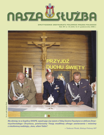 DWUTYGODNIK ORDYNARIATU POLOWEGO WOJSKA POLSKIEGO Fot. ks. ppłk Augustyn Rosły Rok XV nr 18 (324) 16-31 października 2006 r. My dzisiaj, tu w kaplicy SHAPE, wpatrując się razem z Tobą Siostro Faustyno w oblicze Zmartwychwstałego Chrystusa, powtarzamy Twoją modlitwę ufnego zawierzenia i mówimy z niezłomną nadzieją: „Jezu, ufam Tobie”. + Tadeusz Płoski, Biskup Polowy WP Z nauczania Koœcio³a Katolickiego Mi³oœæ dusz¹ misji Drodzy Bracia i Siostry! 3. W przeddzień swojej męki, uczniom, zebranym w Wieczerniku na obchody święta Paschy, Jezus pozostawił jako testament „nowe przykazanie miłości – mandatum novum”: „To wam przykazuję, abyście się wzajemnie miłowali” (J 15, 17). Miłość braterska, której Jezus wymaga od swoich „przyjaciół”, ma źródło w ojcowskiej miłości Boga. Jan apostoł zauważa: „każdy, kto miłuje, narodził się z Boga i zna Boga” (1J 4, 7). Tak więc, aby miłować zgodnie z wolą Boga, trzeba żyć w Nim i żyć Nim: Bóg jest pierwszym „domem” człowieka, i jedynie ten, kto przebywa w Nim, płonie ogniem miłości Bożej, zdolnym „rozpalić” świat. Czyż nie na tym polega misja Kościoła w każdym czasie? Nietrudno więc zrozumieć, że autentyczna działalność misyjna, pierwszorzędne zadanie wspólnoty kościelnej, związana jest z wiernością wobec Bożej miłości, a odnosi się to do każdego pojedynczego chrześcijanina, do każdej wspólnoty lokalnej, do Kościołów partykularnych i do całego Ludu Bożego. Właśnie dzięki świadomości tej wspólnej misji uczniowie Chrystusa mogą realizować z ofiarną gotowością dzieła sprzyjające ludzkiemu i duchowemu rozwojowi, które dają świadectwo – jak pisał umiłowany Jan Paweł II w Encyklice Redemptoris missio – „o duchu całej 22 października 2006 działalności misyjnej: o miłości, która jest siłą pobudzającą misji. Tylko miłość powinna rozstrzygać, czy coś ma być wykonane czy zaniechane, zmienione czy nie zmienione. Miłość jest zasadą działania oraz celem, do którego należy dążyć. Cokolwiek się szczerze uczyni dla niej i zgodnie z nią, nigdy nie będzie niewłaściwe” (n. 60). Tak więc, być misjonarzami znaczy miłować Boga całym sobą, aż do oddania życia za Niego, jeśli okaże się to konieczne. Iluż kapłanów, zakonników, zakonnic i świeckich, również w naszych czasach, złożyło Mu najwyższe świadectwo miłości przez męczeństwo! Być misjonarzami znaczy pochylić się jak dobry Samarytanin nad potrzebami wszystkich, zwłaszcza najuboższych i najbardziej potrzebujących, ponieważ kto kocha sercem Chrystusa, nie zabiega o własną korzyść, ale jedynie o chwałę Ojca i dobro bliźniego. W tym tkwi tajemnica apostolskiej owocnej działalności misyjnej, przekraczającej granice, obejmującej kultury, narody i docierającej do najdalszych zakątków świata. Fragment Orędzia Ojca Świętego Benedykta XVI na Światowy Dzień Misyjny 2006 Watykan, 29 kwietnia 2006 r. Tłum. „L`Osservatore Romano” Modlitwa o beatyfikację Sługi Bożego Ks. Jerzego Popiełuszki Boże nieskończenie dobry, który obdarzyłeś swego Sługę, ks. Jerzego Popiełuszkę, łaską wierności kapłańskiemu powołaniu aż do męczeńskiej śmierci, prosimy Cię słowami papieża Jana Pawła II: „Aby z tej śmierci wyrosło dobro, tak jak z Krzyża Zmartwychwstanie”. Spraw, by Ksiądz Jerzy, niezłomny obrońca Praw Bożych i ludzkich, dany Ojczyźnie naszej i światu jako znak zwycięstwa miłości nad nienawiścią, został wyniesiony do chwały ołtarzy. Miłosierny Boże, udziel mi, za wstawiennictwem Sługi Bożego Księdza Jerzego, tej łaski, o którą Cię gorąco proszę. Niech ofiara życia Księdza Jerzego i jego wstawiennictwo u Ciebie przyczyniają się do wzrostu chrześcijańskiej wiary, jedności i pokoju w świecie. Przez Chrystusa Pana naszego. Amen. ' PAPIESKIE INTENCJE MISYJNE NA PAZDZIERNIK Módlmy siê, aby Œwiatowe Dni Misyjne wszêdzie o¿ywia³y ducha animacji i wspó³pracy misyjnej. 2 Liturgia Koœcio³a XXIX Niedziela Zwykła. Światowa Niedziela Misyjna „Kto by między wami chciał stać się wielkim, niech będzie sługą waszym”. (Mk 10, 42-45) Tydzień dzielenia się z innymi! Poświecę swój czas, by odwiedzić chorego, może pomogę komuś w zrozumieniu trudnego zadania. Podzielę się kanapką lub cukierkiem, gdy zauważę, że ktoś jest głodny. Nie chcę być pyszny, wyniosły, ale chcę być dla innych. W tym tygodniu, szczególnie w pacierzu i w modlitwie różańcowej pomódl się za misjonarzy. A może znasz jakiegoś misjonarza? 29 października 2006 XXX Niedziela Zwykła. Uroczystość rocznicy poświęcenia własnego kościoła. Jezus rzekł do Zacheusza: „Dziś zbawienie stało się udziałem tego domu, gdyż i on jest synem Abrahama. Albowiem Syn Człowieczy przyszedł szukać i zbawić to, co zginęło”. (Łk 19, 1-10) Wytrwaj do końca w modlitwie różańcowej! Ten tydzień jest szczególny, w którym Pan Bóg otwiera niebo. Pamiętamy w tym czasie o naszych zmarłych, o ich życiu. Przyjmujemy dla nich z czystym sercem Pana Jezusa, odmawiamy przy grobach „Wieczny odpoczynek…”, prosząc dla nich o to Pana Jezusa. Biskup Polowy Wojska Polskiego gen. dyw. Tadeusz Płoski został wybrany na 337. zebraniu plenarnym Konferencji Episkopatu Polski, w dniu 19 października 2006 roku, członkiem Rady Prawnej Episkopatu Polski. Przewodniczącym Rady Prawnej Episkopatu Polski jest bp Andrzej Dzięga. Na okładce: Generałowie (od lewej) M. Cieniuch, J. P. Stein, A. Kaczyński podpisują akt erygowania parafii Miłosierdzia Bożego i akt intronizowania relikwii św. siostry Faustyny Kowalskiej. Mons, SHAPE (Belgia), 14 października 2006 r. Intronizacja relikwii Œw. Faustyny Kowalskiej i erygowanie nowej parafii w Brukseli – Mons Miłosierdzie Boże nie zna granic Biskup Polowy gen. dyw. Tadeusz Płoski erygował 14 października 2006 r. no
