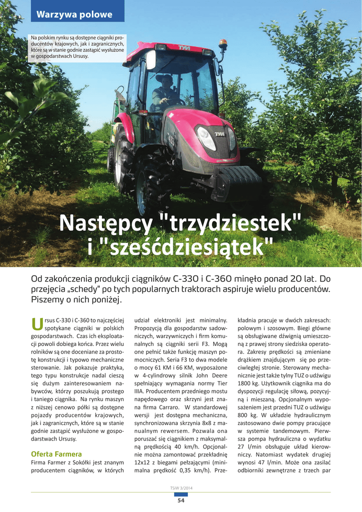 Warzywa polowe Na polskim rynku są dostępne ciągniki producentów krajowych, jak i zagranicznych, które są w stanie godnie zastąpić wysłużone w gospodarstwach Ursusy. Następcy "trzydziestek" i "sześćdziesiątek" Od zakończenia produkcji ciągników C-330 i C-360 minęło ponad 20 lat. Do przejęcia „schedy" po tych popularnych traktorach aspiruje wielu producentów. Piszemy o nich poniżej. U rsus C-330 i C-360 to najczęściej spotykane ciągniki w polskich gospodarstwach. Czas ich eksploatacji powoli dobiega końca. Przez wielu rolników są one doceniane za prostotę konstrukcji i typowo mechaniczne sterowanie. Jak pokazuje praktyka, tego typu konstrukcje nadal cieszą się dużym zainteresowaniem nabywców, którzy poszukują prostego i taniego ciągnika. Na rynku maszyn z niższej cenowo półki są dostępne pojazdy producentów krajowych, jak i zagranicznych, które są w stanie godnie zastąpić wysłużone w gospodarstwach Ursusy. Oferta Farmera Firma Farmer z Sokółki jest znanym producentem ciągników, w których udział elektroniki jest minimalny. Propozycją dla gospodarstw sadowniczych, warzywniczych i firm komunalnych są ciągniki serii F3. Mogą one pełnić także funkcję maszyn pomocniczych. Seria F3 to dwa modele o mocy 61 KM i 66 KM, wyposażone w 4-cylindrowy silnik John Deere spełniający wymagania normy Tier IIIA. Producentem przedniego mostu napędowego oraz skrzyni jest znana firma Carraro. W standardowej wersji jest dostępna mechaniczna, synchronizowana skrzynia 8x8 z manualnym rewersem. Pozwala ona poruszać się ciągnikiem z maksymalną prędkością 40 km/h. Opcjonalnie można zamontować przekładnię 12x12 z biegami pełzającymi (minimalna prędkość 0,35 km/h). PrzeTSiW 3/2014 54 kładnia pracuje w dwóch zakresach: polowym i szosowym. Biegi główne są obsługiwane dźwignią umieszczoną z prawej strony siedziska operatora. Zakresy prędkości są zmieniane drążkiem znajdującym się po przeciwległej stronie. Sterowany mechanicznie jest także tylny TUZ o udźwigu 1800 kg. Użytkownik ciągnika ma do dyspozycji regulację siłową, pozycyjną i mieszaną. Opcjonalnym wyposażeniem jest przedni TUZ o udźwigu 800 kg. W układzie hydraulicznym zastosowano dwie pompy pracujące w systemie tandemowym. Pierwsza pompa hydrauliczna o wydatku 27 l/min obsługuje układ kierowniczy. Natomiast wydatek drugiej wynosi 47 l/min. Może ona zasilać odbiorniki zewnętrzne z trzech par złączy ISO. Maszyny podłączane do WOM mogą pracować przy standardowej prędkości 540 obr./ min lub ekonomicznej 540E. W standardzie producent oferuje także obroty zależne od prędkości jazdy. Producentem kabiny jest Koja Smolniki. W podstawowej wersji wyposażenia kabina jest zaopatrzona w system wentylacji i ogrzewania, zaś opcjonalnie w klimatyzację. Ciągniki z Mrągowa Funkcjonująca na polskim rynku firma Farmtrac produkuje ponad 20 odmian i typów ciągników, które są oferowane także zagranicą. Konstrukcje tych pojazdów opierają się na rozwiązaniach renomowanych, europejskich firm produkujących podzespoły, takich jak: ZF, Bosch, Perkins, Carraro, MITA. Najmniejszym ciągnikiem z oferty mrągowskiej firmy jest model 535 o mocy 33 KM, przeznaczony dla małych i średnich gospodarstw rolnych. Może on pracować w uprawach międzyrzędowych oraz w sadzie. FT 535 jest konstrukcją z niewielkim udziałem elektroniki. Wyposażono go w skrzynię o stałym zazębieniu kół, która oferuje 8 przełożeń do jazdy w przód oraz 2 wsteczne. Układ hydrauliczny stanowi pompa o wydatku 34 l/min i TUZ o udźwigu 1050 kg. Podnośnik hydrauliczny jest sterowany mechanicznie w zakresie regulacji pozycyjnej i siłowej. Sterowany mechanicznie WOM dysponuje jedną prędkością: 540 obr./min. Ciągnik wyposażono w dwudrzwiową kabinę z ogrzewaniem i wentylacją. W ofercie producenta znajduje się także nieco mocniejsza maszyna – Farmtrac 555, dostępny także w wersji DT (oś Carraro ze zwolnicami planetarnymi i automatyczną blokadą mechanizmu różnicowego). Ciągnik jest do nabycia z napędem na dwa lub cztery koła. Napędza go silnik o mocy 48 KM, spełniający wymagania normy Euro IIIA. W skład standardowego wyposażenia ciągnika wchodzi synchronizowana skrzynia 8+2R, podnośnik hydrauliczny firmy Mita o udźwigu 1400 kg (555) i 1000 kg (555DT) oraz niezależny WOM (540 obr./min). Ci, którzy szukają następcy C-360 w ofercie producenta z Mrągowa, powinni przyjrzeć się serii 670/670DT, którą zasila 4-cylindrowa, turbodoładowana jednostka o mocy 66 KM. Ciągnik ten skonstruowano z myślą o współpracy z ładowaczem czołowym o udźwigu 1200 kg. W wyposażeniu tego pojazdu znajduje się skrzynia 12+12 z mechanicznym, zsynchronizowanym rewersem i reduktorem. Układ hydrauliczny to sterowany mechanicznie podnośnik Mita o udźwigu 2400 kg z regulacją pozycyjną i siłową oraz pompą o wydatku 34 l/min. W ciągniku zastosowano niezależny WOM o prędkościach 540 i 1000 obr./min. Pojazd standardowo Propozycją dla gospodarstw sadowniczych, warzywniczych i firm komu- nalnych są ciągniki Farmer serii F3. Mogą one także pełnić funkcję maszyn pomocniczych w gospodarstwie. jest wyposażony w dwudrzwiową kabinę z systemem wentylacji i ogrzewania. Ciągnik od Ursusa Z pewnością wielu rolników ma sentyment do produktów oferowanych przez Zakłady Przemysłu Ciągnikowego „Ursus”. Obecnie tradycję znanego producenta przejęła notowana na giełdzie spółka Ursus S.A. Dla sadownictwa producent z Lublina proponuje ciągnik Ursus 5044 o mocy 54 KM, wyposażony w wolnossący silnik Perkinsa, spełniający wymagania normy Euro IIIA. Jest to TSiW 3/2014 55 Ciągnik TYM T 503 ze względu na swe niewielkie gabaryty może pracować na ograniczonych przestrzeniach. Sprawdza się także w gospodarstwach warzywniczych. pojazd z napędem na cztery koła, wyposażony w rewersowaną skrzynię 12+12. Mechaniczna przekładnia pozwala na jaz