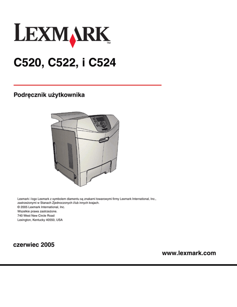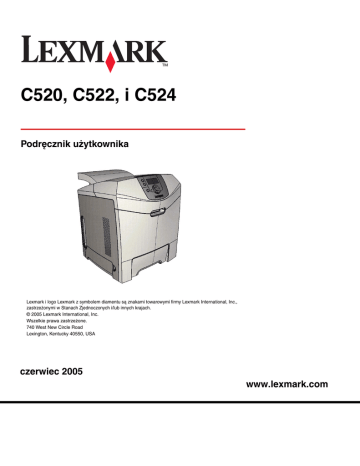 C520, C522, i C524 Podręcznik użytkownika Lexmark i logo Lexmark z symbolem diamentu są znakami towarowymi firmy Lexmark International, Inc., zastrzeżonymi w Stanach Zjednoczonych i/lub innych krajach. © 2005 Lexmark International, Inc. Wszelkie prawa zastrzeżone. 740 West New Circle Road Lexington, Kentucky 40550, USA czerwiec 2005 www.lexmark.com Wydanie: czerwiec 2005 Niniejsze oświadczenie nie ma zastosowania w krajach, w których tego rodzaju uregulowania są niezgodne z obowiązującym prawem: FIRMA LEXMARK INTERNATIONAL, INC. DOSTARCZA TĘ PUBLIKACJĘ „AS IS – W PRZEDSTAWIONEJ POSTACI”, BEZ ŻADNYCH GWARANCJI WYRA NYCH LUB DOMNIEMANYCH, WŁĄCZAJĄC W TO RÓWNIEŻ DOMNIEMANE GWARANCJE PRZYDATNOŚCI HANDLOWEJ LUB PRZYDATNOŚCI DO OKREŚLONEGO CELU. Ustawodawstwo niektórych krajów nie zezwala na zrzeczenie się gwarancji wyraźnej lub dorozumianej w pewnych przypadkach. W takich przypadkach niniejsza klauzula nie ma zastosowania. Niniejsza publikacja może zawierać nieścisłości techniczne lub błędy drukarskie. Przedstawione informacje podlegają okresowym aktualizacjom; zmiany te będą uwzględniane w kolejnych edycjach. Zmiany lub udoskonalenia opisanych produktów lub programów mogą być wprowadzane w dowolnym czasie. Uwagi dotyczące tej publikacji można kierować pod adres Lexmark International, Inc., Department F95/032-2, 740 West New Circle Road, Lexington, Kentucky 40550, USA. W Wielkiej Brytanii i Irlandii uwagi należy kierować pod adres Lexmark International Ltd., Marketing and Services Department, Westhorpe House, Westhorpe, Marlow Bucks SL7 3RQ. Firma Lexmark może wykorzystywać lub rozpowszechniać wszystkie informacje dostarczone przez użytkowników w dowolny sposób uznany przez nią za właściwy, nie zaciągając żadnych zobowiązań wobec użytkowników. Dodatkowe egzemplarze publikacji związanych z tym produktem można nabyć, dzwoniąc pod numer telefonu 1-800-553-9727 (USA). W Wielkiej Brytanii i Irlandii należy zatelefonować pod numer +44 (0)8704 440 044. W innych krajach należy skontaktować się z punktem sprzedaży. Odniesienia w niniejszej publikacji do produktów, programów lub usług nie oznaczają, że producent zamierza je udostępniać we wszystkich krajach, w których prowadzi działalność. Jakiekolwiek odniesienie do produktu, programu lub usługi nie stanowi stwierdzenia ani sugestii, że można korzystać tylko z danego produktu, programu lub usługi. Zamiennie można używać dowolnego funkcjonalnego odpowiednika produktu, programu lub usługi, o ile nie narusza to żadnych praw własności intelektualnej. Ocena i sprawdzanie współdziałania z innymi produktami, programami lub usługami, poza wyraźnie wymienionymi przez producenta, odbywa się na odpowiedzialność użytkownika. © 2005 Lexmark International, Inc. Wszelkie prawa zastrzeżone. UNITED STATES GOVERNMENT RIGHTS This software and any accompanying documentation provided under this agreement are commercial computer software and documentation developed exclusively at private expense. Informacje dotyczące bezpieczeństwa • • • • • Przewód zasilający musi być podłączony do łatwo dostępnego i prawidłowo uziemionego gniazdka elektrycznego znajdującego się w pobliżu urządzenia. UWAGA: Nie należy instalować urządzenia, dokonywać żadnych połączeń elektrycznych ani podłączać żadnych przewodów (np. przewodu zasilającego lub telefonu) podczas burzy. Wszelkie naprawy i czynności serwisowe, oprócz opisanych w instrukcji obsługi, powinny być wykonywane przez wykwalifikowanego pracownika serwisu. Produkt został zaprojektowany z wykorzystaniem określonych podzespołów firmy Lexmark i zatwierdzony jako spełniający surowe światowe normy bezpieczeństwa. Rola niektórych podzespołów w zachowaniu bezpieczeństwa nie zawsze jest oczywista. Firma Lexmark nie ponosi odpowiedzialności za skutki stosowania innych części zamiennych. Zakupiony produkt korzysta z technologii laserowej. UWAGA: Użycie elementów sterujących, ustawień lub zastosowanie procedur innych niż określone w niniejszej publikacji może spowodować niebezpieczeństwo napromieniowania. Podczas drukowania w urządzeniu dochodzi do nagrzewania się nośników wydruku, a wysoka temperatura może powodować emisję szkodliwych wyziewów z tych nośników. W celu uniknięcia ewentualnej emisji szkodliwych wyziewów, należy zapoznać się z fragmentem instrukcji obsługi, w którym podano wytyczne dotyczące wyboru nośników wydruku. Znaki towarowe Lexmark, logo Lexmark z symbolem diamentu, MarkNet, MarkVision i Drag’N’Print są znakami towarowymi firmy Lexmark International, Inc.,zastrzeżonymi w Stanach Zjednoczonych i/lub innych krajach. PCL® jest zarejestrowanym znakiem towarowym firmy Hewlett-Packard. PCL jest oznaczeniem firmy Hewlett-Packard dla zestawu poleceń (języka) i funkcji stosowanych w drukarkach tej firmy. Ta drukarka została zaprojektowana w taki sposób, aby była zgodna z językiem PCL. Oznacza to, że ta drukarka rozpoznaje polecenia języka PCL używane w różnych aplikacjach i emuluje funkcje odpowiadające tym poleceniom. PostScript® jest zastrzeżonym znakiem towarowym firmy Adobe Systems Incorporated. PostScript 3 jest oznaczeniem firmy Adobe Systems dla zestawu poleceń (języka) i funkcji drukarki stosowanych w programach tej firmy. Ta drukarka została zaprojektowana w taki sposób, aby była zgodna z językiem PostScript 3. Oznacza to, że ta drukarka rozpoznaje polecenia języka PostScript 3 zastosowane w różnych aplikacjach i emuluje funkcje odpowiadające tym poleceniom. Szczegóły dotyczące zgodności znajdują się w dziale Technical Reference (Dokumentacja techniczna). Pozostałe znaki towarowe są własnością odpowiednich firm. 2 Spis treści Rozdział 1: Ogólne informacje o drukarce ....................................................................... 8 Modele podstawowe .............................