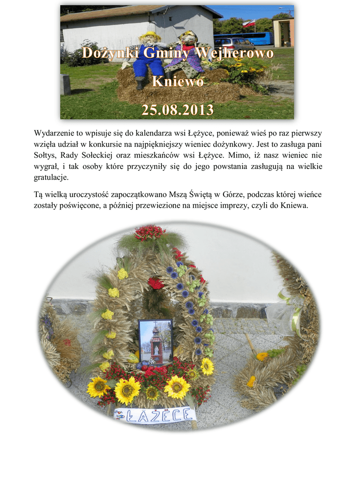 Wydarzenie to wpisuje się do kalendarza wsi Łężyce, ponieważ wieś po raz pierwszy wzięła udział w konkursie na najpiękniejszy wieniec dożynkowy. Jest to zasługa pani Sołtys, Rady Sołeckiej oraz mieszkańców wsi Łężyce. Mimo, iż nasz wieniec nie wygrał, i tak osoby które przyczyniły się do jego powstania zasługują na wielkie gratulacje. Tą wielką uroczystość zapoczątkowano Mszą Świętą w Górze, podczas której wieńce zostały poświęcone, a później przewiezione na miejsce imprezy, czyli do Kniewa. Pomysłów na wieniec dożynkowy było bardzo dużo, co można zauważyć na poniższych fotografiach. Orkiestra dęta z Góry zapewniła oprawę muzyczną Mszy Świętej Wystrój ołtarza oraz ławki były przyozdobione darami z pól, łąk, lasów, sadów i ogrodów. Każde z Sołectw Gminy Wejherowo przygotowało dary, m.in. grzyby, które złożyły pani Wioletta Grubba – Sołtys wsi Łężyce oraz pani Ewa Bergmann – Członek Rady Sołeckiej i Prezes Stowarzyszenia Szansa dla Nas. Imprezę dożynkową zapoczątkował Wójt Gminy Wejherowo – pan Henryk Skwarło Każdy z uczestników został poczęstowany smacznym chlebem dożynkowym. Czas na wręczanie nagród za wieńce dożynkowe – werdykt ogłaszała pani Danuta Hejmowska - Prezes Lokalnej Grupy Działania „Kaszubska Droga”. Gratulacje i nagrodę pocieszenia odbiera nasza pani Sołtys z rąk Wójta Gminy Wejherowo, a pod sceną przepiękny wieniec z chlubą naszej wsi – kapliczką Matki Boskiej Zielnej. A tutaj wszyscy laureaci konkursu