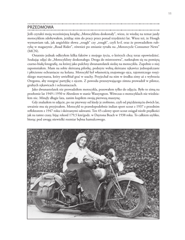 11 PRZEDMOWA Jeśli czytałeś moją wcześniejszą książkę „Motocyklista doskonały”, wiesz, że wiedzę na temat jazdy motocyklem zdobywałem, jeżdżąc nim do pracy przez ponad trzydzieści lat. Wiesz też, że Hough wymawiam tak, jak angielskie słowa „rough” czy „tough”, czyli h^f, oraz że prowadziłem rubrykę w magazynie „Road Rider”, również po zmianie tytułu na „Motorcycle Consumer News” (MCN). Ostatnio jednak odkryłem kilka faktów z mojego życia, o których chcę teraz opowiedzieć. Szukając zdjęć do „Motocyklisty doskonałego. Droga do mistrzostwa”, natknąłem się na pomiętą czarno-białą fotografię, na której jako pulchny dwunastolatek siedzę na motocyklu. Zupełnie o niej zapomniałem. Mam na sobie skórzaną pilotkę, podszyte wełną skórzane rękawice jednopalczaste i płócienne ochraniacze na kolana. Motocykl był własnością znajomego ojca, tajemniczego rosyjskiego marynarza, który uwielbiał grać w szachy. Przyjechał na nim w środku zimy aż z wybrzeża Oregonu, aby rozegrać partyjkę z ojcem. Z powodu przeszywającego zimna prowadził w pilotce, grubych rękawicach i ochraniaczach. Jako dwunastolatek nie prowadziłem motocykla, pozowałem tylko do zdjęcia. Było to zimą na przełomie lat 1949 i 1950 w Aberdeen w stanie Waszyngton. Wówczas o motocyklach nie wiedziałem nic. Minęły długie lata, zanim kupiłem swoją pierwszą maszynę. Gdy znalazłem to zdjęcie, po raz pierwszy od kiedy je zrobiono, czyli od pięćdziesięciu dwóch lat, uważnie mu się przyjrzałem. Motocykl to prawdopodobnie indian sport scout z 1937 z przednim reflektorem z 1947 roku i skórzanymi sakwami. Ten 45-calowy sport scout osiągał niezłe prędkości jak na tamte czasy, bijąc rekord 179,5 km/godz. w Daytona Beach w 1938 roku. To całkiem szybko, biorąc pod uwagę niewielki rozmiar bębna hamulcowego. 12 Oglądając zdjęcie, zdałem sobie sprawę, że ja i motocykl byliśmy równolatkami. Potem, kiedy wspominałem różne wydarzenia z mojej kariery motocyklowej, uderzyło mnie kilka zbiegów okoliczności. Po pierwsze, przejechałem wybrzeże Oregonu wielokrotnie na różnych motocyklach. Dotarło do mnie, że jeździłem po odcinkach starej autostrady nr 101, które nie zmieniły się od czasów, gdy znajomy Rosjanin przyjechał do Aberdeen. Nie zawsze były to wyprawy letnie. Zdarzyło mi się kilka razy przejechać wybrzeże zimą, więc wiem z własnego doświadczenia, jak ciężka może być taka podróż dla motocyklisty. Z czystej ciekawości policzyłem, ile lat jeździłem na motocyklu, zanim natrafiłem na tę wyblakłą fotografię, na której dosiadam indiana z 1937 roku. Uwierzysz, że było to dokładnie trzydzieści siedem lat? Zaczęło się robić dziwnie. Kolejnego wstrząsu doznałem, gdy wsiadłem na motocykl, chcąc zjechać z promu z Seattle. Myślałem o moich zbliżających się urodzinach i z jakiegoś powodu zerknąłem na zegar mojego klasycznego bmw. Licznik pokazywał 37 373 przejechane mile. Nie jestem przesądny, ale musiałem się zatrzymać i zrobić zdjęcie, żeby inni mi uwierzyli. Czy tamtej zimy wydarzyło się coś magicznego, co zasiało we mnie ziarenko, które wykiełkowało w późniejsze zainteresowanie motocyklami i sprawiło, że poświęciłem znaczną część swojego życia technikom jazdy? Nie, to wszystko zapewne tylko dziwny zbieg okoliczności. Ale jeśli siódmego marca przyszłego roku ktoś wystawi na sprzedaż model Indian Scout za 3 737,37 dolara, to ja go kupuję. Bez względu na to, co zapoczątkowało moją fascynację motocyklami, nadal w tym siedzę, a „Motocyklista doskonały. Droga do mistrzostwa” to dla mnie kolejna szansa, by podzielić się moją pasją – a może i odrobiną humoru – z innymi pasjonatami. David L. Hough 13 WPROWADZENIE „Motocyklista doskonały” to zbiór artykułów z magazynów „Road Rider” i „MCN”. W pierwszej części zamieściłem teksty, które moim zdaniem najlepiej wyjaśniały dynamikę motocykla, potrzebne umiejętności oraz taktyki unikania wypadków. Podobnie jak część pierwsza, „Motocyklista doskonały. Droga do mistrzostwa” to zbiór artykułów, które ukazały się wcześniej w magazynach „Road Rider” i „MCN”. Znajdziesz tu jednak rozszerzenie omawianych wcześniej tematów oraz kilka artykułów, które opublikowałem w innych miesięcznikach, a także jeden czy dwa napisane specjalnie na potrzeby tej książki. Od czasu wydania „Motocyklisty doskonałego” w Stanach Zjednoczonych w 2000 roku wielu motocyklistów zadawało mi różne pytania dotyczące zaawansowanych technik jazdy. Często pojawiało się: Czy są jakieś kursy dla doświadczonych kierowców na wyższym poziomie niż kursy ERC (Experienced Rider Course), ale nie tak ekstremalne jak szkoły rajdowe? Pytanie to dowodzi, że niektórzy motocykliści wierzą, iż istnieją jakieś sekretne techniki jazdy, które ukrywamy przed zwykłymi śmiertelnikami. Tymczasem nikt niczego nie ukrywa, cała potrzebna wiedza jest dostępna dla każdego. Problemem nie jest brak dostępności informacji, ale brak motywacji do przyswojenia tego, czego można się bez problemu dowiedzieć. Wielu moich czytelników przyznało, że przeglądają pisane przeze mnie artykuły, ale nie zagłębiają się w zawarte w nich informacje. Inni czytają uważnie, ale nie testują opisywanych technik. Oczywiście nie każdy motocyklista zechce zmienić swoje nawyki, a ja nie zamierzam nikogo do niczego zmuszać. Dla tych jednak, którzy odczuwają ciągłą potrzebę doskonalenia swoich umiejętności, ta książka będzie nieocenioną pomocą. Powiedziałbym, że istnieje sekret związany z zaawansowanymi technikami jazdy: dotyczy on sfery mentalnej, a nie fizycznej, jak przeciwskręt, kontrola gazu czy sterowanie ciałem. Bo na tym poziomie można nadal szlifować techniki związane z pracą ciałem, ale najważniejsze są: umiejętność obserwacji, prze