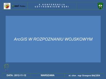 X K O N F E R E N C J A U Ż Y T K O W N I K Ó W E S R I ArcGIS W ROZPOZNANIU WOJSKOWYM DATA: 2012-11-12 WARSZAWA st. chor. mgr Grzegorz BĄCZEK X K O N F E R E N C J A U Ż Y T K O W N I K Ó W E S R I XVIII w. 20-LECIE MIĘDZYWOJENNE DZISIAJ DATA: 2012-11-12 WARSZAWA st. chor. mgr Grzegorz BĄCZEK X K O N F E R E N C J A U Ż Y T K O W N I K Ó W E S R I PLAN PREZENTACJI: 1. PRZEDSTAWIENIE MOŻLIWOŚCI PRAKTYCZNEGO ZASTOSOWANIA OPROGRAMOWANIA ArcGIS NA PRZYKŁADZIE PUŁKU ROZPOZNAWCZEGO, W ZAKRESIE: - DOWODZENIA - ZABEZPIECZENIA LOGISTYCZNEGO - ZARZĄDZANIA INFRASTRUKTURĄ WOJSKOWĄ - ELIMINOWANIA ZAGROŻEŃ NIEMILITARNYCH - PLANOWANIA I SZKOLENIA. DATA: 2012-11-12 WARSZAWA st. chor. mgr Grzegorz BĄCZEK X K O N F E R E N C J A U Ż Y T K O W N I K Ó W E S R I PLAN PREZENTACJI: 2. PRZEDSTAWIE SZABLONÓW UDOSTĘPNIONYCH NA BLOGU DEFENCE & INTELLIGENCE TAKICH JAK: - HELICOPTER LANDING ZONE - PATROL DATA CAPTURE - POSITION ANALYSIS TEMPLATE. ZADEMONSTROWANE ROZSZERZENIA ADD-IN, ZOSTANĄ NP.: PAN NAJCZĘŚCIEJ MAP TOOLS, UŻYWANE ArcPHOTO, ERG2008. DATA: 2012-11-12 WARSZAWA st. chor. mgr Grzegorz BĄCZEK X K O N F E R E N C J A U Ż Y T K O W N I K Ó W E S R I MILITARY ANALYST MOLE ROZSZERZENIA MILITARY ANALIST I MOLE dla ArcGIS. DATA: 2012-11-12 WARSZAWA st. chor. mgr Grzegorz BĄCZEK X K O N F E R E N C J A U Ż Y T K O W N I K Ó W E S R I MILITARY ANALYST MOLE ROZSZERZENIE ArcGIS MILITARY ANALYST UMOŻLIWIA: • ZARZĄDZANIE DANYMI; • PRACĘ Z WOJSKOWYMI FORMATAMI WSPÓŁRZĘDNYCH; • GEODEZYJNIE ODWZOROWANE ODLEGŁOŚCI; • ANALIZY TERENOWE 2D I 3D; • PRACĘ Z DWOMA KATEGORIAMI DANYCH GIS – – DTED Katalog RPF Katalog VPF Katalog RASTER • RASTER PRODUCT FORMAT (RPF) • DIGITAL TERRAIN ELEVATION DATA (DTED) VECTOR • VECTOR PRODUCT FORMAT (VPF) – VMAP 0, VMAP 1 • GŁÓWNI UŻYTKOWNICY: – ANALITYCY WYWIADU I ROZPOZNANIA DATA: 2012-11-12 WARSZAWA st. chor. mgr Grzegorz BĄCZEK X K O N F E R E N C J A U Ż Y T K O W N I K Ó W E S R I MILITARY ANALYST MOLE ZARZĄDZANIE DANYMI WYŚWIETLANIE KATALOGÓW RPF • • • PRZYCISK DODAWANIA KATALOGÓW DO ArcMAP SKOROWIDZE ZASIĘGÓW – KOLORYSTYCZNE OKREŚLANIE PRODUKTU OPCJE WYŚWIETLANIA DATA: 2012-11-12 WARSZAWA st. chor. mgr Grzegorz BĄCZEK X K O N F E R E N C J A U Ż Y T K O W N I K Ó W E S R I MILITARY ANALYST MOLE WYŚWIETLANIE DTED DATA: 2012-11-12 WARSZAWA st. chor. mgr Grzegorz BĄCZEK X K O N F E R E N C J A U Ż Y T K O W N I K Ó W E S R I MILITARY ANALYST MOLE WYŚWIETLANIE KATALOGÓW VPF DODAWANIA KATALOGÓW VPF DO ArcMAP • SKOROWIDZE ZASIĘGÓW • OPCJE WYŚWIETLANIA: – WYKORZYSTANIE FUNKCJI GEOSYM – WYŚWIETLANIE ZALEŻNE OD SKALI. DATA: 2012-11-12 WARSZAWA st. chor. mgr Grzegorz BĄCZEK MILITARY ANALYST MOLE X K O N F E R E N C J A U Ż Y T K O W N I K Ó W E S R I MILITARY OVERLAY EDITOR (MOLE) • ROZSZERZA PODSTAWOWĄ FUNKCJONALNOŚĆ ArcGIS PRZEZ DODANIE FUNKCJI TWORZENIA I ZARZĄDZANIA STANDARDOWĄ SYMBOLIZACJĄ WOJSKOWĄ – DEP. OBRONY USA MIL-STD-2525B – NATO APP6A • SYMBOLIZACJA WOJSKOWA – ELEMENTY SIŁ ZBROJNYCH – ZNAKI TAKTYCZNE – KOD 15 ZNAKÓW S DATA: 2012-11-12 WARSZAWA P G P U C I Z - - - F U S G st. chor. mgr Grzegorz BĄCZEK X K O N F E R E N C J A U Ż Y T K O W N I K Ó W E S R I MILITARY ANALYST MOLE SYMBOLE WOJSKOWE KONSTRUKCJA WARSTWY MOLE WARSTWA OBIEKTÓW + SYMBOL ID 15 ZNAKÓW = WARSTWA SYMBOLI MOLE DATA: 2012-11-12 WARSZAWA st. chor. mgr Grzegorz BĄCZEK X K O N F E R E N C J A U Ż Y T K O W N I K Ó W E S R I NARZĘDZIA KONWERSJI NARZĘDZIE PRZELICZANIA WSPÓŁRZĘDNYCH • KONWERSJA POMIĘDZY FORMATAMI • RYSOWANIE PUNKTU NA EKRANIE • CENTROWANIE WYŚWIETLANIA WG WSPÓŁRZĘDNYCH • MILITARY ANALYST MOLE -8 6.720 -79 1.800 0 13.770S 78 31.457W 12 3.420s 77 8.640w 12 4 55.2S 77 2 42.0W -1 26 20.4 -48 29 52.8 030719.20s -6000054 251818.00S 0573719.20W 325615.85S 0603950.17W 445527.09N/0931828.05W +324541.24/-1170731.8 37 47 45.0/ -122 22 48.3 +37 18 29.2/-121 50 50.8 34 0 0.0/-118 15 0.0 +38 59 38.8/-94 37 35.6 38 38.333N/90 20.519W INTEGRACJA Z INNYMI NARZĘDZIAMI MILITARY ANALYST DATA: 2012-11-12 WARSZAWA st. chor. mgr Grzegorz BĄCZEK X K O N F E R E N C J A U Ż Y T K O W N I K Ó W E S R I ArcGlobe Defense Solutions w ArcGlobe • WYŚWIETLANIE DANYCH MA • WYŚWIETLANIE DANYCH MOLE • MOŻLIWOŚĆ TWORZENIA KOPUŁ ZAGROŻEŃ 3D DATA: 2012-11-12 WARSZAWA st. chor. mgr Grzegorz BĄCZEK X K O N F E R E N C J A U Ż Y T K O W N I K Ó W E S R I MAPA TOPOGRAFICZNA MAPY SATELITARNE LANDING ZONE WIDOCZNOŚĆ DATA: 2012-11-12 WARSZAWA st. chor. mgr Grzegorz BĄCZEK X K O N F E R E N C J A U Ż Y T K O W N I K Ó W E S R I DATA: 2012-11-12 WARSZAWA DOWODZENIE st. chor. mgr Grzegorz BĄCZEK X K O N F E R E N C J A U Ż Y T K O W N I K Ó W E S R I DOWODZENIE PLAN PRZEMIESZCZENIA ZESPOŁU ZABEZPIECZENIA MEDYCZNEGO (ZZM) DATA: 2012-11-12 WARSZAWA st. chor. mgr Grzegorz BĄCZEK X K O N F E R E N C J A U Ż Y T K O W N I K Ó W E S R I DOWODZENIE PLAN PRZEMIESZCZENIA ZESPOŁU ZABEZPIECZENIA MEDYCZNEGO (ZZM) DATA: 2012-11-12 WARSZAWA st. chor. mgr Grzegorz BĄCZEK X K O N F E R E N C J A U Ż Y T K O W N I K Ó W E S R I SZKOLENIE MARSZE KWARTALNE, PRZEGRUPOWANIA NA POLIGONY. 1. ZGODNIE Z PROGRAMEM SZKOLENIA PODODZIAŁÓW ROZPOZNAWCZYCH MIN. RAZ NA KWARTAŁ STAN OSOBOWY JW. MUSI ODBYĆ MARSZ KWARTALNY. 2. W PRZYPADKU PRZEGRUPOWANIA NA POLIGON PIESZO, NA SPRZĘCIE LUB SPOSOBEM KOMBINOWANYM WYMAGANA JEST MAPA Z ZAZNACZONĄ TRASĄ PRZEGRUPOWANIA ORAZ ELEMENTAMI DODATKOWYMI NP. MIEJSCA POSTOJÓW, PUNKTÓW SANITARNYCH. DATA: 2012-11-12 WARSZAWA st. chor. mgr Grzegorz BĄCZEK X K O N F E R E N C J A U Ż Y T K O W N I K Ó W E S R I DATA: 2012-11-12 WARSZAWA SZKOLENIE st. chor. mgr Grzegorz BĄCZEK X K O N F E R E N C J A U Ż Y T K O W N I K Ó W E S R I SZKOLENIE WIZUALIZACJA INFORMACJI GEOGRAFICZNEJ - POJEDYNCZE WARSTWY TEMATYCZNE; - WYPLOTY WIELKOFORMATOWE. WYS OKO ŚĆ (m) DATA: 2012-11-12 WARSZAWA st. chor. mgr Grzegorz BĄCZEK X K O N F E R E N C J A U Ż Y T 