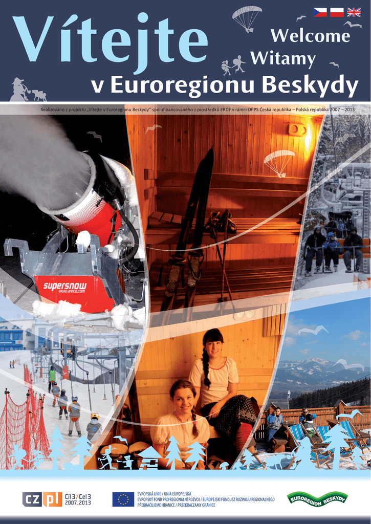 Vítejte Welcome Witamy v Euroregionu Beskydy Realizováno z projektu „Vítejte v Euroregionu Beskydy“ spolufinancovaného z prostředků ERDF v rámci OPPS Česká republika – Polská republika 2007 – 2013 Zwardoń SKI – z miłości do śniegu W 2010 roku postanowiliśmy założyć spółkę z o.o. SKI-BESKIDY, której celem jest realizacja projektu pn. „Utworzenie nowoczesnego ośrodka sportów zimowych w Zwardoniu”. Już 27 grudnia 2012 na mapie polskich ośrodków narciarskich przybyło nowe miejsce – odbyło się oficjalne otwarcie Stacji Narciarskiej Zwardoń – SKI w Zwardoniu. Freeski świetnie się sprawdziło i dużo klientów od „pierwszego zjechania” polubiło naszą stację. Z dnia na dzień staramy się wkładać jak najwięcej pracy i serca w Naszą Stację Narciarską Zwardoń-SKI. Stacja ta dysponuje pierwszą 4 osobową kanapą w Beskidzie Żywieckim. Doskonałe warunki śniegowe zapewnia 6,5 miliona litrów wody, zgromadzonych w zbiorniku na szczycie Małego Rachowca wraz z 9 potężnymi armatkami firmy Wintertechnik, oświetleniem i dwoma ratrakami. Przez ostatni rok został zaobserwowany zwiększony ruch turystyczny regionu, co zapewniło odpowiednią reklamę obiektu i okolicy. Podstawowym produktem, jaki oferujemy naszym klientom, to usługi rekreacyjne, noclegowe, gastronomiczne. Standard świadczonych usług w naszym ośrodku pozwolił stać się wiodącym centrum sportów zimowych na pograniczu polsko-czesko-słowackim. Organizujemy zawody narciarskie, oraz inne imprezy towarzyszące dla regionu. W Zwardoniu panuje specyficzny mikroklimat gdzie pokrywa śniegu utrzymuje się od 115 do 130 dni w roku, a sama miejscowość jest „zawsze” narciarska. Już przed wojną przyjeżdżały tu pociągi z Warszawy z narciarzami. Sam Zwardoń to miejscowość typowo turystyczna i obecnie posiada bardzo dobrze rozwiniętą bazę noclegową – około 1000 miejsc. Zapraszamy do korzystania z: • Śnieżnego Raju dla dzieci • wyciągu Baby Li • Snow Parku • Kolejki Linowej 4 osobowej – naśnieżanej i oświetlonej, z ratrakowanymi trasami dwa razy dziennie! • Bawialni – ZWARDOŃLAND • Wypożyczalni sprzętu narciarskiego, snowboardowego oraz skitury, biegówek, monoski, bigfooty, rakiet śnieżnych, snowtubingu. • szkoły narciarskiej i snowboardowej • przedszkola narciarskiego podczas ferii zimowych • 3 min od stacji Granitowe SPA & WELLNESS – www.dwgranit.pl • 10 km od stacji Karczma Ochodzita w Koniakowie – www. ochodzita.com.pl Więcej informacji na stronie: www.zwardon-ski.pl Zwardoń SKI – z lásky k sněhu Můžete zde využít: sněhový ráj pro dě vlek Baby Li Snow Park čtyřsedačková lanovka – zasněžené a osvětlené trasy upravované dvakrát denně • herna – ZWARDOŃLAND • půjčovna lyžařského a snowbordového vybavení, skútrů, běžek, monoski (speciální lyže pro handicapované), bigfooty (malé snowboardy), sněžnice, snowtubing (jízda ve speciálním člunu ve sněhovém korytu) • lyžařská a snowboardová škola • lyžařská školka během zimních prázdnin • 3 minuty od střediska se nachází Granitowe SPA & WELLNESS – www.dwgranit.pl • 10 km od střediska naleznete restauraci Ochodzita v Koniakowie – www.ochodzita.com.pl Pro více informací navš vte: www.zwardon-ski.pl • • • • V roce 2010 jsme se rozhodli založit společnost SKI-BESKIDY, jež má za cíl realizaci projektu s názvem „Vytvoření moderního střediska zimních sportů v Zwardoniu”. Už 27. prosince 2012 přibylo na mapě polských lyžařských středisek nové místo – konalo se slavnostní otevření Lyžařského střediska Zwardoń – SKI v Zwardoniu – lyžovalo se skvěle a mnoho návštěvníků si od první jízdy naše středisko oblíbilo. Den co den se snažíme do našeho lyžařského střediska dávat co nejvíce práce i srdce. Lyžařské středisko disponuje první čtyřsedačkovou lanovkou v żywiecké čás Beskyd. Výborné lyžařské podmínky jsou zajištěny díky 6,5 milionům litrů vody nahromaděných v nádrži na š tu Malého Rachowce, deví výkonným dělům, osvětlení a dvěma sněhovým rolbám. V minulém roce byl v regionu zaznamenán zvýšený turis cký ruch, což zajis lo kraji dostatečnou reklamu. Hlavní nabídkou pro návštěvníky jsou rekreační, ubytovací a gastronomické služby. Standard poskytovaných služeb v našem centru nám umožnil stát se hlavním centrem zimních sportů na polsko-česko-slovenském pohraničí. Organizujeme lyžařské závody a další společenské akce v regionu. V Zwardoniu je specifické mikroklima, díky kterému se zde sněhová pokrývka udrží 115 až 130 dní v roce a místo samotné je „vždy” lyžařské. Už před válkou zde přivážely vlaky lyžaře z Varšavy. Samotný Zwardoń je typické turis cké místo s velice dobře rozvinutou sí ubytování – více než 1000 míst. Zwardoń SKI Resort – made of love to the snow In 2010, we decided to establish the company that we named SKI-BESKIDY. Its purpose is to put the project called „Crea on of a modern winter sports centre in Zwardoń“ into life. The new ski resort was added to the map of Polish ski resorts as early as on 27th December 2012, when the opening ceremony of the Zwardoń SKI Resort was held. A number of visitors have taken a fancy to our resort since they took their first ski-drive. A day a er day we have been trying to invest as much of our work and heart as possible to our ski resort. Our ski resort can boast with the first four-seater chairli in the Żywiecki Beskydy Mountains. Excellent ski condi ons are ensured due to 6.5 million litres of water accumulated in the reservoir on the top of Maly Rachowec Mountain as well as due to nine powerful snow-cannons, electric lights and two snowcats. More visitors were no ced in the region last year, which provided sufficient promo on to the area. Recrea onal, 