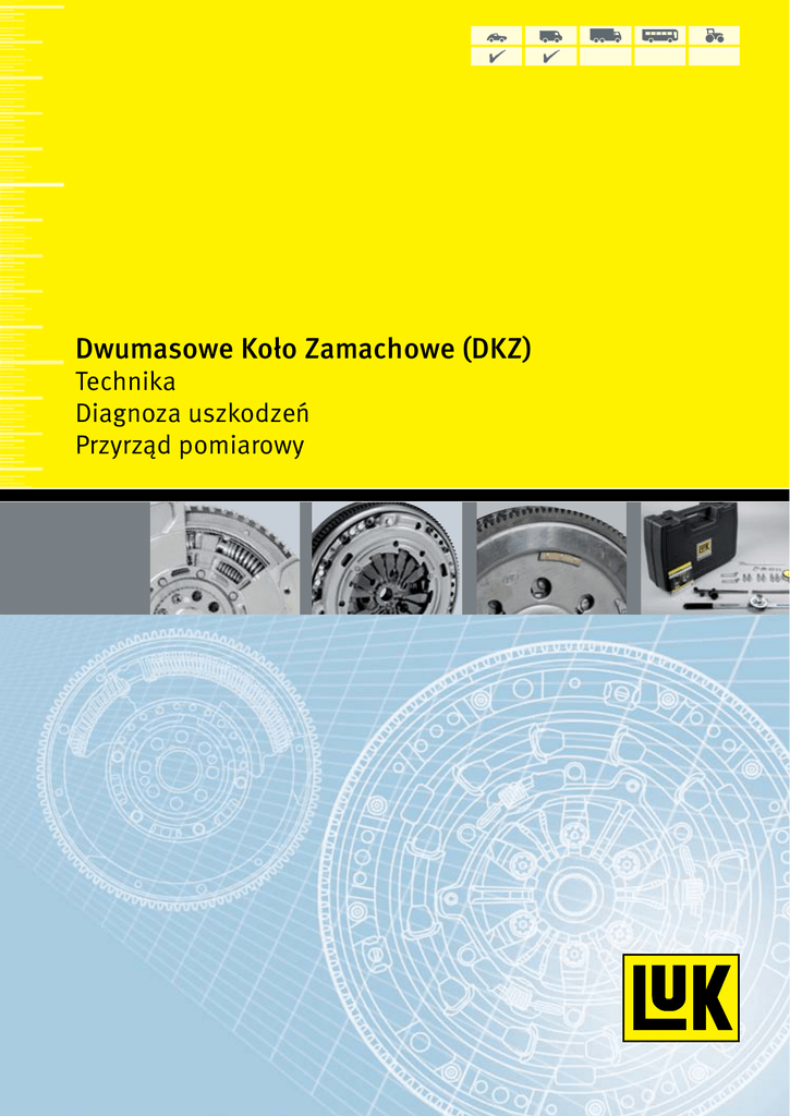 Dwumasowe Koło Zamachowe (DKZ) Technika Diagnoza uszkodzeń Przyrząd pomiarowy Spis treści Spis treści Strona 1 Historia 2 Dwumasowe Koło Zamachowe – (DKZ) 4 2.1 Dlaczego DKZ? 6 2.2 Budowa 6 2.3 Zasada działania 7 3 Elementy DKZ 8 3.1 Masa pierwotna 8 3.2 Masa wtórna 9 3.3 Łożysko 10 3.4 Tarcza zabierakowa 12 3.5 Pierścień kontroli tarcia 13 3.6 Sprężyny łukowe 14 3.7 Różne wersje DKZ 16 4 DKZ diagnoza uszkodzeń 18 4.1 Porady ogólne 18 4.2 Hałasy 19 4.3 Chip tuning 20 4.4 Ocena wizualna / zdjęcia uszkodzeń 21 5 Specjalne narzędzie do diagnozy DKZ 2 28 Od konwencjonalnego tłumika drgań skrętnych do dwumasowego koła zamachowego Od konwencjonalnego tłumika drgań skrętnych do dwumasowego koła zamachowego Gwałtowny rozwój technologii motoryzacyjnej na przestrzeni ostatnich dekad spowodował powstanie bardziej wydajnych silników i wzrost wymagań, co do komfortu jazdy. Projekty coraz lżejszych samochodów z nadwoziami optymalizowanymi w tunelach aerodynamicznych sprawiły, że inne źródła hałasu stały się bardziej odczuwalne przez kierowców. Dodatkowo przyczyniają się do tego, „odchudzone”, ekstremalnie niskoobrotowe silniki i nowe generacje skrzyń biegów pracujące na rzadszych olejach. W połowie lat osiemdziesiątych, rozwijana przez wiele lat technologia klasycznych tłumików drgań skrętnych osiągnęła swój limit. Stały wzrost mocy jednostek napędowych, wraz ze wzrostem momentów obrotowych i redukcją wymiarów komory silnika – doprowadził do przekroczenia granicy możliwości tłumienia drgań w klasycznym układzie. Intensywne badania prowadzone przez LuK, zaowocowały prostym, jednakże bardzo efektywnym rozwiązaniem – Dwumasowym kołem zamachowym – DKZ, nowym rozwiązaniem tłumienia drgań w układzie przeniesienia napędu. 3 Historia 1Historia Ułożenie sprężyn w pierwszej generacji DKZ było identyczne jak w konwencjonalnym tłumiku drgań skrętnych, gdzie sprężyny amortyzujące zostały zamontowane promieniowo blisko środka, przez co mogły zapewnić jedynie ograniczoną sprawność tłumienia. To rozwiązanie było skuteczne dla tłumienia drgań w sześciocylindrowych jednostkach napędowych generujących relatywnie małe drgania. Inaczej jest w czterocylindrowych silnikach, generujących większe nieregularności i w konsekwencji większe drgania. Użycie sprężyn o większej średnicy i przesunięcie ich w kierunku zewnętrznej krawędzi, pięciokrotnie poprawia możliwości tłumienia, nie zajmując przy tym dodatkowego miejsca. Schemat działania 1985 • Masa pierwotna • Sprężyna/system tłumienia • Masa wtórna 4 Dziś Historia Rozwój DKZ 1985 Dziś • Masa pierwotna • Sprężyna/system tłumienia • Masa wtórna Wielkość sprzedaży 1990-Dziś Dziś roczna produkcja DKZ przez LuK przekracza 9,000,000 sztuk Ilość rocznie milionów million 1990 Dziś 5 Dwumasowe koło zamachowe DKZ 2 Dwumasowe koło zamachowe DKZ 2.1 Dlaczego DKZ? W skutek cyklicznej pracy silnika tłokowego generowane są w układzie napędowym drgania skrętne. W efekcie występuje grzechotanie skrzyni biegów, łoskot nadwozia i wibracje związane ze zmianą siły wysprzęglania, powodując hałas i pogorszenie komfortu jazdy. Celem prac rozwojowych nad DKZ było najlepsze możliwe tłumienie drgań skrętnych w układzie przeniesienia napędu generowanych przez silnik. Dzięki swojemu integralnemu systemowi sprężyn / tłumików, dwumasowe koło zamachowe niemal całkowicie pochłania drgania skrętne. W rezultacie zapewnia bardzo dobre tłumienie wibracji. 2.2Budowa Standardowe DKZ składa się z masy pierwotnej (1) i masy wtórnej (6). Standardowe dwumasowe koło zamachowe 1. Masa pierwotna 2. Łożysko ślizgowe 3. Sprężyny łukowe 4. Tarcza zabierakowa 5. Pokrywa (przekrój) 6. Masa wtórna Dwie oddzielne masy są połączone dzięki systemowi sprężyn / tłumików wspartemu przez kulkowe łożysko promieniowe lub łożysko ślizgowe (2), dzięki czemu mogą przemieszczać się względem siebie. Masa pierwotna z wieńcem koła zamachowego napędzana przez silnik, jest trwale przymocowana do wału korbowego. Tworzy ona razem z pokrywą (5) wnękę, w której pracują sprężyny łukowe. System tłumienia składa się ze sprężyny łukowych (3), ułożonych w specjalnych ślizgach w kanale tłumienia, które efektywnie spełniają rolę idealnego tłumika drgań skrętnych. 6 Ślizgi zapewniają właściwe prowadzenie sprężyn podczas ich pracy, a smar wypełniający kanał tłumienia, do minimum redukuje zużycie pomiędzy ślizgami i sprężynami. Moment obrotowy jest przenoszony przez tarczę zabierakową (4). Jest ona przynitowana do masy wtórnej ze zderzakami umieszczonymi pomiędzy sprężynami łukowymi. Masa wtórna pomaga zwiększyć moment bezwładności po stronie skrzyni biegów. Otwory wentylacyjne zapewniają lepsze odprowadzanie ciepła. Jako że DKZ posiada integralny system sprężyn/tłumików, powszechnie używana jest sztywna tarcza sprzęgła bez tłumika drgań. Dwumasowe koło zamachowe DKZ 2.3 Zasada działania Zasada funkcjonowania DKZ jest prosta i zapewnia dużą sprawność. Dzięki dodatkowej masie osadzonej na wałku sprzęgłowym, punkt rezonansu, który w klasycznym układzie tłumików występuje między 1200 obr. i 2400 obr., został przesunięty w obszar niższych zakresów prędkości obrotowych. Zapewnia to świetne tłumienie drgań występujących nawet na biegu jałowym. Z konwencjonalnym kołem zamachowym Z dwumasowym kołem zamachowym • Silnik • Sprzęgło • Skrzynia biegów • Tłumik drgań skrętnych • Masa pierwotna • Masa wtórna Przeniesienie drgań skrętnych • Silnik • Skrzynia biegów • Silnik • Skrzynia biegów Z konwencjonalnym kołem zamachowym: W rozpowszechnionej do niedawna konstrukcji z konwencjonalnym kołem zamachowym i tłumikami drgań w tarczy sprzęgła, drgania skrętne w zakresach biegu jałowego są przenoszone praktycznie