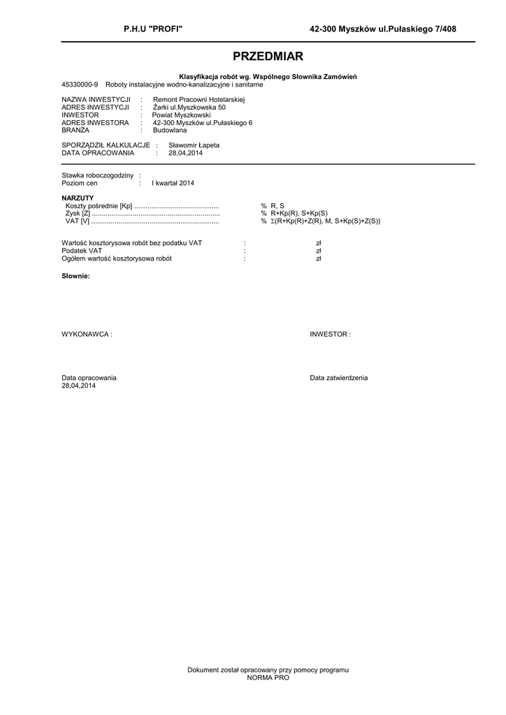 P.H.U "PROFI" 42-300 Myszków ul.Pułaskiego 7/408 PRZEDMIAR 45330000-9 Klasyfikacja robót wg. Wspólnego Słownika Zamówień Roboty instalacyjne wodno-kanalizacyjne i sanitarne NAZWA INWESTYCJI ADRES INWESTYCJI INWESTOR ADRES INWESTORA BRANŻA : : : : : Remont Pracowni Hotelarskiej Żarki ul.Myszkowska 50 Powiat Myszkowski 42-300 Myszków ul.Pułaskiego 6 Budowlana SPORZĄDZIŁ KALKULACJE : DATA OPRACOWANIA : Stawka roboczogodziny : Poziom cen : Sławomir Łapeta 28,04,2014 I kwartał 2014 NARZUTY Koszty pośrednie [Kp] ............................................ Zysk [Z] .................................................................. VAT [V] .................................................................. Wartość kosztorysowa robót bez podatku VAT Podatek VAT Ogółem wartość kosztorysowa robót % R, S % R+Kp(R), S+Kp(S) % Σ(R+Kp(R)+Z(R), M, S+Kp(S)+Z(S)) : : : zł zł zł Słownie: WYKONAWCA : INWESTOR : Data opracowania 28,04,2014 Data zatwierdzenia Dokument został opracowany przy pomocy programu NORMA PRO OGÓLNA CHARAKTERYSTYKA OBIEKTU -2Norma PRO Wersja 4.25 Licencja: 20085 dla PHU PROFI Remont Pracowni Hotelarskiej ZS wŻarkach PRZEDMIAR Lp. Podstawa Opis i wyliczenia Remont Pracowni Hotelarskie ZS w Żarkach 1 KNR 4-04 Rozebranie posadzek z deszczułek mocowanych na lepik - do 61 deszczułek 0501-04 na 1 m2 posadzki ( sala główna) 47.1 2 KNR 4-04 0504-03 j.m. m2 m2 48.9 m2 3 KNR-W 4-01 Wykucie otworów w ścianach z cegieł o grubości ponad 1/2 ceg. na zaprawie 0331-03 wapiennej lub cementowo-wapiennej dla otworów drzwiowych 2,5*2,5*0,25=1,56 1.56 m3 4 KNR-W 4-01 Wykucie gniazd o głębokości 1 ceg. dla belek stalowych w ścianach z cegieł 0347-05 na zaprawie cementowej 2 gniazd. 5 KNR-W 4-01 Wykonanie przesklepień otworów w ścianach z cegieł - dostarczenie i obsa0314-04 dzenie belek stalowych do I NP 180 mm 2*3,0=6 6.0 m 6 KNR-W 4-01 Przebicie otworów w ścianach z cegieł o grubości 2 1/2 ceg. na zaprawie ce0335-19 mentowej 2 szt. 7 KNR-W 4-01 Wykucie bruzd poziomych lub pionowych o przekroju do 0.023 m2 w elemen0210-01 tach z betonu żwirowego 6.5 m 8 KNR-W 4-01 Wykucie bruzd pionowych 1/4 x 1/2 ceg. w ścianach z cegieł na zaprawie ce0341-01 mentowo-wapiennej 5.3 m 9 KNR-W 4-01 - usunięcie z piwnic budynku gruzu i ziemi 0106-05 4.5 m3 m3 gniazd. m szt. m m m3 10 KNR-W 4-01 Wywiezienie samochodami samowyładowczymi gruzu z rozbieranych kons0109-17 trukcji ceglanych na odległość 4 km 0109-20 4.5 m3 11 KNR-W 4-01 Zamurowanie bruzd pionowych lub pochyłych o przekroju 1/4 x 1/4 ceg. w 0327-01 ścianach z cegieł 5.3 m m3 m 12 KNR-W 4-01 Wykonanie pasów tynków zwykłych kat.III o szer. do 15 cm na murach z cegieł m 0705-01 lub ścianach z betonu pokrywających bruzdy uprzednio zamurowane cegłami lub dachówkami 8.0 m m2 m2 14 KNR-W 2-02 Ościeżnice stalowe dla drzwi wewnątrzlokalowych i wejściowych do lokalu ma- szt. 1025-03 lowane dwukrotnie na budowie typu FD8 1 szt. 15 KNR-W 2-02 Skrzydła drzwiowe płytowe wewnętrzne szklone jednoskrzydłowe o powierzch- m2 1022-04 ni do 1.6 m2 oszklone szybą o powierzchni ponad 0.25 m2 fabrycznie wykończone 1 m2 16 NNRNKB (z.XI) okładziny jednowarstwowe z płyt gipsowo-kartonowych Rigips na rusz202 2028-04 tach metalowych mocowanych bezpośrednio do stropu (okładziny rur c.o) 17,2*0,4*0,4= 2.75 17 KNR 0-12II 1118-08 m2 m2 Posadzki płytkowe z kamieni sztucznych; płytki 30x30 cm układane na klej me- m2 todą zwykłą(pracownia ,pokój, magazyn) 47,1+48,9+23,54=119,54m2 -3- Norma PRO Wersja 4.25 Licencja: 20085 dla PHU PROFI Razem m2 Rozebranie posadzek z płytek ceramicznych (sala po byłej kotłowni) 13 NNRNKB (z.XI) ścianki działowe z płyt gipsowo-kartonowych Rigips na pojedynczych 202 2024-03 rusztach metalowych dwuwarstwowe z pokryciem obustronnym 100 2,2+3,0)*3,0-(0,9*2,0)=18,0m2 18.0 Poszcz 47.100 RAZEM 47.100 48.900 RAZEM 48.900 1.560 RAZEM 1.560 2.000 RAZEM 2.000 6.000 RAZEM 6.000 2.000 RAZEM 2.000 6.500 RAZEM 6.500 5.300 RAZEM 5.300 4.500 RAZEM 4.500 4.500 RAZEM 4.500 5.300 RAZEM 5.300 8.000 RAZEM 8.000 18.000 RAZEM 18.000 1.000 RAZEM 1.000 1.000 RAZEM 1.000 2.750 RAZEM 2.750 Remont Pracowni Hotelarskiej ZS wŻarkach Lp. Podstawa PRZEDMIAR Opis i wyliczenia 119.54 18 KNR AT-23 0216-05 j.m. m2 Cokoliki przyścienne z kształtek cokołowych o wysokości 10 cm na zaprawie cienkowarstwowej; kształtki o długości 18-28 cm 29,1+28,8+19,9=77,8 77.8 m 19 KNR 0-12II 0829-08 Licowanie ścian płytkami o wymiarach 30x30 cm na klej metodą zwykłą( Łazienka) 19.0 m2 20 KNR 4-02 0111-04 Wstawienie trójnika z żeliwa ciągliwego ocynkowanego o śr. 65 mm szt. 1 szt. m m2 21 KNR-W 2-15 Rurociągi stalowe ocynkowane o śr. nominalnej 20 mm o połączeniach gwinto- m 0106-02 wanych, na ścianach w budynkach niemieszkalnych 19.5 m 22 KNR-W 2-15 Zawory przelotowe i zwrotne instalacji wodociągowych z rur stalowych o śr. no- szt. 0130-02 minalnej 20 mm 1 szt. 23 KNR-W 2-15 Rurociągi z PVC kanalizacyjne o śr. 110 mm w gotowych wykopach, wewnątrz m 0203-03 budynków o połączeniach wciskowych 4.5 m 24 KNR-W 2-15 Rurociągi z PVC kanalizacyjne o śr. 50 mm w gotowych wykopach, wewnątrz 0203-01 budynków o połączeniach wciskowych 5.0 m 25 KNR-W 2-15 Dodatki za wykonanie podejść odpływowych z PVC o śr. 110 mm o połącze0211-03 niach wciskowych 1 podej. 26 KNR-W 2-15 Dodatki za wykonanie podejść odpływowych z PVC o śr. 50 mm o połącze0211-01 niach wciskowych 2 podej. 27 KNR-W 2-15 Umywalki pojedyncze porcelanowe z syfonem gruszkowym 0230-02 1 kpl. 28 KNR-W 2-15 Ustępy z płuczką ustępową typu "kompakt" 0233-03 1 kpl. 29 KNR-W 2-15 Brodziki natryskowe 0232-02 1 kpl. 30 KNR-W 2-15 Baterie umywalkowe lub zmywakowe ścienne o śr. nominalnej 15 mm 0137-01 1 szt. 31 KNR-W 2-15 Baterie natryskowe z natryskiem przesuwnym o śr. nominalnej 15 mm 0137-09 1 szt. m podej. podej. kpl. kpl. kpl. szt. szt. 32 KNR-W 2-15 Zawory przelotowe i zwrotne instalacji wodociągowych z rur stalowych o śr. n
