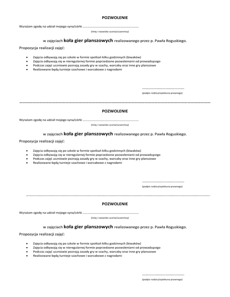POZWOLENIE Wyrażam zgodę na udział mojego syna/córki ……………………………………………………………. (imię i nazwisko ucznia/uczennicy) w zajęciach koła gier planszowych realizowanego przez p. Pawła Roguskiego. Propozycja realizacji zajęć: • • • • Zajęcia odbywają się po szkole w formie spotkań kilku godzinnych (biwaków) Zajęcia odbywają się w nieregularnej formie poprzedzone pozwoleniami od prowadzącego Podczas zajęć uczniowie poznają zasady gry w szachy, warcaby oraz inne gry planszowe Realizowane będą turnieje szachowe i warcabowe z nagrodami ……………………………………. (podpis rodzica/opiekuna prawnego) ………………………………………………………………………………………………………………………………………………………… POZWOLENIE Wyrażam zgodę na udział mojego syna/córki ……………………………………………………………. (imię i nazwisko ucznia/uczennicy) w zajęciach koła gier planszowych realizowanego przez p. Pawła Roguskiego. Propozycja realizacji zajęć: • • • • Zajęcia odbywają się po szkole w formie spotkań kilku godzinnych (biwaków) Zajęcia odbywają się w nieregularnej formie poprzedzone pozwoleniami od prowadzącego Podczas zajęć uczniowie poznają zasady gry w szachy, warcaby oraz inne gry planszowe Realizowane będą turnieje szachowe i warcabowe z nagrodami ……………………………………. (podpis rodzica/opiekuna prawnego) …………………………………………………………………………………………………………………………………………………………………….. POZWOLENIE Wyrażam zgodę na udział mojego syna/córki ……………………………………………………………. (imię i nazwisko ucznia/uczennicy) w zajęciach koła gier planszowych realizowanego przez p. Pawła Roguskiego. Propozycja realizacji zajęć: • • • • Zajęcia odbywają się po szkole w formie spotkań kilku godzinnych (biwaków) Zajęcia odbywają się w nieregularnej formie poprzedzone pozwoleniami od prowadzącego Podczas zajęć uczniowie poznają zasady gry w szachy, warcaby oraz inne gry planszowe Realizowane będą turnieje szachowe i warcabowe z nagrodami ……………………………………. (podpis rodzica/opiekuna prawnego)