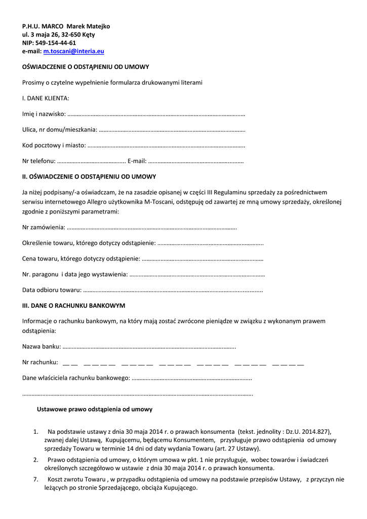P.H.U. MARCO Marek Matejko ul. 3 maja 26, 32-650 Kęty NIP: 549-154-44-61 e-mail: [email protected] OŚWIADCZENIE O ODSTĄPIENIU OD UMOWY Prosimy o czytelne wypełnienie formularza drukowanymi literami I. DANE KLIENTA: Imię i nazwisko: …………………………………………………………………………………………………… Ulica, nr domu/mieszkania: …………………………………………………………………………………. Kod pocztowy i miasto: ……………………………………………………………………………………….. Nr telefonu: …………………………………….. E-mail: ……………………………………………...……. II. OŚWIADCZENIE O ODSTĄPIENIU OD UMOWY Ja niżej podpisany/-a oświadczam, że na zasadzie opisanej w części III Regulaminu sprzedaży za pośrednictwem serwisu internetowego Allegro użytkownika M-Toscani, odstępuję od zawartej ze mną umowy sprzedaży, określonej zgodnie z poniższymi parametrami: Nr zamówienia: ………………………………………………………………………………………………. Określenie towaru, którego dotyczy odstąpienie: ………………………………………………………….. Cena towaru, którego dotyczy odstąpienie: …………………………………………………………………… Nr. paragonu i data jego wystawienia: …………………………………………………………………………… Data odbioru towaru: ………………………………………………………………………………………............... III. DANE O RACHUNKU BANKOWYM Informacje o rachunku bankowym, na który mają zostać zwrócone pieniądze w związku z wykonanym prawem odstąpienia: Nazwa banku: …………………………………………………………………………………………..……. Nr rachunku: __ __ __ __ __ __ __ __ __ __ __ __ __ __ __ __ __ __ __ __ __ __ __ __ __ __ Dane właściciela rachunku bankowego: ………………………………………………………………….. …………………………………………………………………………………………………………………………………. Ustawowe prawo odstąpienia od umowy 1. Na podstawie ustawy z dnia 30 maja 2014 r. o prawach konsumenta (tekst. jednolity : Dz.U. 2014.827), zwanej dalej Ustawą, Kupującemu, będącemu Konsumentem, przysługuje prawo odstąpienia od umowy sprzedaży Towaru w terminie 14 dni od daty wydania Towaru (art. 27 Ustawy). 2. Prawo odstąpienia od umowy, o którym umowa w pkt. 1 nie przysługuje, wobec towarów i świadczeń określonych szczegółowo w ustawie z dnia 30 maja 2014 r. o prawach konsumenta. 7. Koszt zwrotu Towaru , w przypadku odstąpienia od umowy na podstawie przepisów Ustawy, z przyczyn nie leżących po stronie Sprzedającego, obciąża Kupującego. 8. Konsument ponosi odpowiedzialność za zmniejszenie wartości rzeczy będące wynikiem korzystania z niej w sposób wykraczający poza konieczny do stwierdzenia charakteru, cech i funkcjonowania rzeczy. W takim przypadku cena Towaru, podlegająca zwrotowi zostanie proporcjonalnie zmniejszona. Oświadczam, że zapoznałem/łam się z warunkami odstąpienia od umowy w trybie opisanym w części Regulaminu sprzedaży za pośrednictwem serwisu internetowego Allegro użytkownika M-Toscani , w tym opisanymi tam warunkami zwrotu towarów. Data: …………………………………… …………………………………………. Podpis klienta Po wypełnieniu formularza prosimy o jego odesłanie na poniższy adres. W celu przyspieszenia zwrotu ceny sugerujemy przesłanie wraz z niniejszym formularzem towaru, którego dotyczy odstąpienie oraz dowodu jego nabycia (najlepiej oryginału paragonu). P.H.U. MARCO Marek Matejko ul. 3 maja 26, 32-650 Kęty z dopiskiem „ZWROT”.