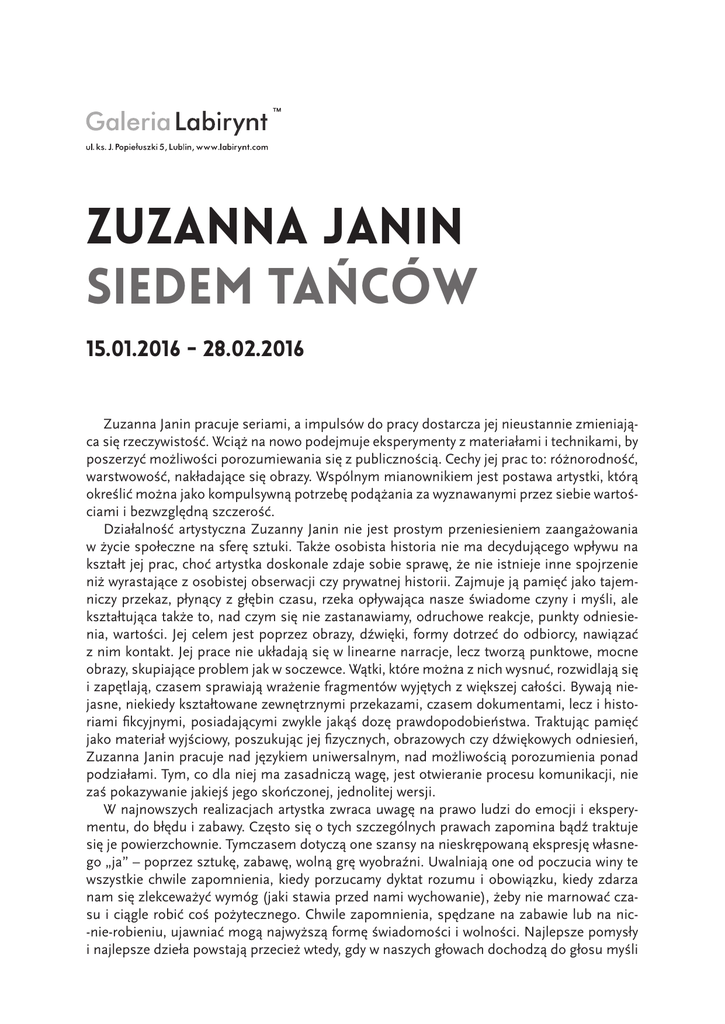 Zuzanna Janin siedem tańców 15.01.2016 - 28.02.2016 Zuzanna Janin pracuje seriami, a impulsów do pracy dostarcza jej nieustannie zmieniająca się rzeczywistość. Wciąż na nowo podejmuje eksperymenty z materiałami i technikami, by poszerzyć możliwości porozumiewania się z publicznością. Cechy jej prac to: różnorodność, warstwowość, nakładające się obrazy. Wspólnym mianownikiem jest postawa artystki, którą określić można jako kompulsywną potrzebę podążania za wyznawanymi przez siebie wartościami i bezwzględną szczerość. Działalność artystyczna Zuzanny Janin nie jest prostym przeniesieniem zaangażowania w życie społeczne na sferę sztuki. Także osobista historia nie ma decydującego wpływu na kształt jej prac, choć artystka doskonale zdaje sobie sprawę, że nie istnieje inne spojrzenie niż wyrastające z osobistej obserwacji czy prywatnej historii. Zajmuje ją pamięć jako tajemniczy przekaz, płynący z głębin czasu, rzeka opływająca nasze świadome czyny i myśli, ale kształtująca także to, nad czym się nie zastanawiamy, odruchowe reakcje, punkty odniesienia, wartości. Jej celem jest poprzez obrazy, dźwięki, formy dotrzeć do odbiorcy, nawiązać z nim kontakt. Jej prace nie układają się w linearne narracje, lecz tworzą punktowe, mocne obrazy, skupiające problem jak w soczewce. Wątki, które można z nich wysnuć, rozwidlają się i zapętlają, czasem sprawiają wrażenie fragmentów wyjętych z większej całości. Bywają niejasne, niekiedy kształtowane zewnętrznymi przekazami, czasem dokumentami, lecz i historiami fikcyjnymi, posiadającymi zwykle jakąś dozę prawdopodobieństwa. Traktując pamięć jako materiał wyjściowy, poszukując jej fizycznych, obrazowych czy dźwiękowych odniesień, Zuzanna Janin pracuje nad językiem uniwersalnym, nad możliwością porozumienia ponad podziałami. Tym, co dla niej ma zasadniczą wagę, jest otwieranie procesu komunikacji, nie zaś pokazywanie jakiejś jego skończonej, jednolitej wersji. W najnowszych realizacjach artystka zwraca uwagę na prawo ludzi do emocji i eksperymentu, do błędu i zabawy. Często się o tych szczególnych prawach zapomina bądź traktuje się je powierzchownie. Tymczasem dotyczą one szansy na nieskrępowaną ekspresję własnego „ja” – poprzez sztukę, zabawę, wolną grę wyobraźni. Uwalniają one od poczucia winy te wszystkie chwile zapomnienia, kiedy porzucamy dyktat rozumu i obowiązku, kiedy zdarza nam się zlekceważyć wymóg (jaki stawia przed nami wychowanie), żeby nie marnować czasu i ciągle robić coś pożytecznego. Chwile zapomnienia, spędzane na zabawie lub na nic-nie-robieniu, ujawniać mogą najwyższą formę świadomości i wolności. Najlepsze pomysły i najlepsze dzieła powstają przecież wtedy, gdy w naszych głowach dochodzą do głosu myśli zepchnięte w ciemność nieświadomości. Gdy tańczysz, śpiewasz, leżysz na trawie – po prostu czujesz życie, uciekasz od nakazu bycia użytecznym. Użytecznym – dla władzy wszelkiej maści. Cieszysz się życiem i wolnością. Zabawa może jednak stać się towarem i obiektem kontroli. W takim wypadku człowiek zamienia się w przedmiot manipulacji. Dlatego właśnie aktywizm polityczny artystka wiąże ze spojrzeniem w głąb siebie. Autorefleksja i wyostrzona świadomość są niezbędne do kultywowania wolności. Jej wewnętrzna, wręcz cielesna potrzeba związana jest z protestem wobec niesprawiedliwości, z obroną słabszych. Jest to polityczność wrodzona, osobista – jako dziedzictwo i jako wyzwanie. Inspiruje się tymi członkiniami i członkami własnej rodziny, którzy mieli w życiorysach przeszłość rewolucyjną i emancypacyjną. Dlatego nie tylko ona sama jest w swojej sztuce miarą czasu i przestrzeni – o czym pisała kiedyś Olga Tokarczuk – lecz ona i jej rodzinny bagaż są narzędziem, dzięki któremu tworzy swoje prace. Są źródłem całego świata jej sztuki. Stanowią bowiem laboratorium badawcze zdarzeń, dostarczają niezliczonej ilości przykładów, są doskonałym sposobem na dotykanie dzisiejszego świata, ze szczególnym uwzględnieniem rzeczywistości polskiej. Artystka tworzy jakby zapętlony film z pamięci, traktując ją jako materiał do pracy, znajdując w tym, co znane, osobiste czy uniwersalne, nowe, nieoczekiwane połączenia. * Pamięć jest miejscem, z którego Zuzanna Janin obserwuje świat zewnętrzny. Swoje prace, zakorzenione w doświadczeniu i obserwacji, otwiera na idee nas wszystkich. Wystawa Siedem tańców dobrze pokazuje tę rozpiętość – od jednostki do społeczności. Od tego, co osobiste, do tego, co da się uogólnić. Pokazuje nie tyle czające się między tymi obszarami napięcie, ile raczej płynność, łączenie się jednego z drugim. Znajdziemy tutaj realizacje rzeźbiarskie z wyraźnym odniesieniem osobistym. Niewielkie rzeźby – Siedmiu ojców – umieszczone zostały na pniach pociętego drzewa. Te pnie, zachowujące surowość oraz naturalność biologicznej formy, tracą neutralność właściwą postumentom i dominują nad tym, co zostało na nich ustawione. Rzeźby są bardzo niewielkie, jak lalki w rękach dziecka, i wizualnie jakby nikną w zestawieniu z bryłami drewna. Ten kontrast powtarza wykonanie rzeźb z lekko prześwitującej żywicy epoksydowej. Ich ulotność i szklistość kontrastuje z brutalną materialnością drewna. Siedmiu ojców przypomina szkice. Wyglądają oni jak ślad, odcisk, jaki postacie mężczyzn-ojców zostawiły w pamięci córki. Janin uwieczniła ich w niejednoznaczny sposób. Figurkom towarzyszą rysunki, a także najbardziej tajemnicza część pracy – pisane odręcznym pismem listy, które – nałożone na maszynopisy – są niemożliwe do odczytania. Tak samo potraktowane zostały szeptane nagrania, w których głosy, nakładając się na siebie, tworzą subtelną, dźwiękową zasłonę. Ojcowie to portrety realnych osób, żyjącyc