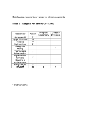 Szkolny plan nauczania w 1-rocznym okresie nauczania Klasa 0 – wstępna, rok szkolny 2011/2012 Przedmioty Kanon Język polski Język francuski Historia Matematyka Geografia Francji Technologia informacyjna Wychowanie fizyczne Godzina z wychowawcą Religia/etyka RAZEM 2 18 1* 2 * średniorocznie Program Godziny rozszerzony Dyrektora 1 1 3 1 2 30 0 1 Szkolny plan nauczania w 3-letnim okresie nauczania Klasa B z rozszerzonym językiem angielskim, matematyką i fizyką Język polski 5 Język angielski 3 Język francuski 2 Historia 2 Wiedza o społeczeństwie Wiedza o kulturze 1 Matematyka 3 Fizyka i 2 astronomia Chemia 1 Biologia 1 Geografia 1 Podstawy 2 przedsiębiorczości Technologia informacyjna Wychowanie 3 fizyczne Przysposobienie 1 obronne Godzina z 1 wychowawcą Religia/etyka 2 Plastyka Wychowanie do życia w rodzinie RAZEM 30 5 3 2 2 2 4 3 2 1 2 1 1 1 3 2 2 1 1 1 14 9 6 5 1 RAZEM 14 14 6 5 5 2 2 3 1 9 3 1 14 5 1 6 3 3 3 1 4 3 3 1 1 1 1 1 2 2 2 1 1 2 2 3 3 9 9 2 2 1 1 1 3 3 2 2 6 1 6 1 0,37 1 1 1,37 84 10 4 98 1 0,37 3 Godziny Dyrektora Program rozszerzony Kanon Godziny Dyrektora razem 1 1 1 Program rozszerzony III rok nauki 2013/2014 Kanon Godziny Dyrektora Program rozszerzony II rok nauki 2012/2013 Kanon Godziny Dyrektora Program rozszerzony Kanon I rok nauki 2011/2012 2,37 29 0,37 5 0,37 25 2 Plastyka - przedmiot dodatkowy obejmujący postawy rysunku architektonicznego Dla chętnych pozalekcyjne zajęcia z rysunku architektonicznego prowadzone przez przedstawicieli Wydziału Architektury PW Szkolny plan nauczania w 3-letnim okresie nauczania Klasa C dwujęzyczna z rozszerzoną matematyką i biologią Język polski 4 Język francuski 6 Język 2 ang/hiszp./wł. Historia 2 Wiedza o społeczeństwie Wiedza o kulturze 1 Matematyka 3 Fizyka i 2 astronomia Chemia 1 Biologia 1 Geografia 1 Podstawy przedsiębiorczości Technologia informacyjna Wychowanie 3 fizyczne Przysposobienie 1 obronne Godzina z 1 wychowawcą Religia/etyka 2 Wychowanie do życia w rodzinie Język łaciński RAZEM 30 1 1 2 RAZEM Godziny Dyrektora* Program rozszerzony 5 6 5 6 14 18 14 18 2 2 6 6 1 2 5 5 1 1 2 2 1 9 3 1 12 4 1 5 3 4 3 1 5 4 9 3 3 1 3 1 1 1 1 2 1 1 1 1 1 1 2 2 2 2 1 1 2 2 3 3 9 9 2 2 1 4 razem Kanon Godziny Dyrektora Program rozszerzony III rok nauki 2013/2014 Kanon Godziny Dyrektora Program rozszerzony II rok nauki 2012/2013 Kanon Godziny Dyrektora Program rozszerzony Kanon I rok nauki 2011/2012 1 1 3 3 2 2 6 6 0,37 0,37 1 1,37 31 1 1,37 32 3 3 0,37 1 1 0,37 93 10 2 3 2 106 *1 godzina dyrektora pozostała na zajęcia pozalekcyjne z chemii lub fizyki Szkolny plan nauczania w 3-letnim okresie nauczania Klasa D z rozszerzonym j. polskim, j. angielskim, historią i wiedzą o kulturze Język polski 4 Język angielski 2 Język francuski 3 Historia 2 Wiedza o społeczeństwie Wiedza o kulturze 1 Matematyka 3 Fizyka i 2 astronomia Chemia 2 Biologia 2 Geografia 1 Podstawy 2 przedsiębiorczości Technologia informacyjna Wychowanie 3 fizyczne Przysposobienie 1 obronne Godzina z 1 wychowawcą Religia/etyka 2 Wychowanie do życia w rodzinie Język łaciński RAZEM 31 1 1 5 2 3 1 1 1 5 2 3 2 2 1 14 6 9 5 1 1 1 1 1 9 3 RAZEM Program rozszerzony Godziny Dyrektora 16 9 9 8 3 2 2 3 9 2 4 4 1 2 1 3 4 3 3 4 3 2 2 2 2 2 3 9 9 2 2 1 3 1 2 2 3 2 1 3 razem Kanon Godziny Dyrektora Program rozszerzony III rok nauki 2013/2014 Kanon Godziny Dyrektora Program rozszerzony II rok nauki 2012/2013 Kanon Godziny Dyrektora Program rozszerzony Kanon I rok nauki 2011/2012 1 1 3 3 2 2 6 6 0,37 0,37 2 2,37 28 1 1,37 25 5 3 0,37 1 1 0,37 84 10 3 4 3 98 Szkolny plan nauczania w 3-letnim okresie nauczania Klasa L dwujęzyczna z rozszerzonym j. polskim, historią i wiedzą o społeczeństwie Język polski 4 Język francuski 6 Język 2 ang/hiszp./włos. Historia 1 Wiedza o społeczeństwie Wiedza o kulturze 1 Matematyka 3 Fizyka i 2 astronomia Chemia 2 Biologia 2 Geografia 1 Podstawy przedsiębiorczości Technologia informacyjna Wychowanie 3 fizyczne Przysposobienie 1 obronne Godzina z 1 wychowawcą Religia/etyka 2 Wychowanie do życia w rodzinie Język łaciński RAZEM 31 1 5 6 1 5 6 2 2 2 2 14 18 2 1 RAZEM Godziny Dyrektora* Program rozszerzony 4 18 18 6 6 2 1 5 4 9 1 1 1 2 1 3 3 3 1 9 1 9 2 4 4 1 1 1 1 1 3 4 3 3 4 3 2 2 2 2 2 2 3 9 9 2 2 3 1 1 1 3 3 2 2 6 6 0,37 3 razem Kanon Godziny Dyrektora Program rozszerzony III rok nauki 2013/2014 Kanon Godziny Dyrektora Program rozszerzony II rok nauki 2012/2013 Kanon Godziny Dyrektora Program rozszerzony Kanon I rok nauki 2011/2012 1 1.37 31 0,37 2 2 2.37 31 0,37 4 0,37 93 9 1 1 3 4 3 106 *1 godzina dyrektora pozostała na zajęcia pozalekcyjne z łaciny w kl. I