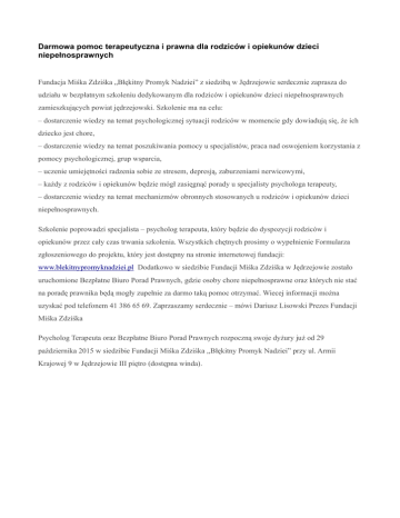 Darmowa pomoc terapeutyczna i prawna dla rodziców i opiekunów dzieci niepełnosprawnych Fundacja Miśka Zdziśka „Błękitny Promyk Nadziei” z siedzibą w Jędrzejowie serdecznie zaprasza do udziału w bezpłatnym szkoleniu dedykowanym dla rodziców i opiekunów dzieci niepełnosprawnych zamieszkujących powiat jędrzejowski. Szkolenie ma na celu: – dostarczenie wiedzy na temat psychologicznej sytuacji rodziców w momencie gdy dowiadują się, że ich dziecko jest chore, – dostarczenie wiedzy na temat poszukiwania pomocy u specjalistów, praca nad oswojeniem korzystania z pomocy psychologicznej, grup wsparcia, – uczenie umiejętności radzenia sobie ze stresem, depresją, zaburzeniami nerwicowymi, – każdy z rodziców i opiekunów będzie mógł zasięgnąć porady u specjalisty psychologa terapeuty, – dostarczenie wiedzy na temat mechanizmów obronnych stosowanych u rodziców i opiekunów dzieci niepełnosprawnych. Szkolenie poprowadzi specjalista – psycholog terapeuta, który będzie do dyspozycji rodziców i opiekunów przez cały czas trwania szkolenia. Wszystkich chętnych prosimy o wypełnienie Formularza zgłoszeniowego do projektu, który jest dostępny na stronie internetowej fundacji: www.blekitnypromyknadziei.pl Dodatkowo w siedzibie Fundacji Miśka Zdziśka w Jędrzejowie zostało uruchomione Bezpłatne Biuro Porad Prawnych, gdzie osoby chore niepełnosprawne oraz których nie stać na poradę prawnika będą mogły zupełnie za darmo taką pomoc otrzymać. Wiecej informacji można uzyskać pod telefonem 41 386 65 69. Zaprzaszamy serdecznie – mówi Dariusz Lisowski Prezes Fundacji Miśka Zdziśka Psycholog Terapeuta oraz Bezpłatne Biuro Porad Prawnych rozpoczną swoje dyżury już od 29 października 2015 w siedzibie Fundacji Miśka Zdziśka ,,Błękitny Promyk Nadziei” przy ul. Armii Krajowej 9 w Jędrzejowie III piętro (dostępna winda). Celem szkolenia jest podniesienie świadomości rodziców, opiekunów w radzeniu sobie w nowej sytuacji poprzez poznanie możliwości w wychowaniu dziecka niepełnosprawnego. Z kolei dzieci niepełnosprawne wskutek poszerzenia kompetencji rodziców, otrzymają z ich strony fachową opiekę, efektywne wsparcie, trafnie dobraną terapię psychologiczną i pedagogiczną. Fundacja chce zaoferować rodzicom spotkania z psychologiem, które pokażą jak radzić sobie z trudnościami edukacyjnymi, wychowawczymi, emocjonalnymi dzieci ze specjalnymi potrzebami Cel szkolenia: Celem głównym zadania jest nabycie przez rodziców i opiekunów dzieci niepełnosprawnych wiedzy i umiejętności w zakresie integracji rodziców dziecka niepełnosprawnego w rodzinie, szkole i otoczeniu. Zadanie realizowane będzie w okresie od października 2015r. do 10.12.2015r. poprzez udział w cyklu szkoleń dla członków rodzin dzieci niepełnosprawnych. Szkolenie prowadzone przez psychologa odbędzie się w dniach: 29.10.15r., 05.11.15r., 18.11.15r., 03.12.15r. w godz. od 9.00-12.00 (łącznie cztery spotkania po 3 godz.).