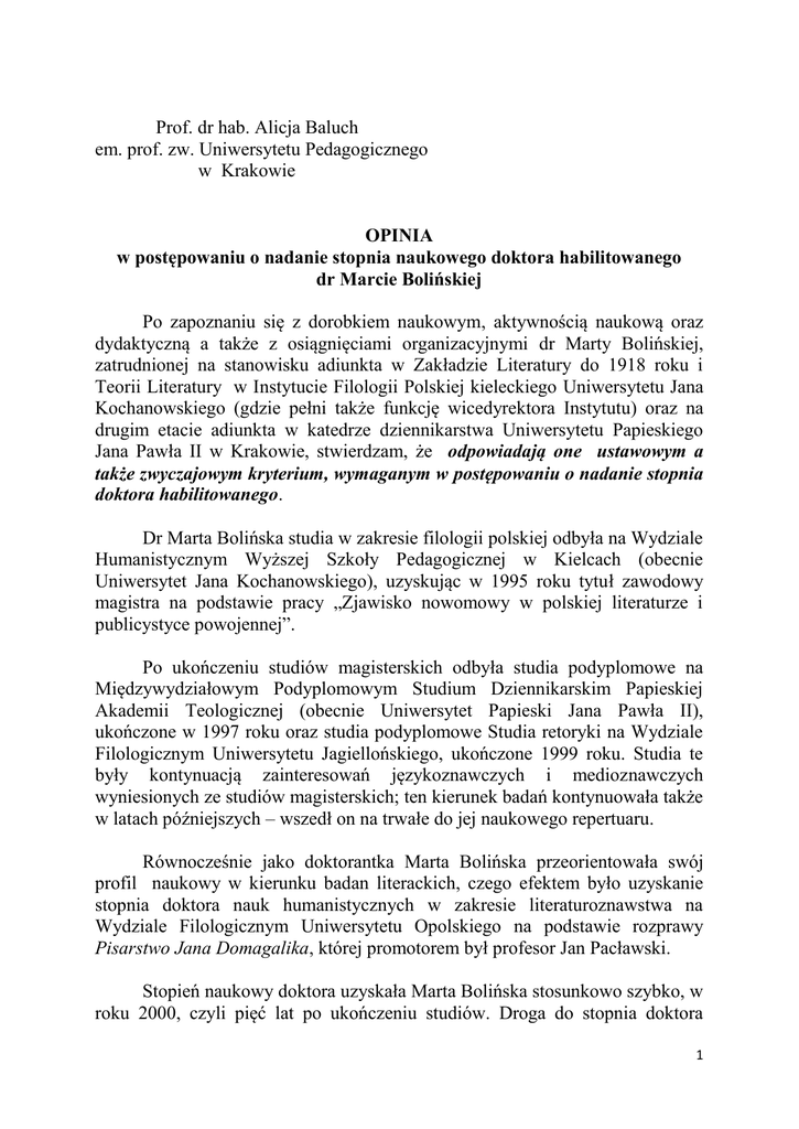 Prof. dr hab. Alicja Baluch em. prof. zw. Uniwersytetu Pedagogicznego w Krakowie OPINIA w postępowaniu o nadanie stopnia naukowego doktora habilitowanego dr Marcie Bolińskiej Po zapoznaniu się z dorobkiem naukowym, aktywnością naukową oraz dydaktyczną a także z osiągnięciami organizacyjnymi dr Marty Bolińskiej, zatrudnionej na stanowisku adiunkta w Zakładzie Literatury do 1918 roku i Teorii Literatury w Instytucie Filologii Polskiej kieleckiego Uniwersytetu Jana Kochanowskiego (gdzie pełni także funkcję wicedyrektora Instytutu) oraz na drugim etacie adiunkta w katedrze dziennikarstwa Uniwersytetu Papieskiego Jana Pawła II w Krakowie, stwierdzam, że odpowiadają one ustawowym a także zwyczajowym kryterium, wymaganym w postępowaniu o nadanie stopnia doktora habilitowanego. Dr Marta Bolińska studia w zakresie filologii polskiej odbyła na Wydziale Humanistycznym Wyższej Szkoły Pedagogicznej w Kielcach (obecnie Uniwersytet Jana Kochanowskiego), uzyskując w 1995 roku tytuł zawodowy magistra na podstawie pracy „Zjawisko nowomowy w polskiej literaturze i publicystyce powojennej”. Po ukończeniu studiów magisterskich odbyła studia podyplomowe na Międzywydziałowym Podyplomowym Studium Dziennikarskim Papieskiej Akademii Teologicznej (obecnie Uniwersytet Papieski Jana Pawła II), ukończone w 1997 roku oraz studia podyplomowe Studia retoryki na Wydziale Filologicznym Uniwersytetu Jagiellońskiego, ukończone 1999 roku. Studia te były kontynuacją zainteresowań językoznawczych i medioznawczych wyniesionych ze studiów magisterskich; ten kierunek badań kontynuowała także w latach późniejszych – wszedł on na trwałe do jej naukowego repertuaru. Równocześnie jako doktorantka Marta Bolińska przeorientowała swój profil naukowy w kierunku badan literackich, czego efektem było uzyskanie stopnia doktora nauk humanistycznych w zakresie literaturoznawstwa na Wydziale Filologicznym Uniwersytetu Opolskiego na podstawie rozprawy Pisarstwo Jana Domagalika, której promotorem był profesor Jan Pacławski. Stopień naukowy doktora uzyskała Marta Bolińska stosunkowo szybko, w roku 2000, czyli pięć lat po ukończeniu studiów. Droga do stopnia doktora 1 habilitowanego okazała się dłuższa – wkroczyła na nią dr Marta Bolińska po kolejnych 14 latach intensywnej i wielokierunkowej pracy naukowej. Bowiem po uzyskaniu stopnia doktora odbyła kolejne studia kwalifikacyjne: Psychospołeczne strategie kierowania i zarządzania zasobami ludzkimi w Akademii Pedagogicznej w Krakowie (obecnie Uniwersytet Pedagogiczny), ukończone w 2007 roku, oraz Wiedza o kulturze na Wydziale Polonistyki UJ, ukończone w 2008 roku. Jest rzeczą charakterystyczną, że przedstawiając jako osiągnięcie naukowe rozprawę. Zdarzenia niepunktualne. Biograficzny i antropologicznokulturowy kontekst opowieści o biegu ludzkiego życia w prozie Doroty Terakowskiej (2013) weszła na nowy dla niej teren badawczy – związku literatury z psychologią i antropologią kulturową (opierając się na badaniach z zakresu psychologii rozwojowej takich badaczy jak H.Bee, A. Brzezińska, H.R.Schaffer, J. Trempała). Po raz kolejny podjęła temat z zakresu literatury dziecięcej i młodzieżowej nie wchodząc jednak bliżej do środowiska naukowego zajmującego się tą problematyką. Po uzyskaniu stopnia doktora, zainteresowania naukowe Habilitantki skoncentrowały się na kilku kręgach tematycznych: pierwszy to literatura współczesna, drugi koncepcja dziecka i dzieciństwa, trzeci wiedza o mediach i kulturze. Zaowocowały one licznymi rozprawami naukowymi; po uzyskaniu stopnia doktora nauk humanistycznych Marta Bolińska opublikowała: 4 monografie, 1 podręcznik akademicki, 3 tomy współredagowane, 27 rozdziałów w monografiach, 2 teksty w czasopismach zagranicznych, 17 artykułów w krajowych czasopismach recenzowanych, 26 tekstów dydaktycznopopularyzatorskich, 2 przedmowy, 2 hasła słownikowe oraz 1 recenzję krytyczną. Dorobek ten należy ocenić jako znaczny. Do tych osiągnięć naukowych trzeba dodać udział Marty Bolińskiej w projektach badawczych, międzynarodowych i krajowych, takich jak Leonardo da Vinci-Multilateral Project czyli w międzynarodowym projekcie naukowym e-learnigowym z zakresu mediacji kulturowych TIPS. Wzięło w nim udział 5 krajów europejskich – Austria, Grecja, Francja, Włochy i Polska. W ramach tego projektu Marta Bolińska opublikowała trzy programy, wśród nich Szkolenia dla mediatorów kulturowych z wykorzystaniem narzędzi WEB 2,0, oraz w ramach Świętokrzyskiego Systemu Wspierania Talentów – Kreatywność w edukacji humanistycznej adresowany do uczniów szkół podstawowych. W ramach działu „Kapitał ludzki” UE (2013-2014) a w nim kursu czytania kierunkowego Marta Bolińska zaproponowała program – Analiza i interpretacja tekstów literackich z przekładem intersemiotycznym. 2 Ważne są też jej osiągnięcia w zakresie popularyzacji nauki lub sztuki (pojawia się tu m.in. różnorodna tematyka: Komunikowanie z mediami w praktyce, Audiodeskrypcja, Formy terapii edukacyjnej, Warsztaty z zakresu sztuki wystąpień publicznych, Kreatywność w edukacji humanistycznej, Praca z uczniem zdolnym…itd.) W ocenie należy zwrócić uwagę na aktywność konferencyjną Habilitantki. Liczba konferencji w których wzięła udział jest duża (30), ale ich zasięg geograficzny (środowiskowy) jest ograniczony: centrum stanowią Kielce i ich południowo-wschodnie sąsiedztwo ( Rzeszów, Lublin, Kraków, Katowice, dwukrotna obecność w Kijowie). Pewnym zaskoczeniem jest stosunkowo słaby udział w konferencjach organizowanych przez środowisko badaczy literatury dla dzieci i młodzieży. Habilitantka pisała przecież nie tylko o Domagaliku; w jej publikacjach mieści się wiele artykułów podejmujących tematy książki dziecięcej i ich autorów. W tym środowisku pokazywała się Habilitantka rzadko (stąd brak cytowań i grantów). Ostatnio, w 